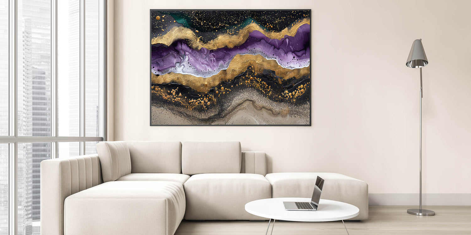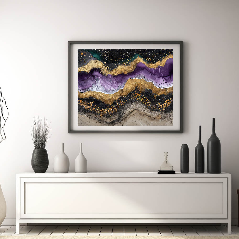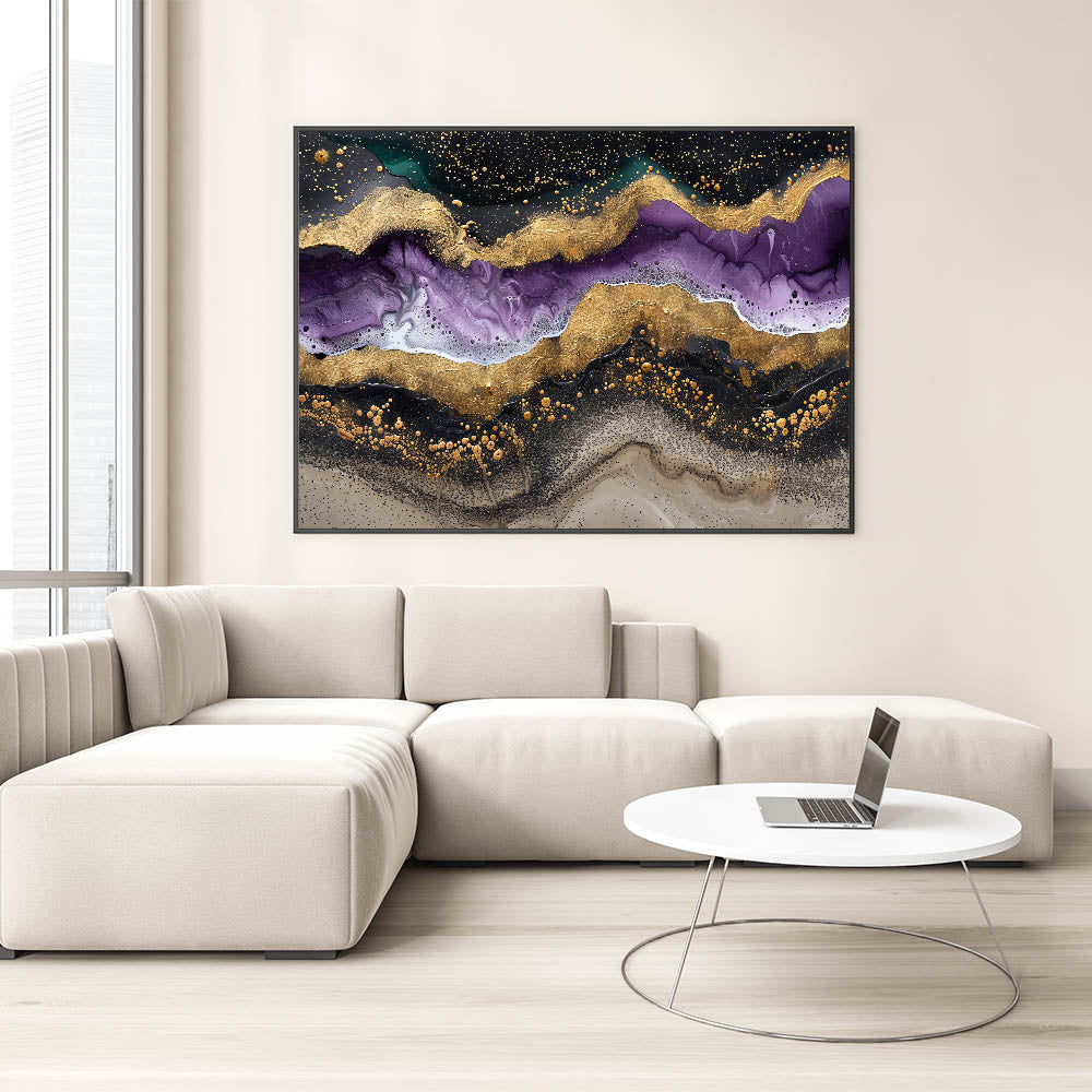 Add a touch of luxury and abstract beauty to your space with this stunning Nature Closeups Wall Art. This piece combines flowing layers of purple, gold, and black with delicate textures that evoke the fluidity of nature. The metallic gold accents shimmer against the bold dark hues, making it a perfect focal point for modern and contemporary home decor.