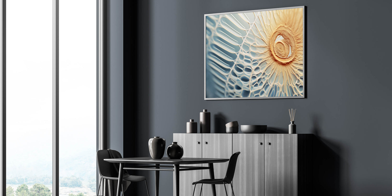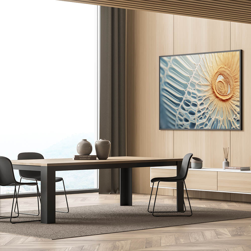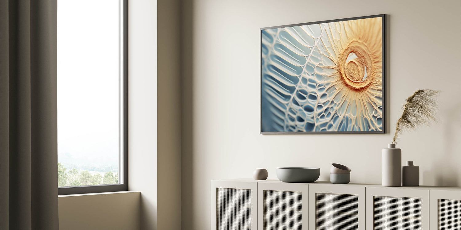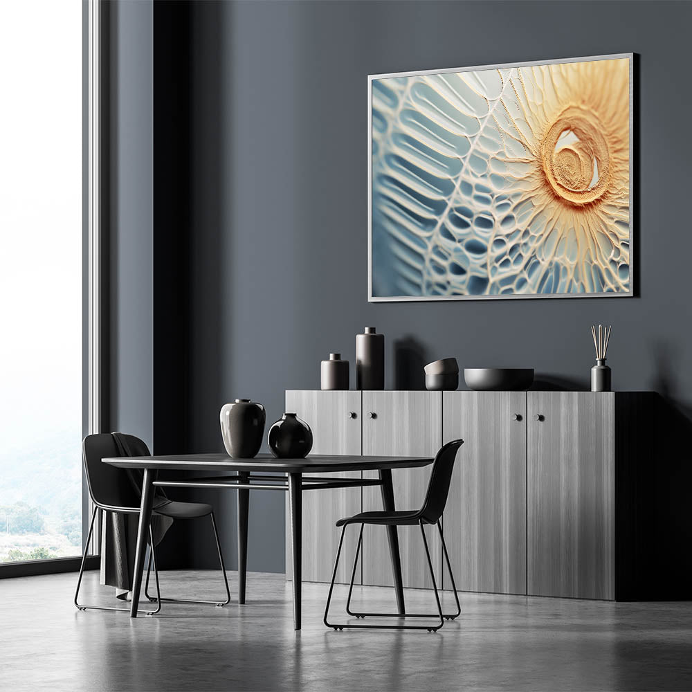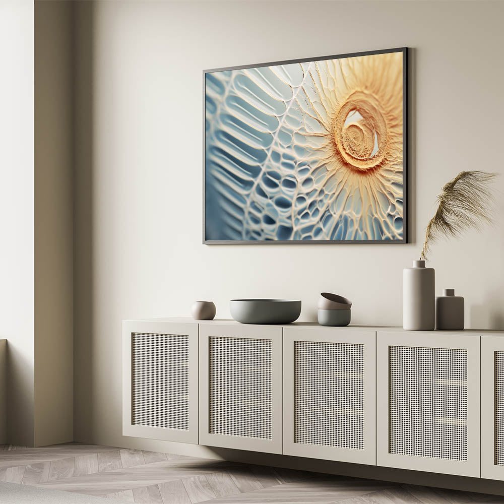 Elevate your space with this striking close-up of an abstract organic structure. The intricate web-like pattern, blending soft beige and pale blue tones, creates a harmonious and tranquil visual. This piece captures the essence of natural design, making it ideal for modern, minimalist, or nature-inspired interiors. The delicate lines radiating from the center evoke a sense of balance and flow, bringing a calming atmosphere to any room.