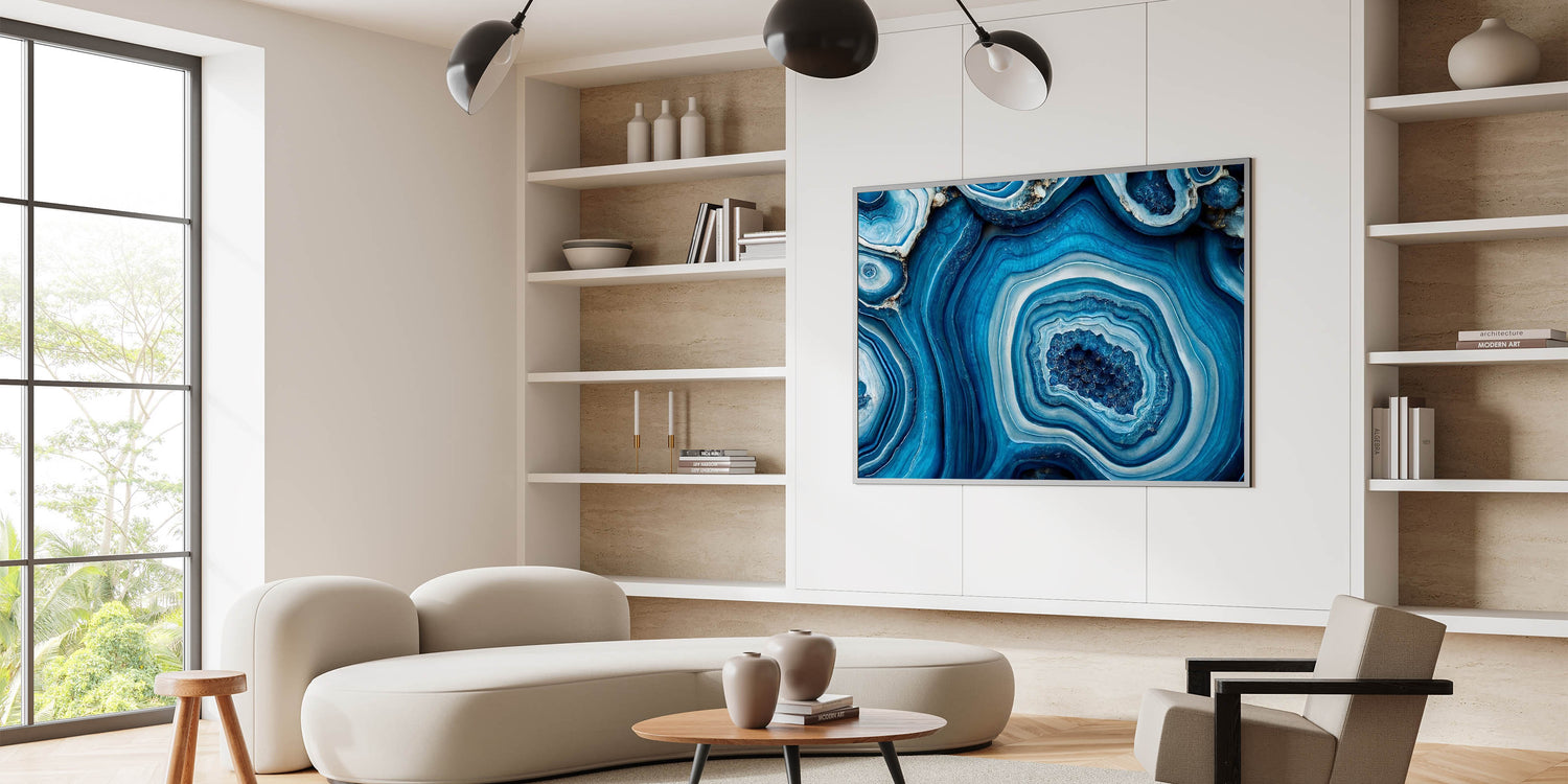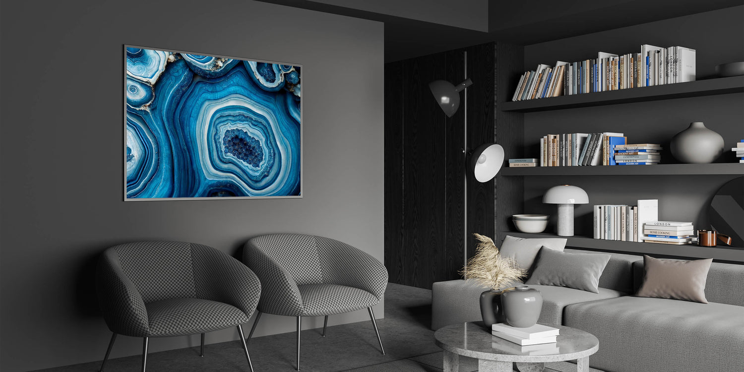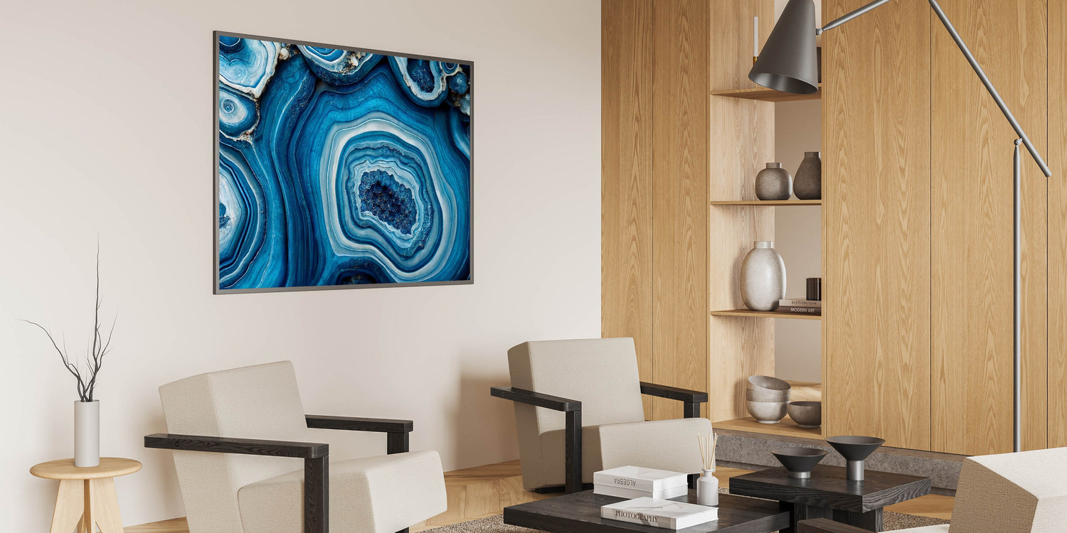 This blue geode close-up is more than just a piece of wall art—it’s a natural masterpiece that will elevate the aesthetic of any home. Let the calming blues bring tranquility and sophistication to your space.