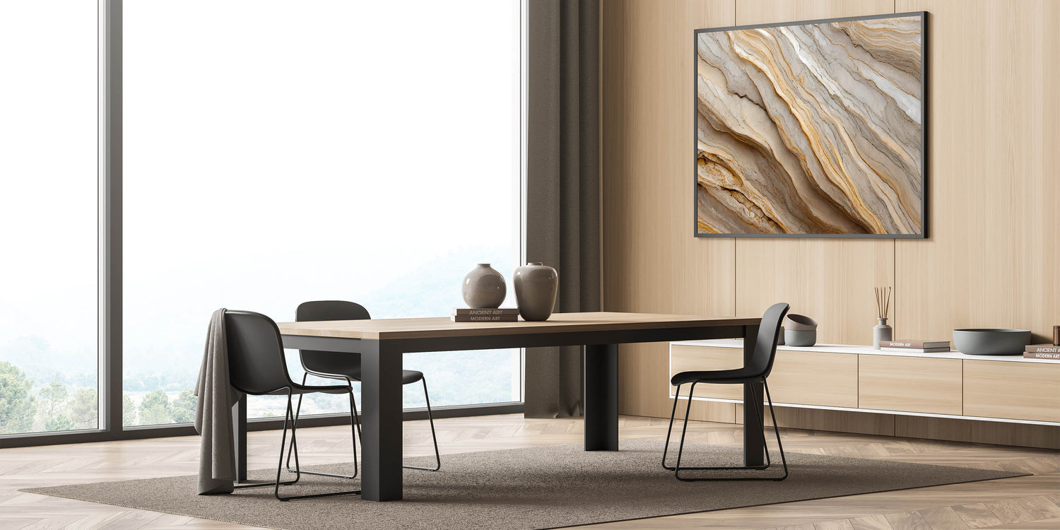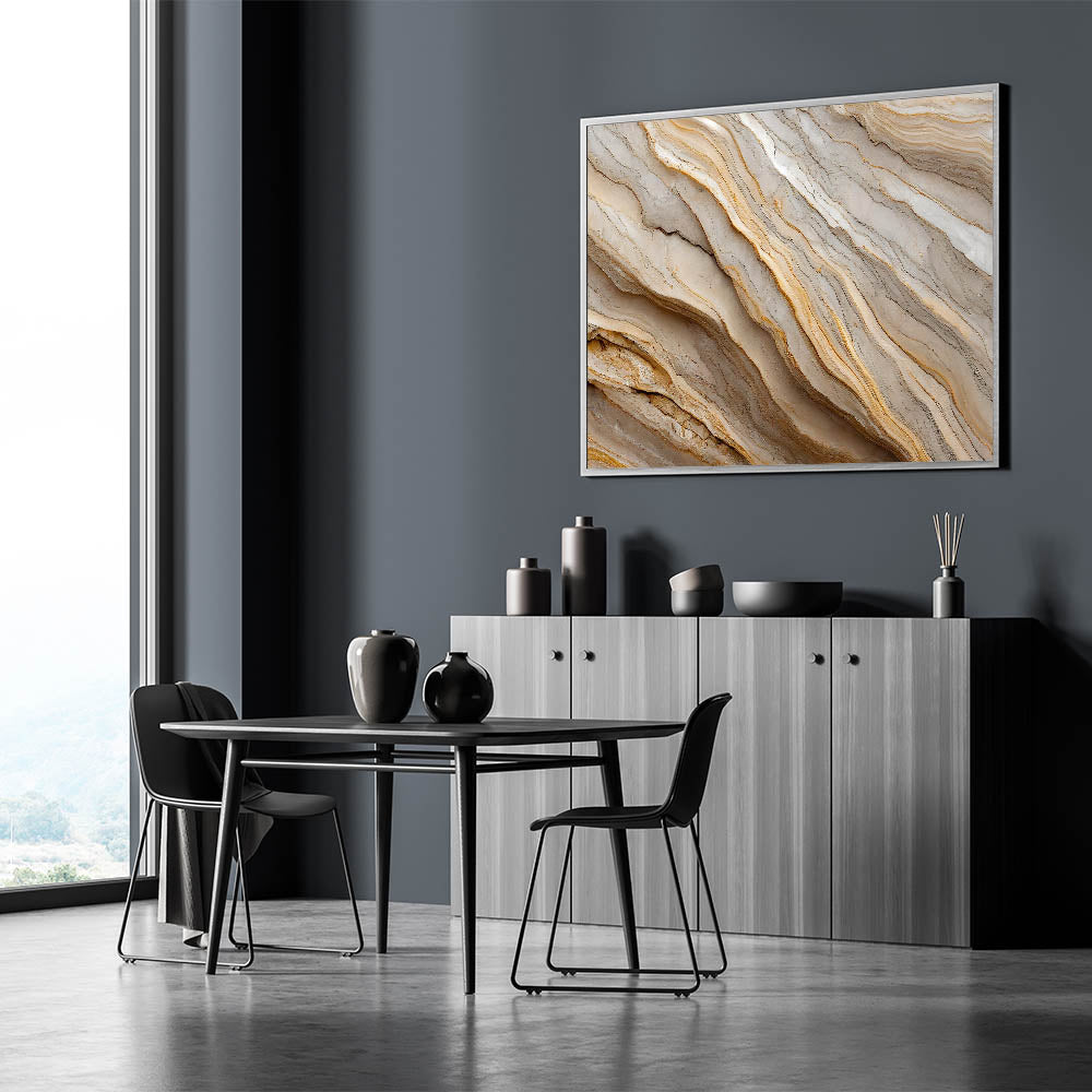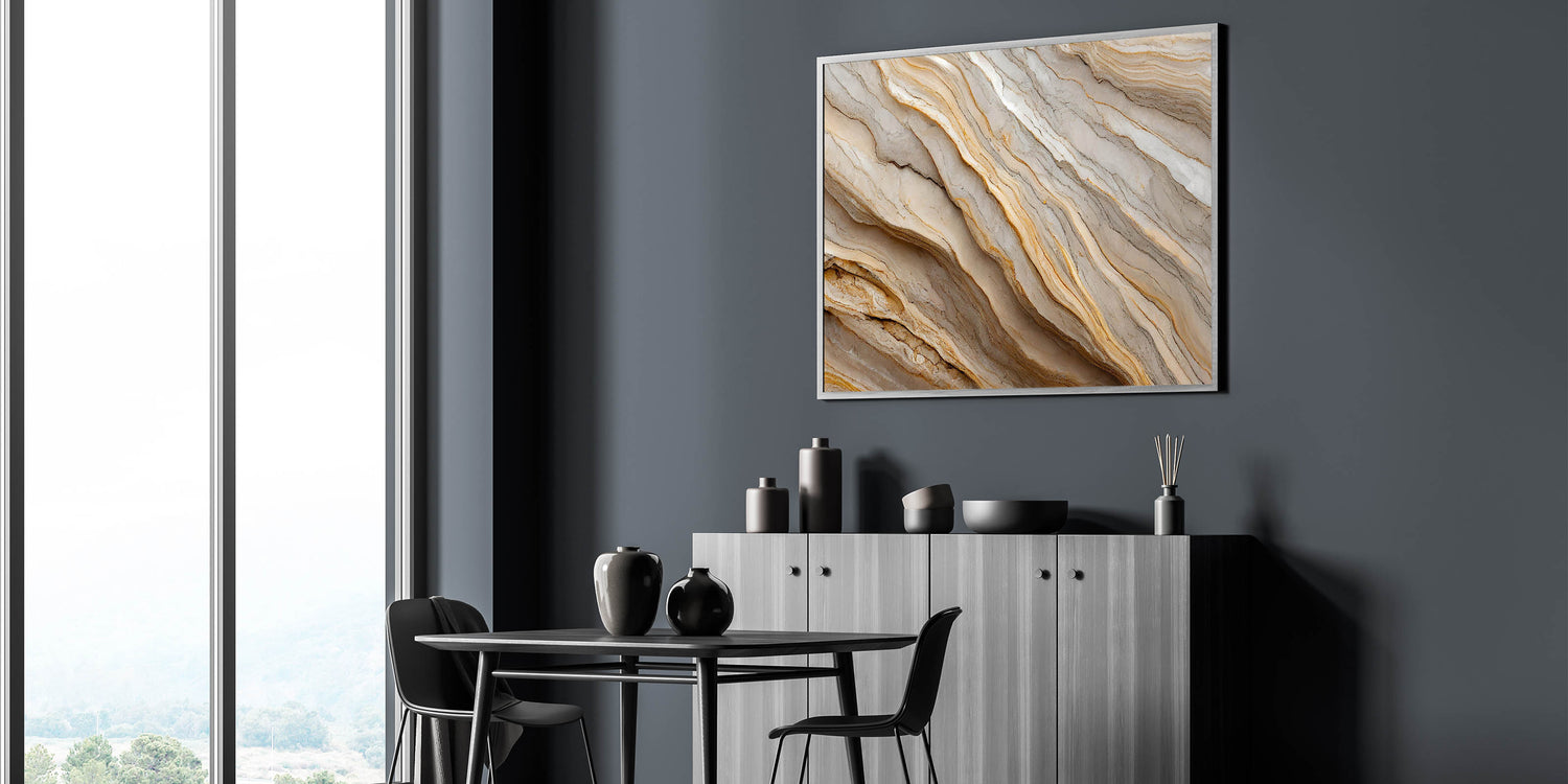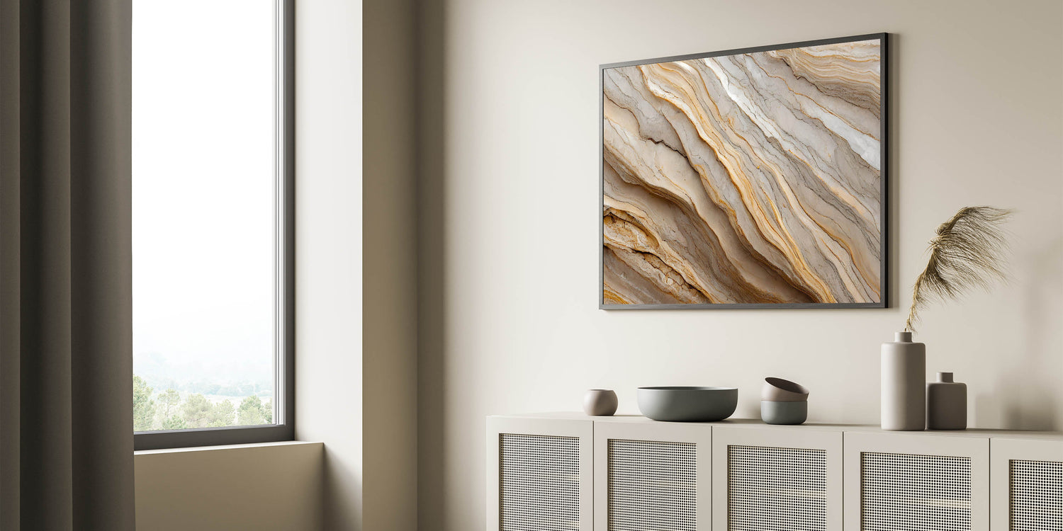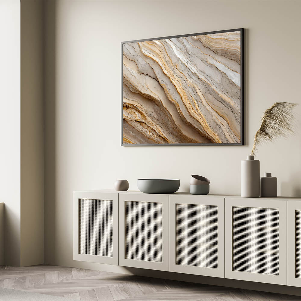 • High-quality print that highlights the natural layers and textures of rock formations in neutral tones.