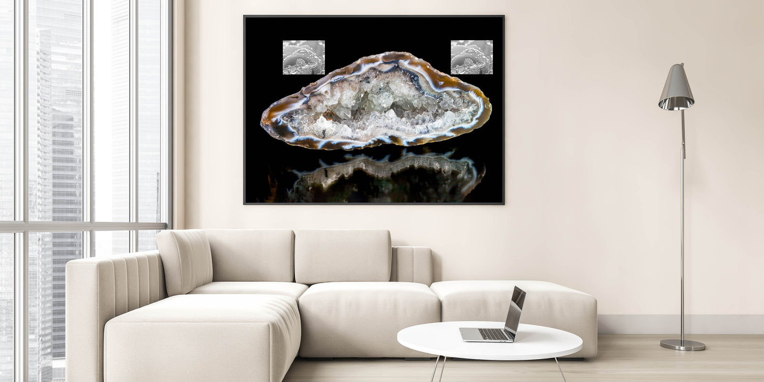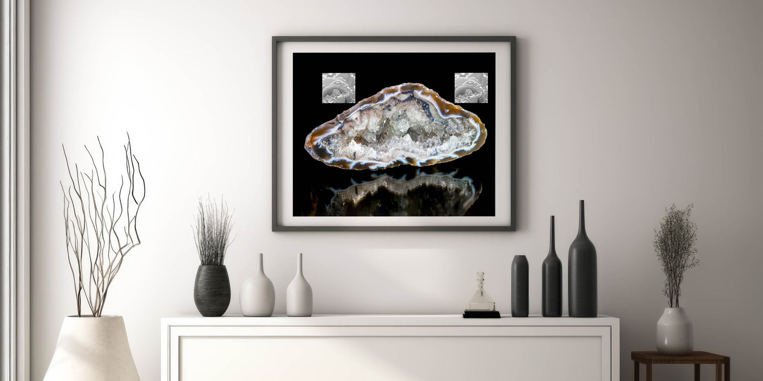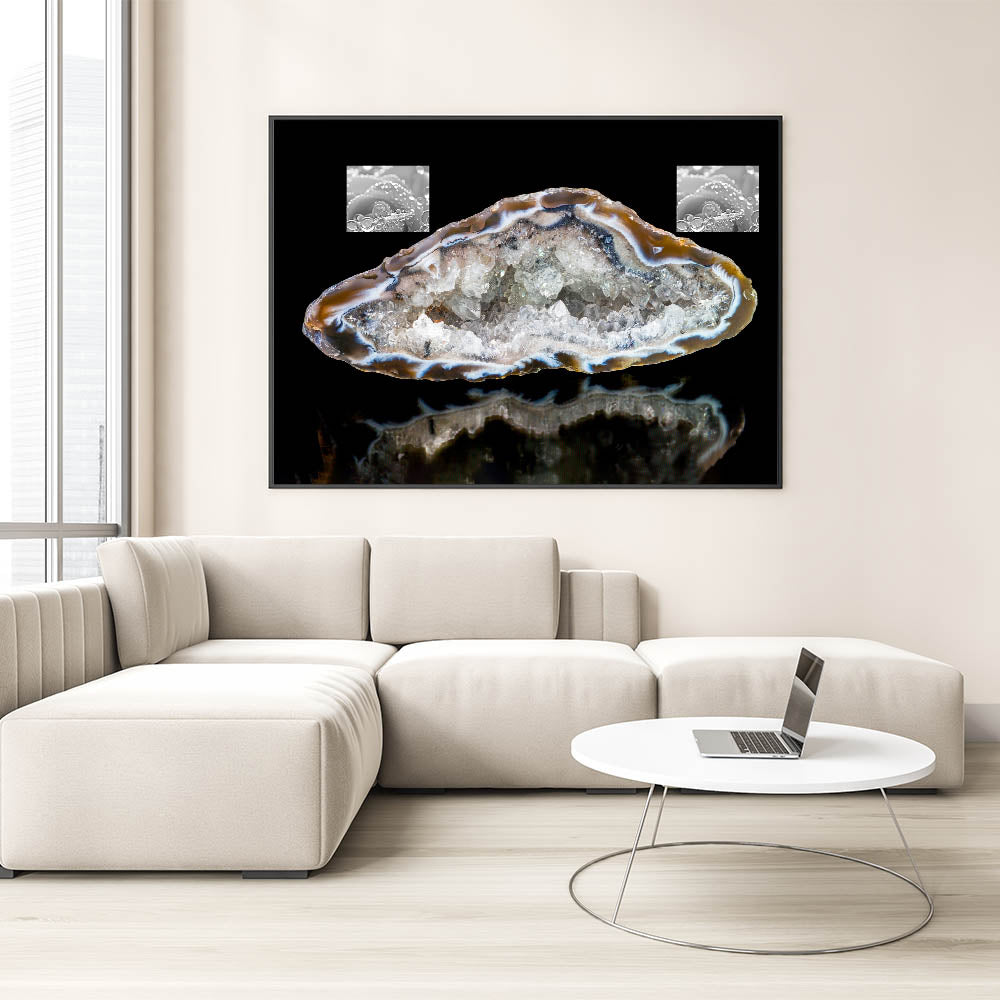 This geode crystal art piece adds a touch of natural sophistication to any room, from living rooms to offices. Whether framed or in canvas, this artwork brings a sense of organic beauty into your space.