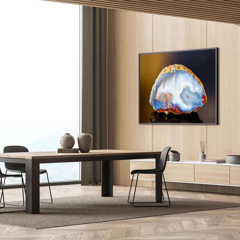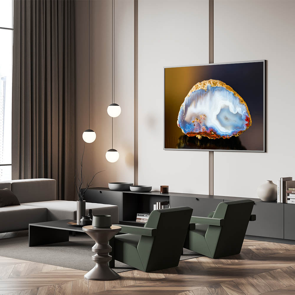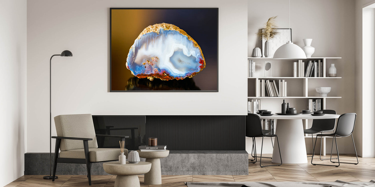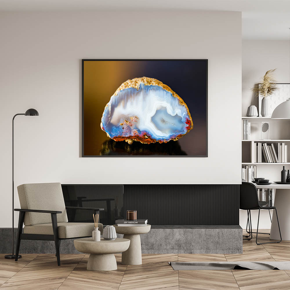Introduce a touch of natural luxury to your home with this stunning close-up of a polished geode. The mesmerizing layers of blue, white, and amber tones bring an air of sophistication and organic beauty to your living space. Part of our "Natural Elements" collection, this nature-inspired art captures the elegance of geological formations, making it perfect for modern or rustic home decor.