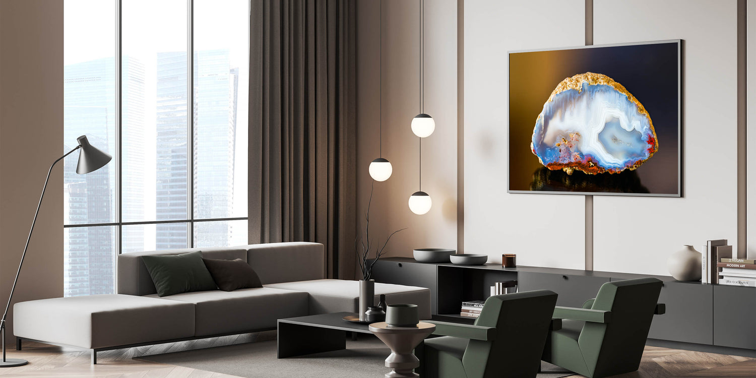 - Stretched and framed canvas prints of natural elements for modern interiors.