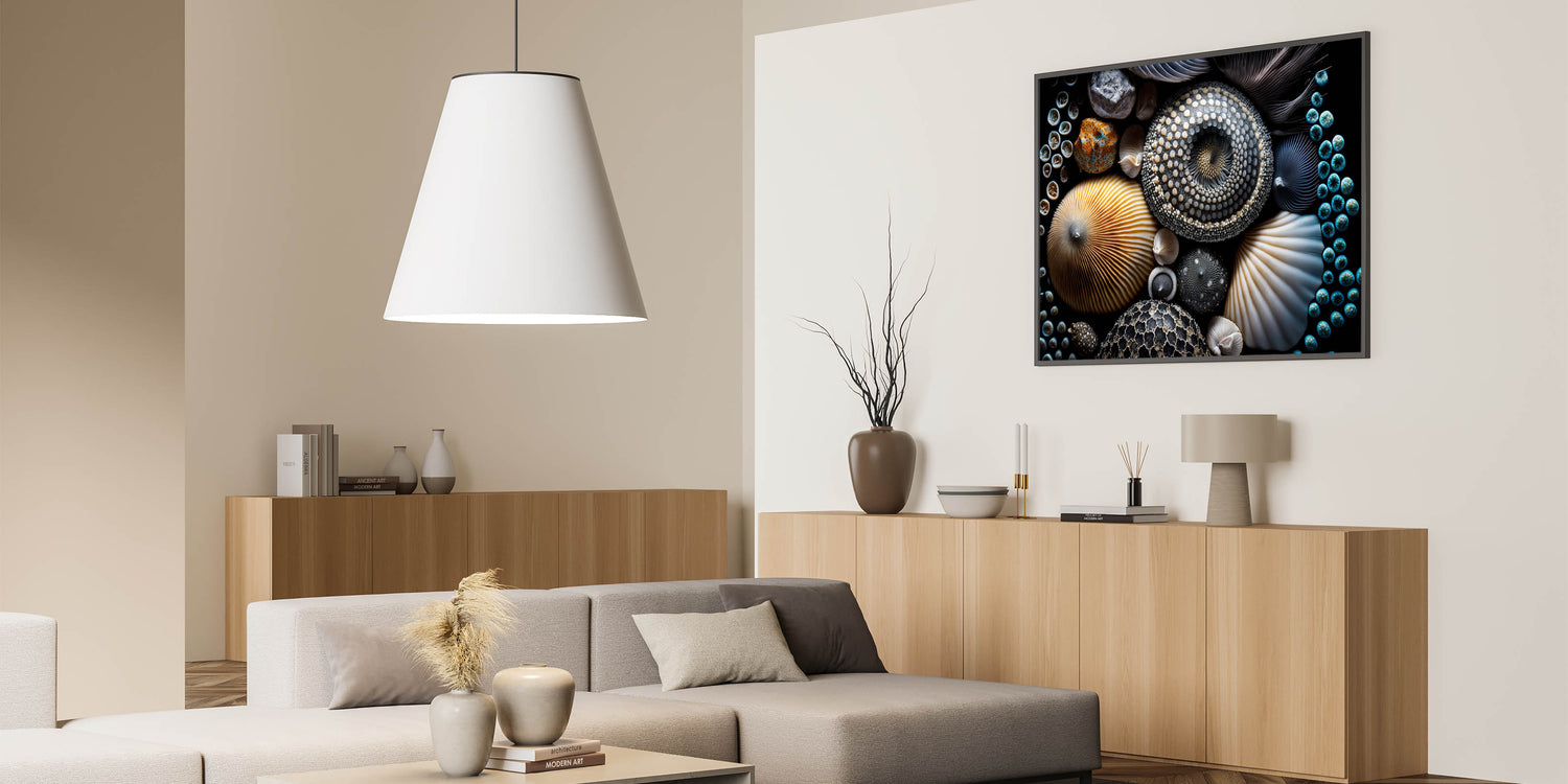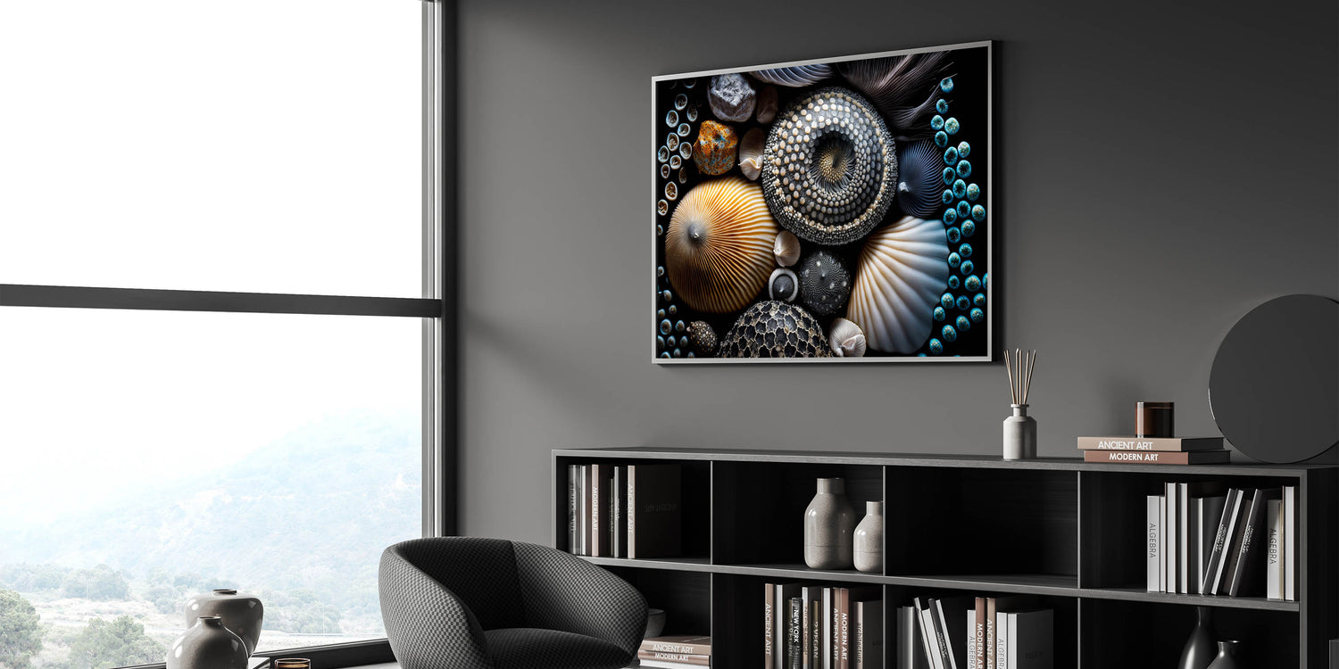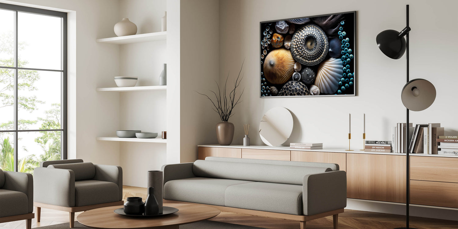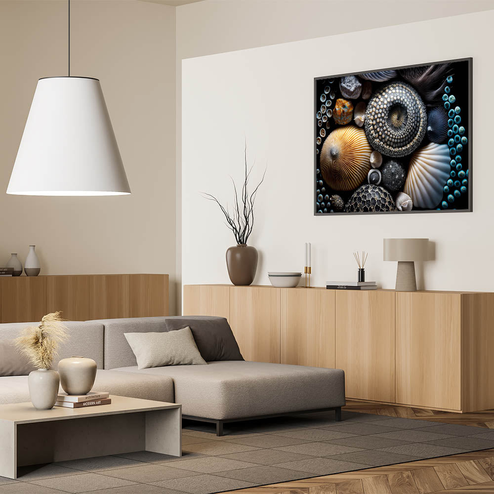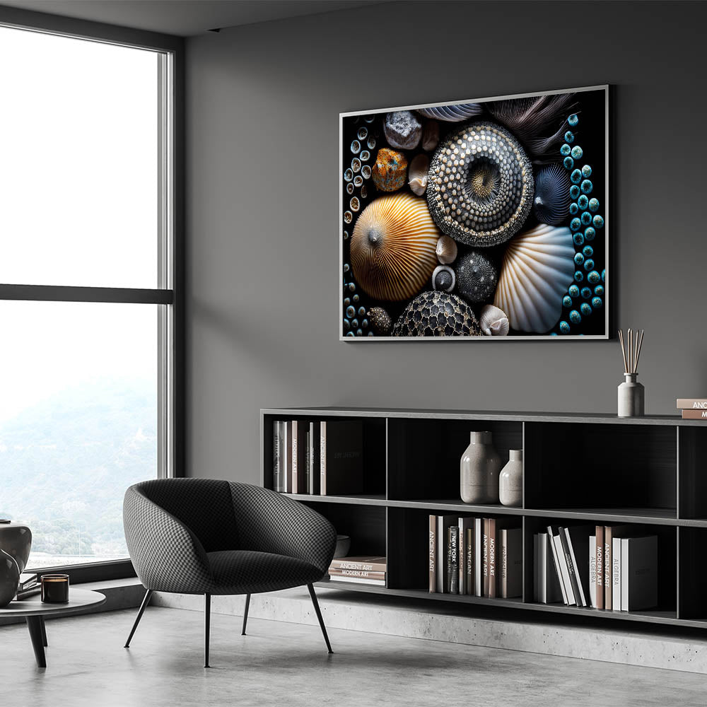 Immerse yourself in the captivating beauty of the ocean with this intricate close-up of a seashell collection. The detailed patterns and natural textures of various seashells create a visually stunning piece of art that blends organic shapes with modern elegance. The combination of soft cream, blue, and beige tones makes this wall art a perfect accent for any coastal-themed or modern minimalist space.