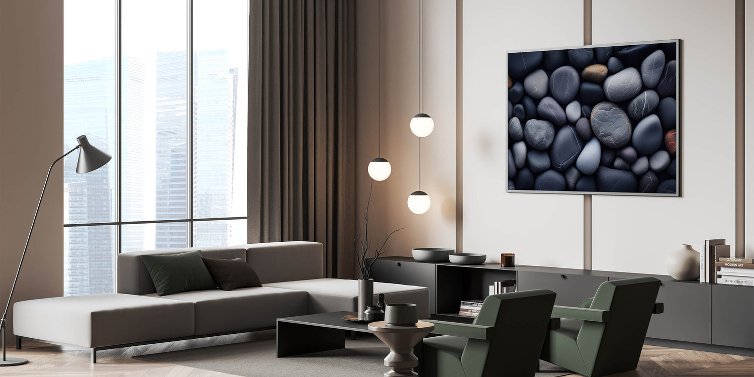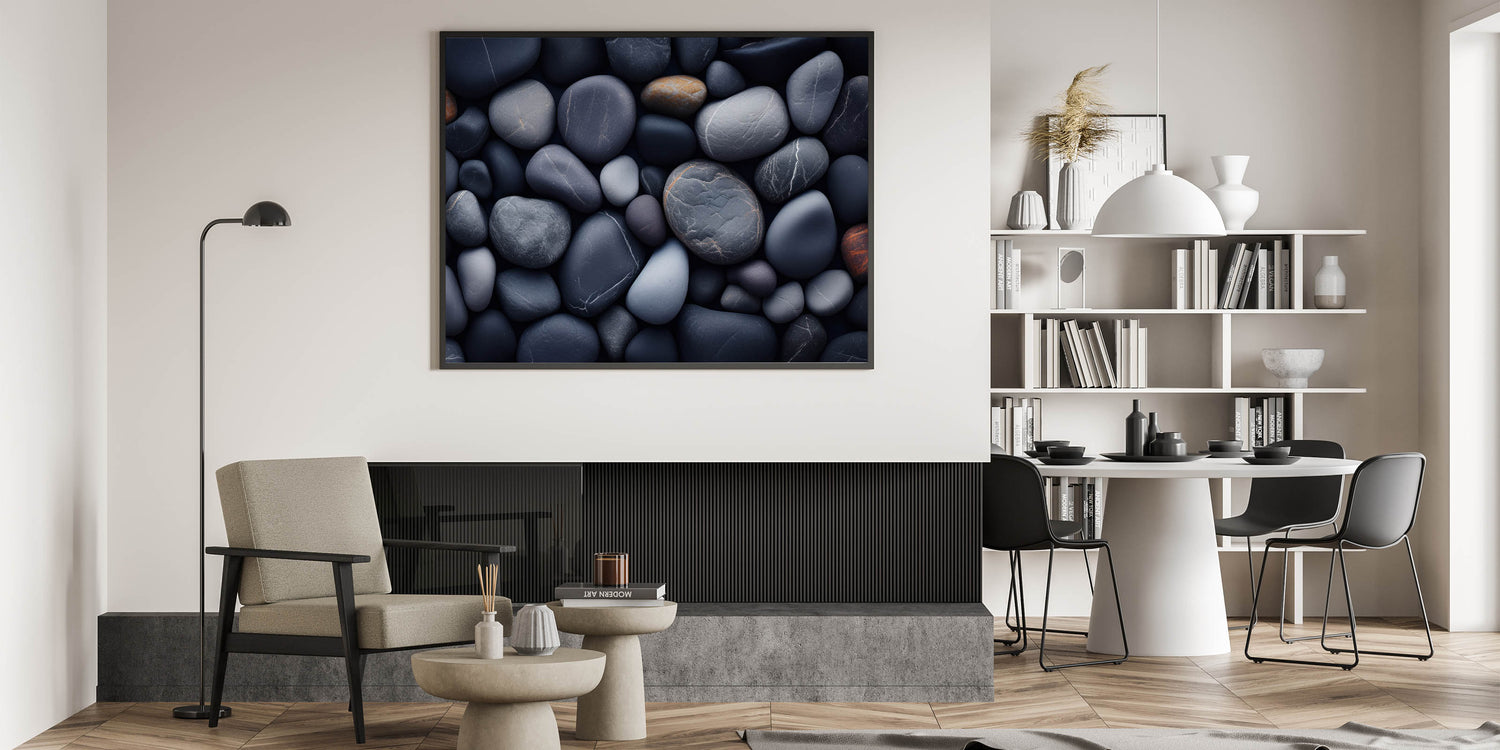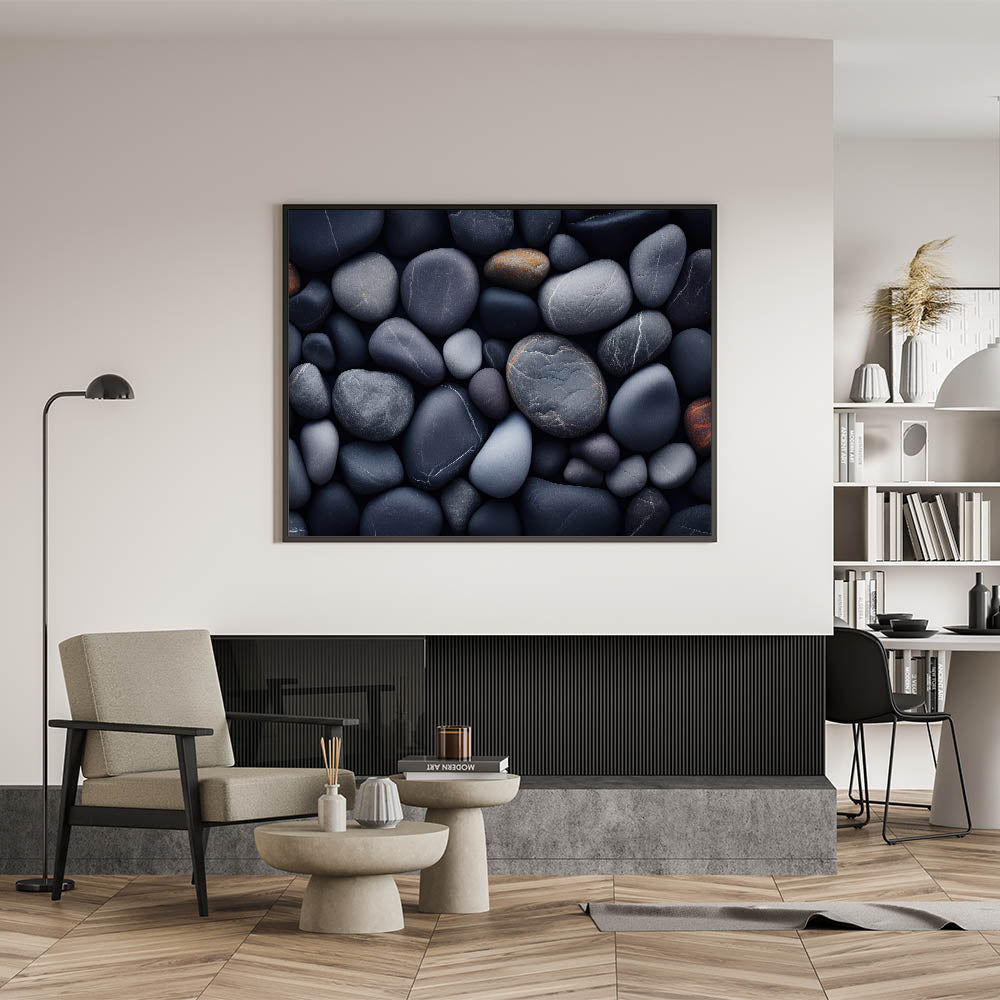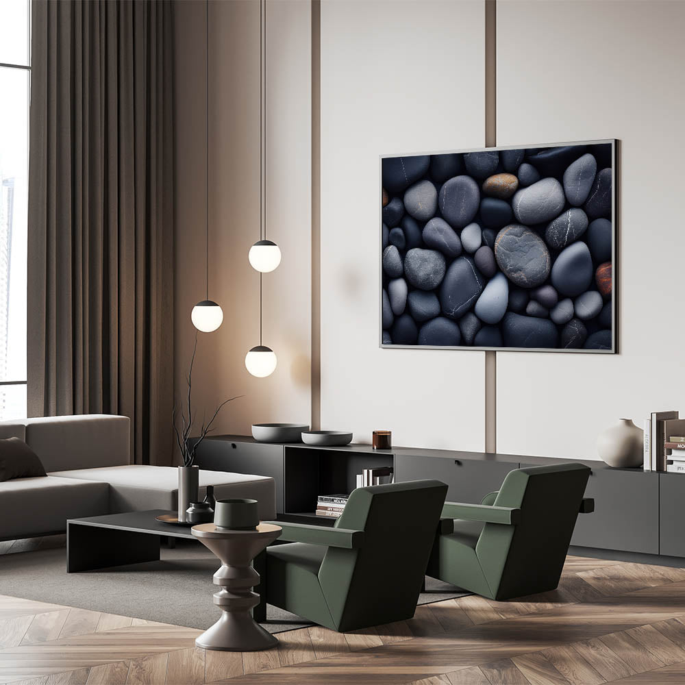 Create a serene and grounded atmosphere in your home with this stunning close-up of smooth river pebbles. The deep shades of gray, navy, and earthy browns combine to form a calming composition that draws inspiration from nature’s peaceful riversides. Each pebble's natural texture and soft, rounded edges create an aesthetically pleasing and tranquil visual, making it perfect for modern, minimalist, or nature-inspired interiors.