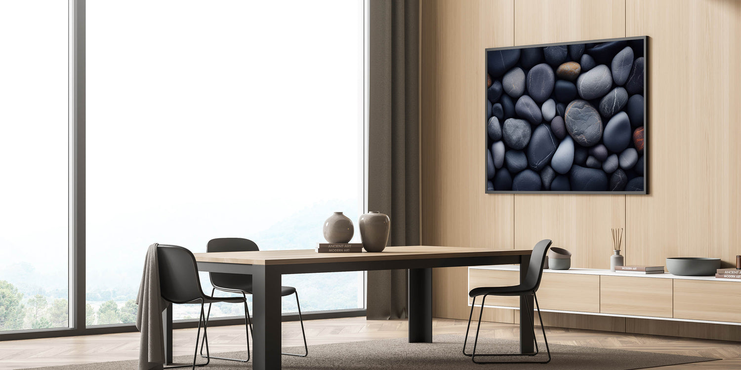 This pebble close-up wall art brings the calming energy of natural elements indoors. The combination of rich, dark tones and organic shapes makes it a versatile piece that complements any decor while adding a sense of tranquility.
