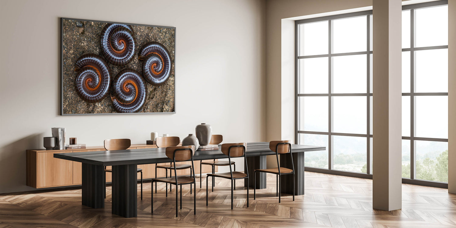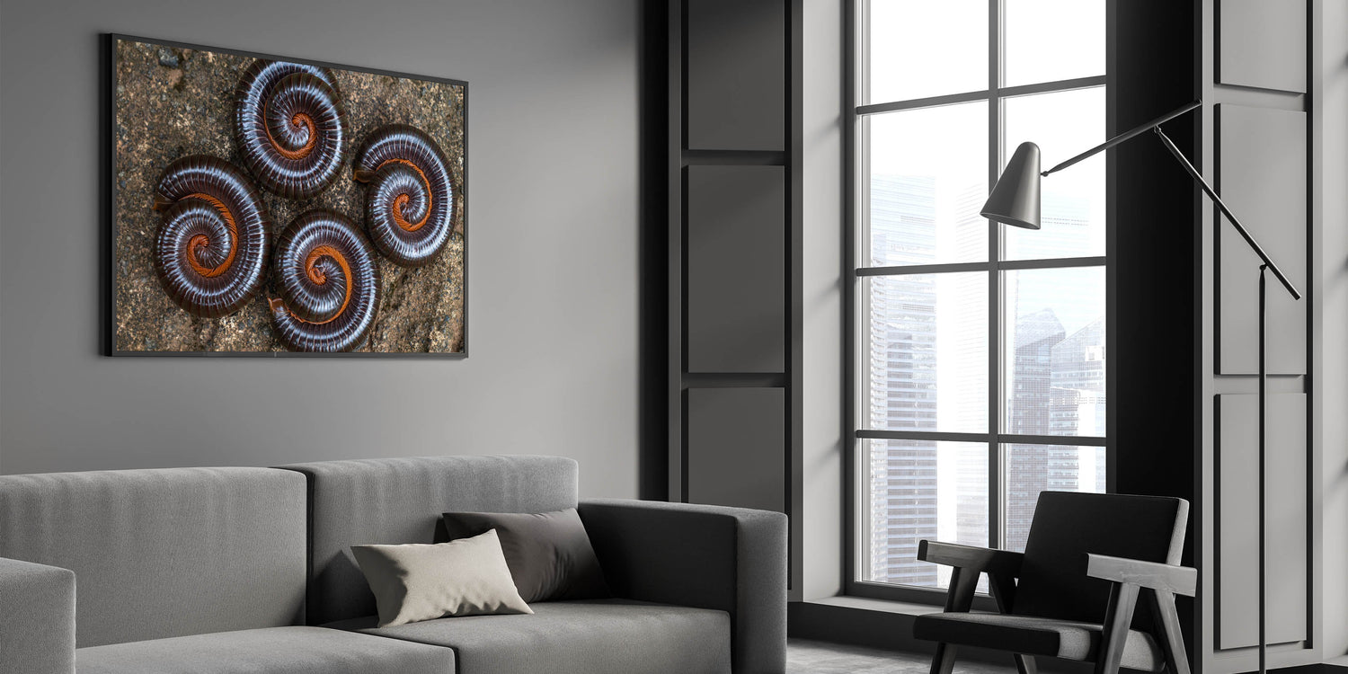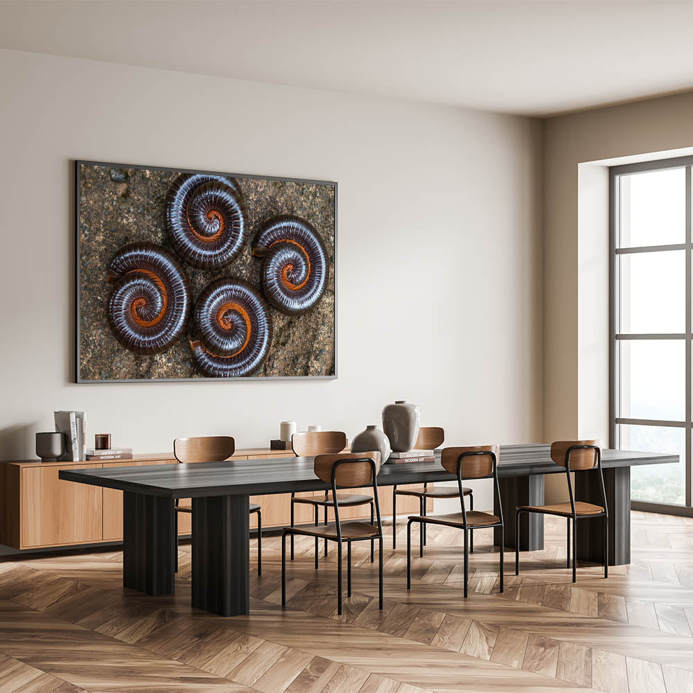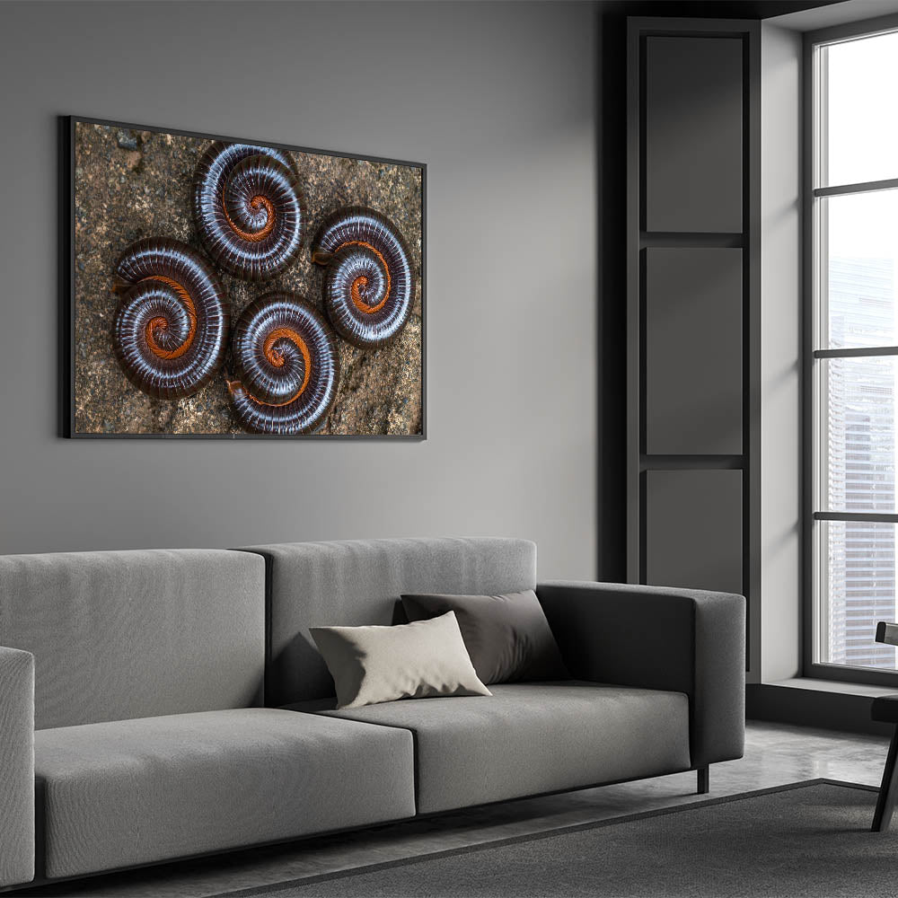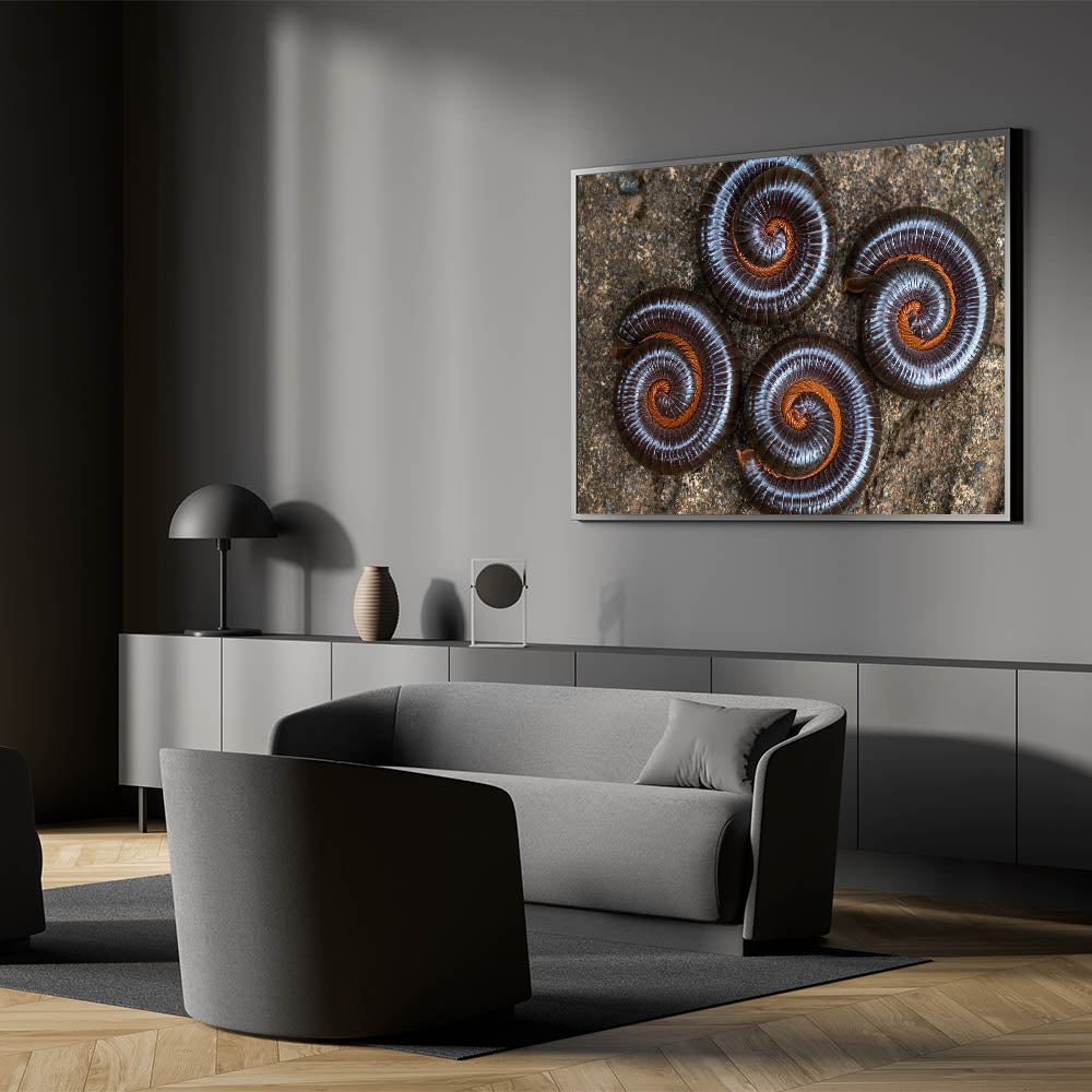 Capture the fascinating patterns of nature with this striking close-up photograph of spiraled insects, showcasing the intricate beauty of natural elements. The detailed symmetry of these curled millipedes against the earthy backdrop creates a stunning visual display, perfect for nature enthusiasts or those seeking a unique piece of wall decor. The deep brown tones contrast beautifully with the rustic textures, making it an ideal addition to any modern or natural-themed room.
