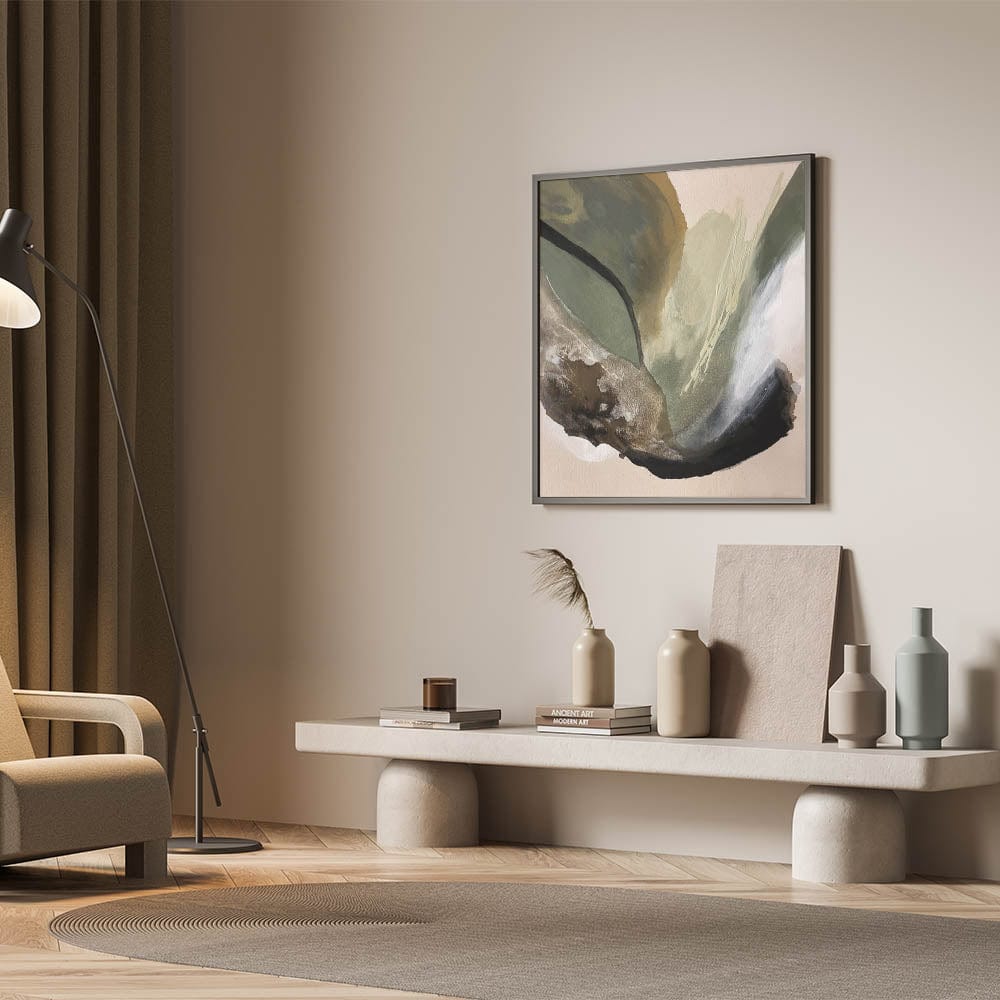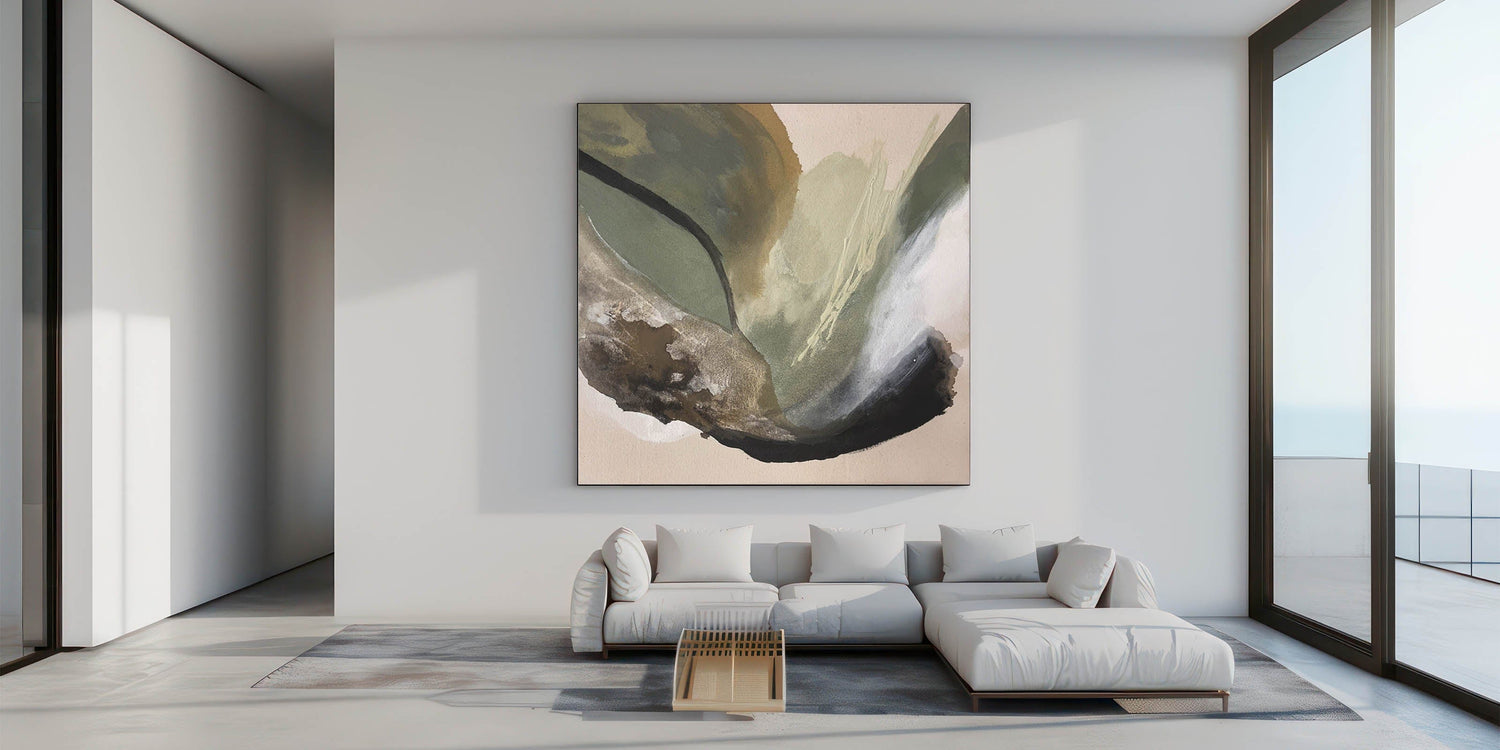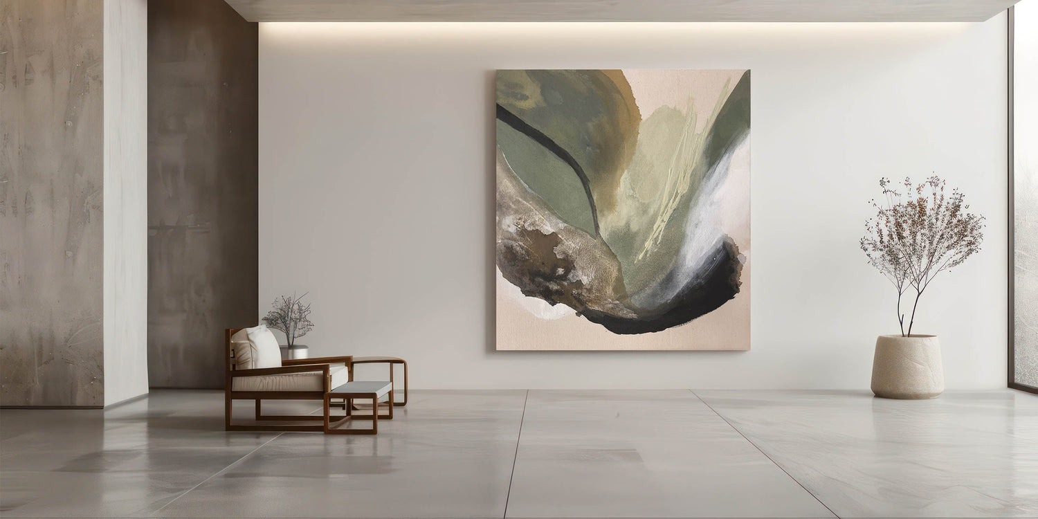Immerse your space in the calming essence of nature with this modern abstract painting, featuring an organic blend of olive green, beige, black, and deep brown. The fluid movement and rich textures create a moody yet sophisticated atmosphere, making this abstract canvas wall art perfect for contemporary interiors.