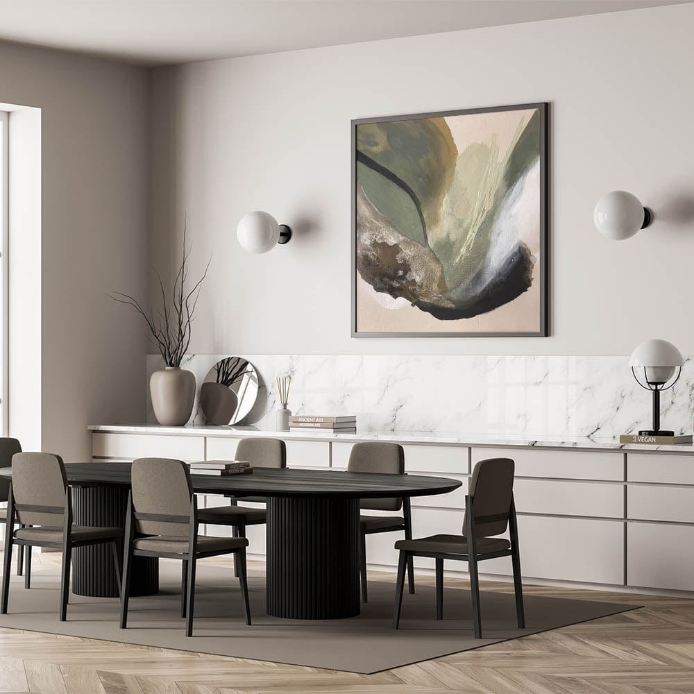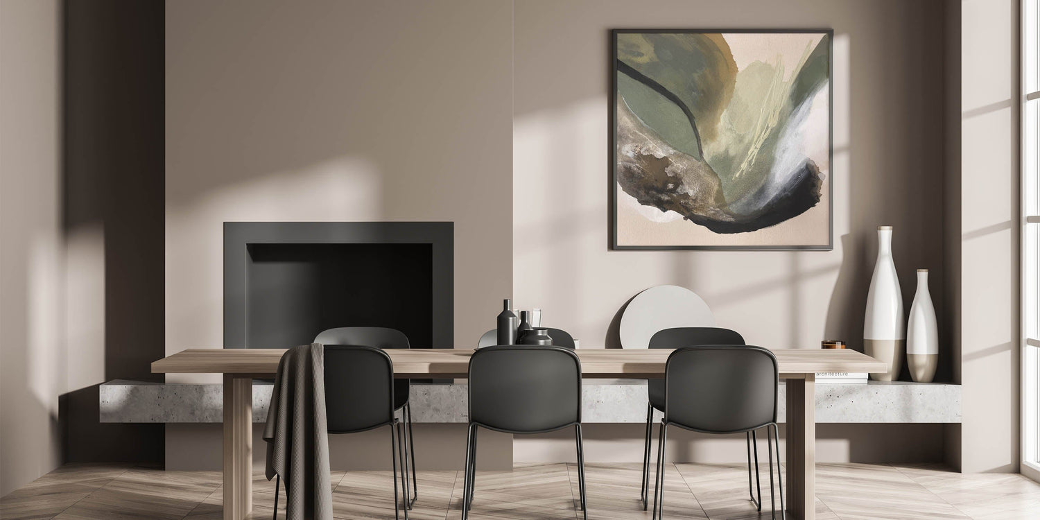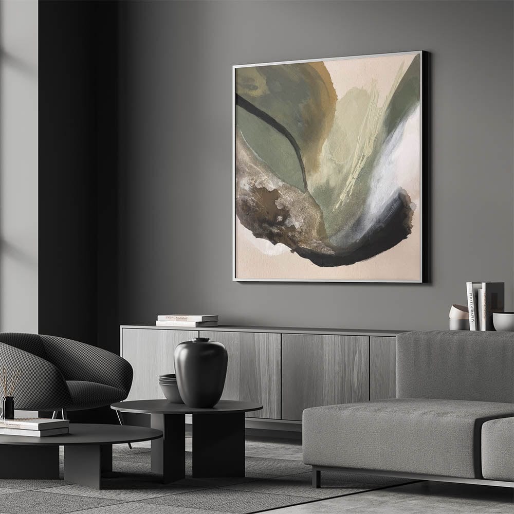 Immerse your space in the calming essence of nature with this modern abstract painting, featuring an organic blend of olive green, beige, black, and deep brown. The fluid movement and rich textures create a moody yet sophisticated atmosphere, making this abstract canvas wall art perfect for contemporary interiors.