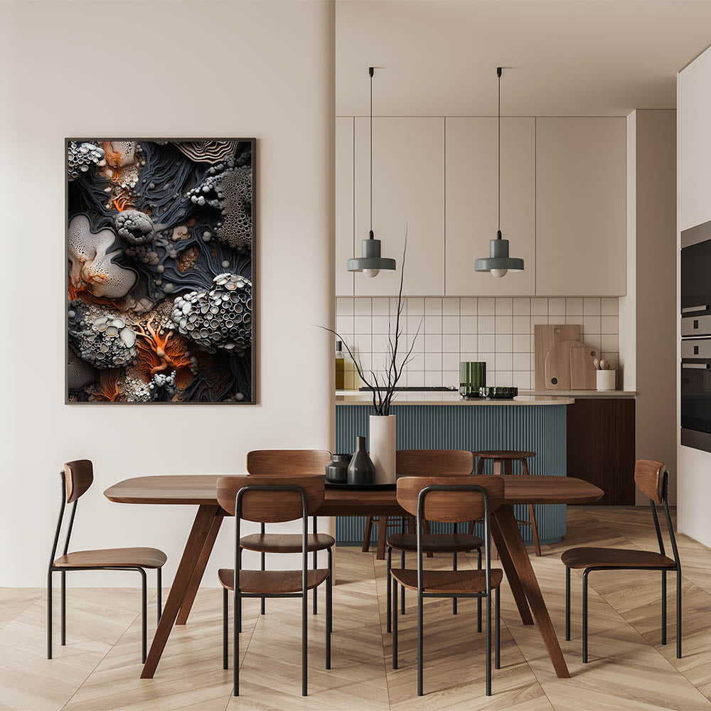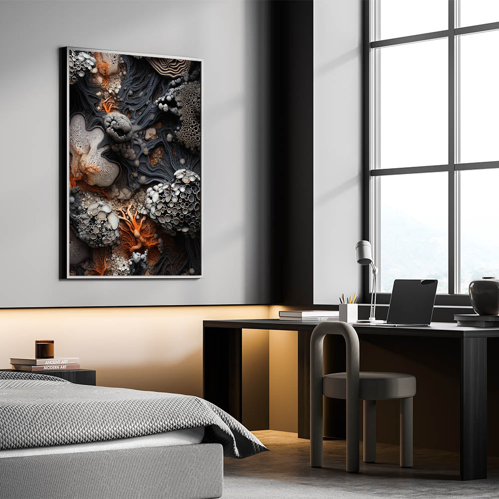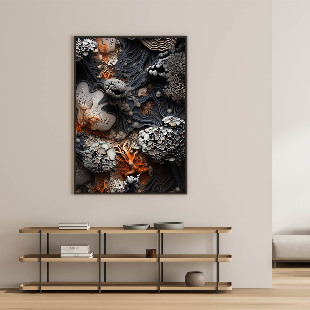 Bring a touch of natural wonder to your home with this stunning macro photography wall art. Featuring an intricate depiction of coral-like formations, this piece showcases the unique textures and vibrant interplay of orange and dark gray tones. The design captures the essence of organic beauty, making it a perfect fit for modern interiors and nature-inspired decor.