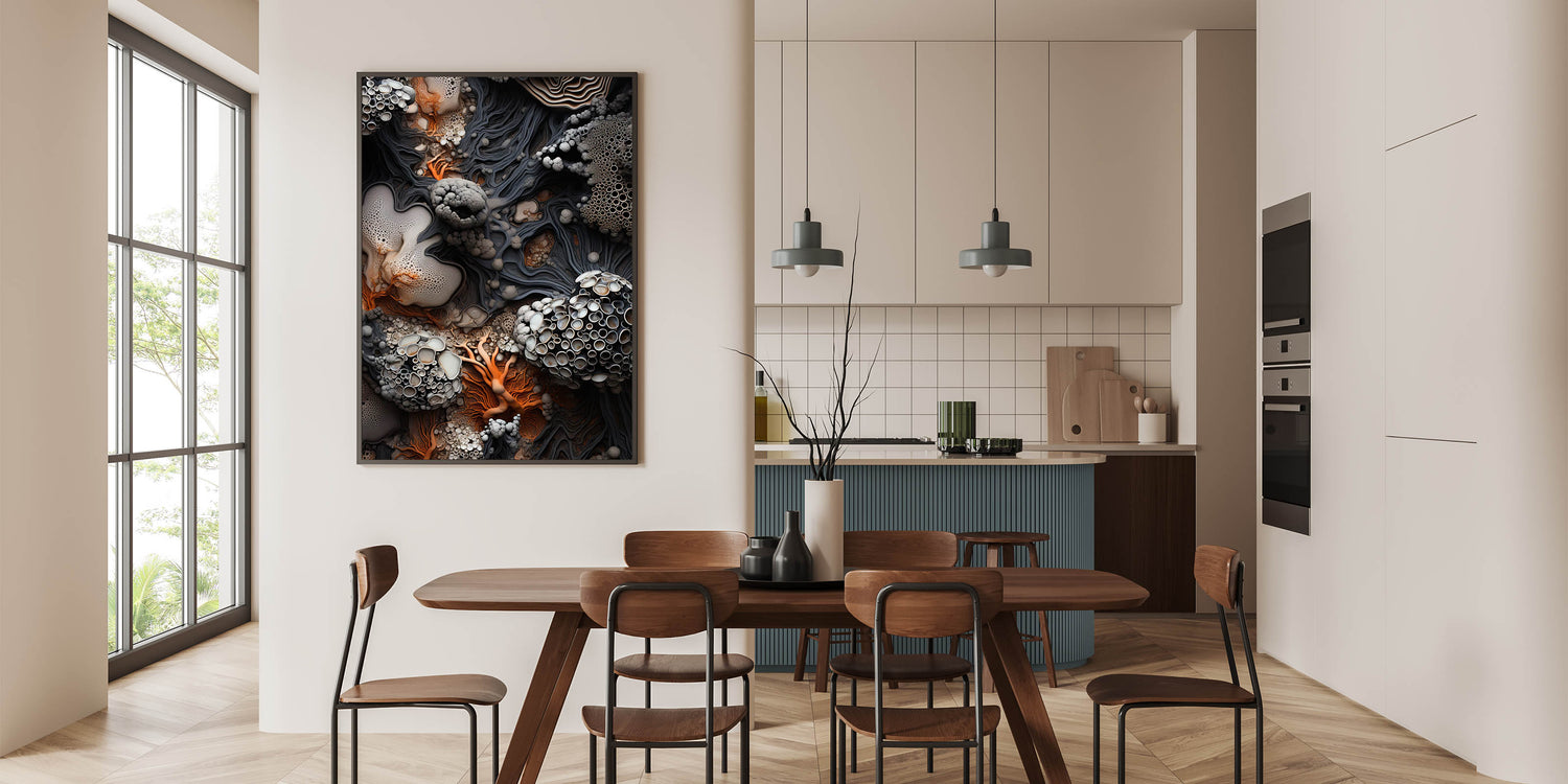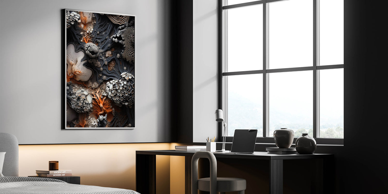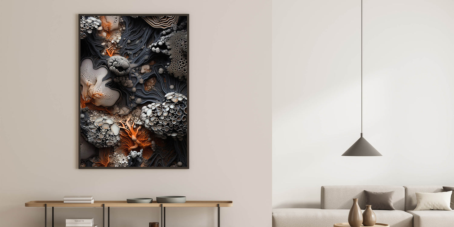 Bring a touch of natural wonder to your home with this stunning macro photography wall art. Featuring an intricate depiction of coral-like formations, this piece showcases the unique textures and vibrant interplay of orange and dark gray tones. The design captures the essence of organic beauty, making it a perfect fit for modern interiors and nature-inspired decor.