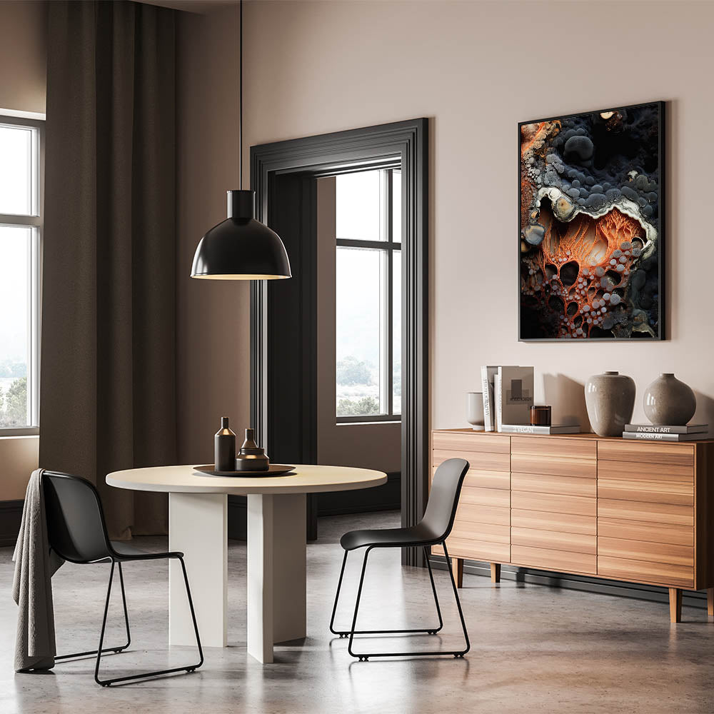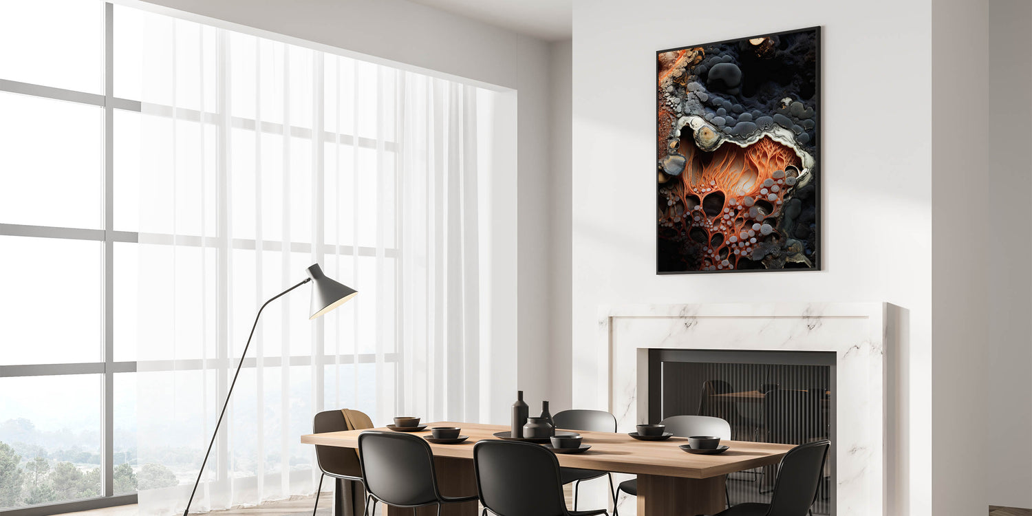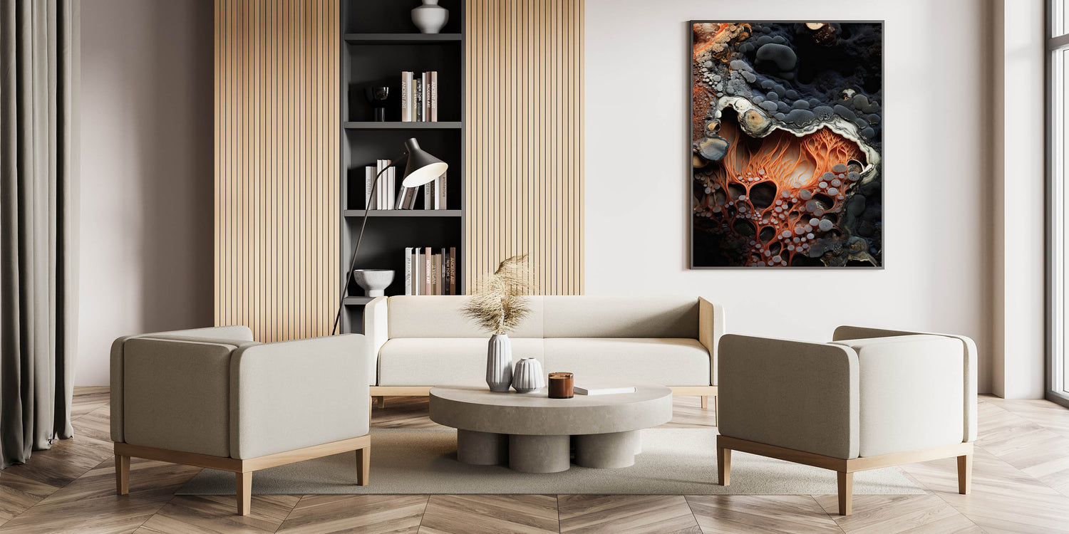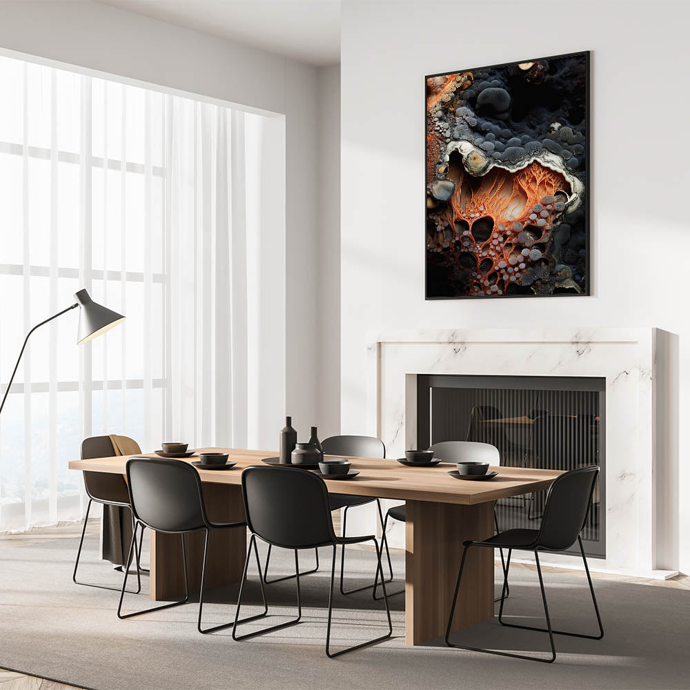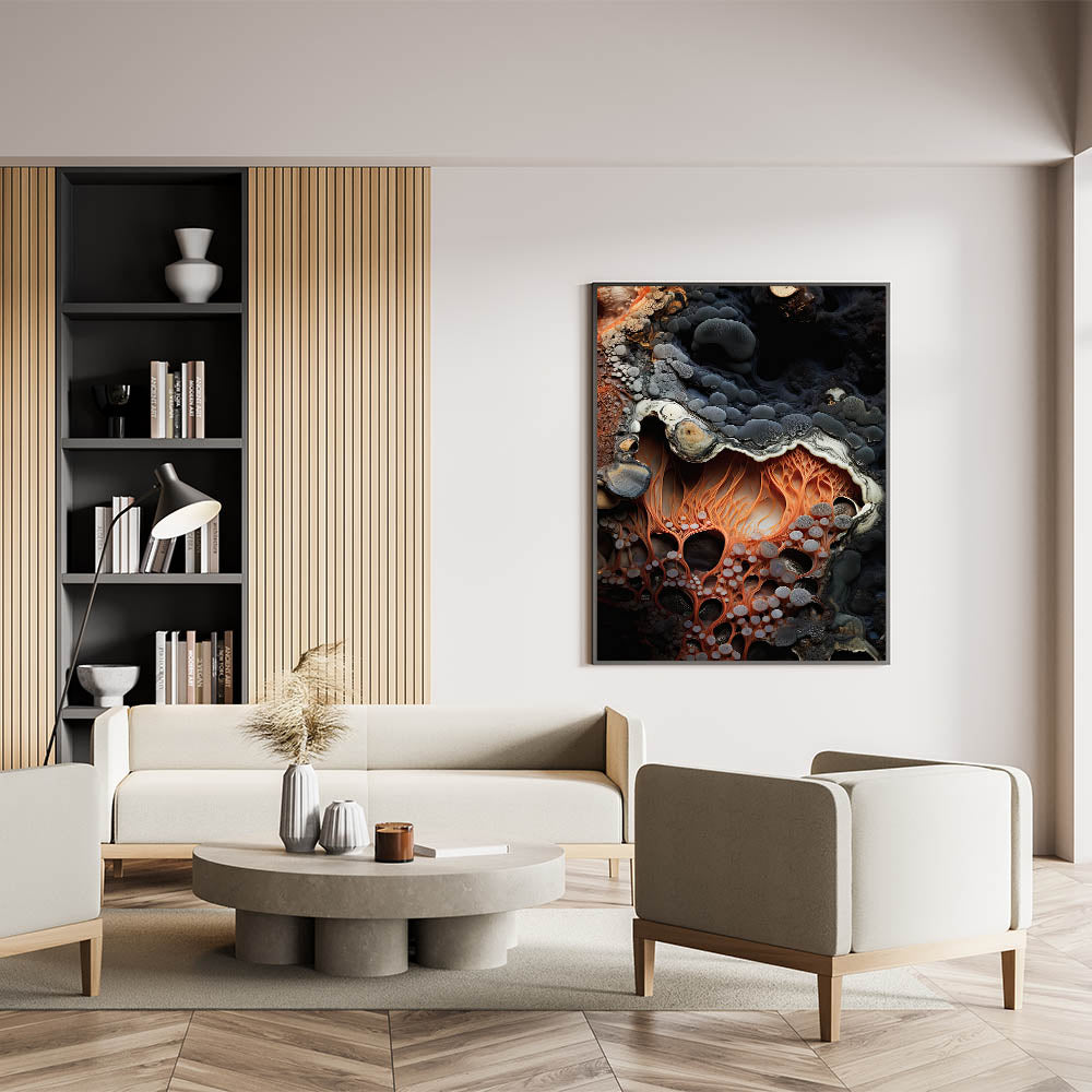 Elevate your home decor with this abstract macro nature art print, featuring a striking close-up of fiery orange, root-like formations. The intricate, web-like textures are set against a deep, rocky background, creating a stunning contrast that highlights the vibrant shades of orange and soft gray tones. This unique design captures the organic beauty of nature, making it an eye-catching addition to any room.