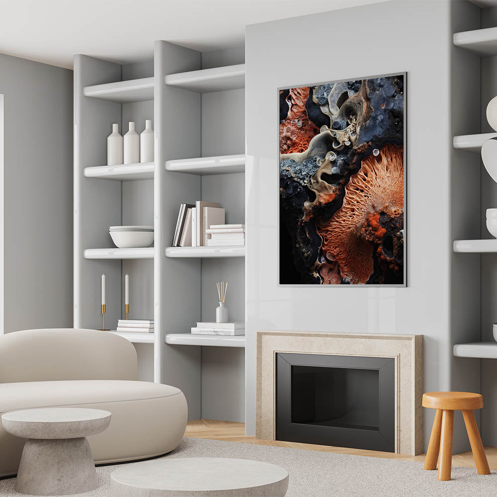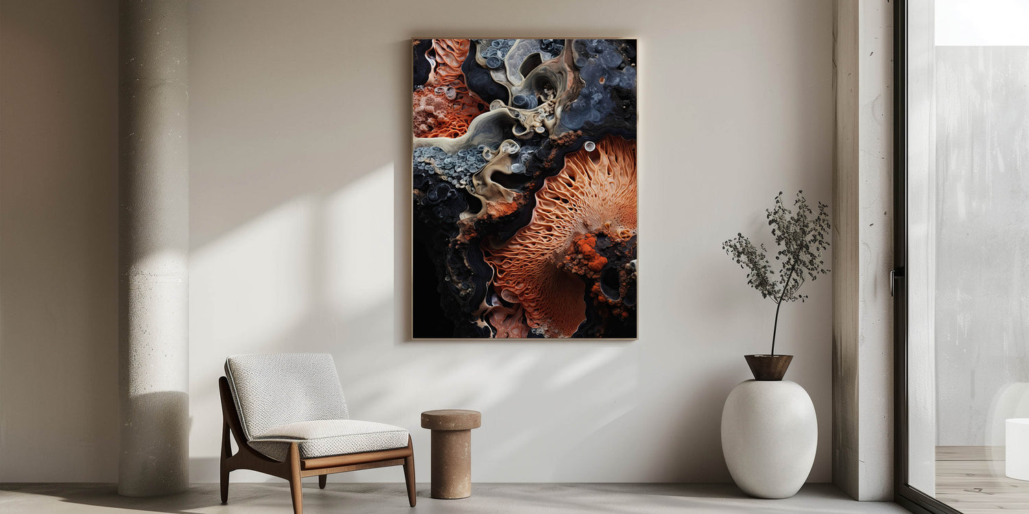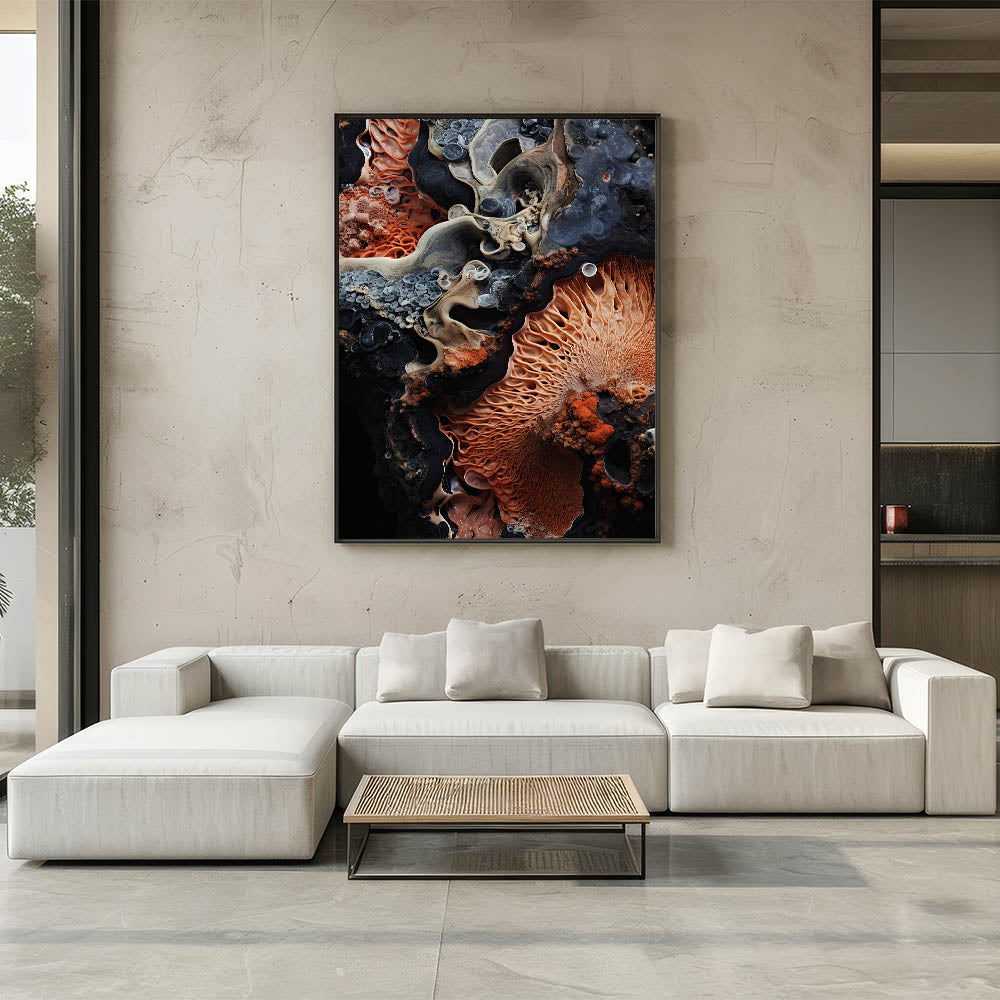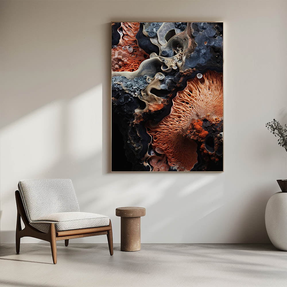 Introduce the beauty of nature into your home with this stunning abstract nature wall art, showcasing a detailed macro photograph of gilled, wave-like formations in shades of peach, beige, and warm orange. The intricate, swirling textures evoke the look of coral reefs and natural geological patterns, creating a visually striking and dynamic piece. Set against a deep, dark background, this artwork captures the essence of organic beauty and adds a touch of sophistication to any space.