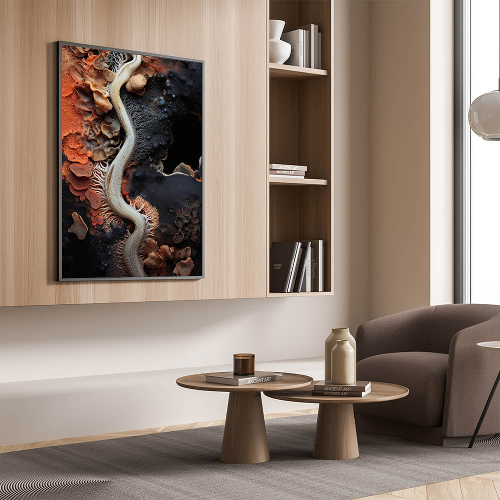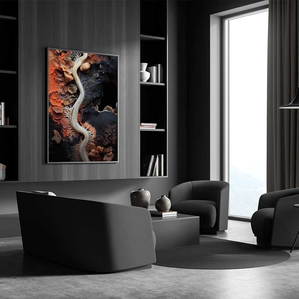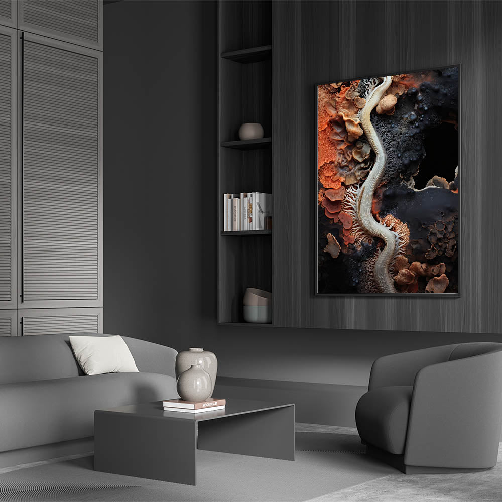 This abstract macro nature art is a perfect focal point for living rooms, bedrooms, or offices, bringing a touch of natural beauty and artistic flair to any decor. The dynamic patterns and warm color palette make it a versatile addition to a variety of interior styles.