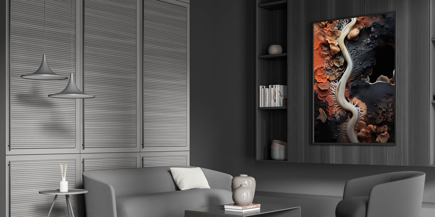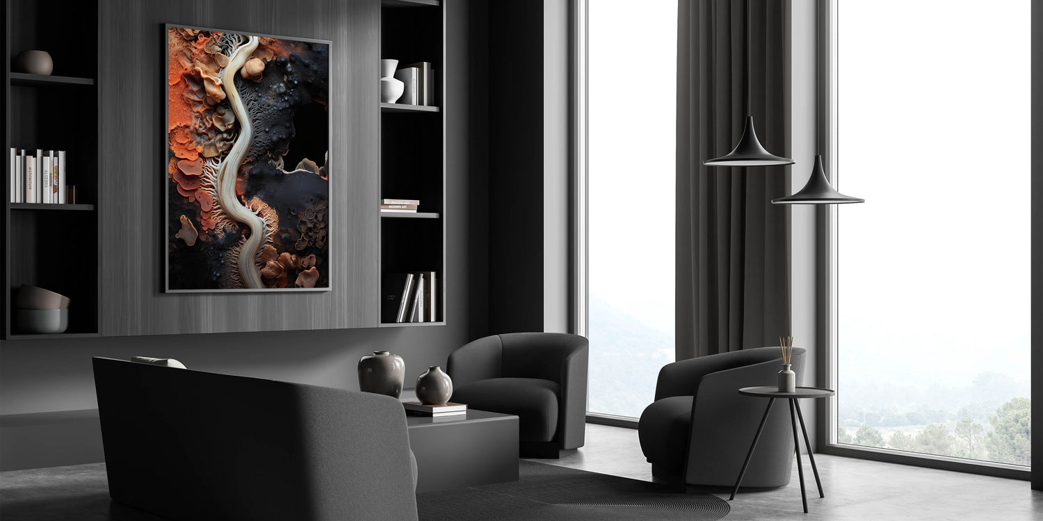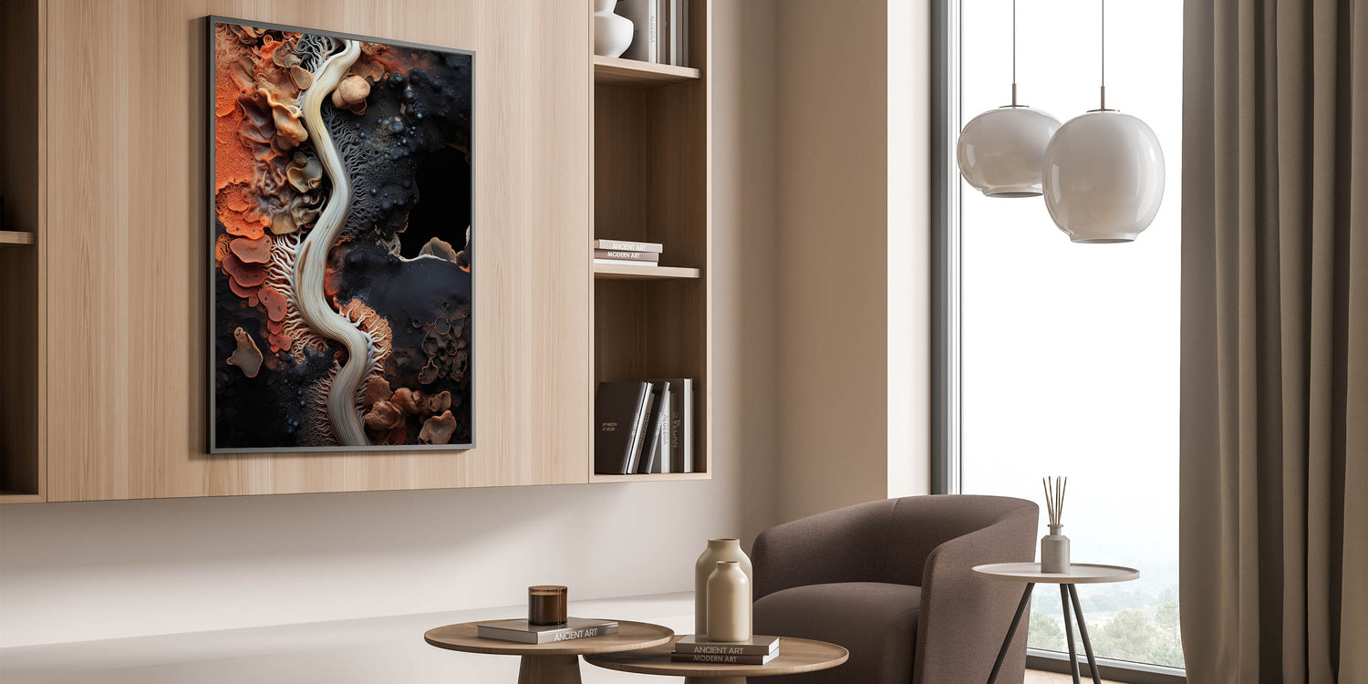 This abstract macro nature art is a perfect focal point for living rooms, bedrooms, or offices, bringing a touch of natural beauty and artistic flair to any decor. The dynamic patterns and warm color palette make it a versatile addition to a variety of interior styles.