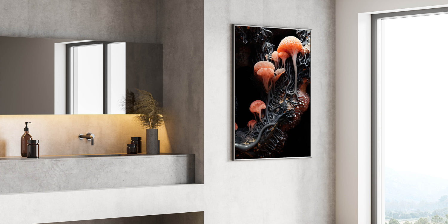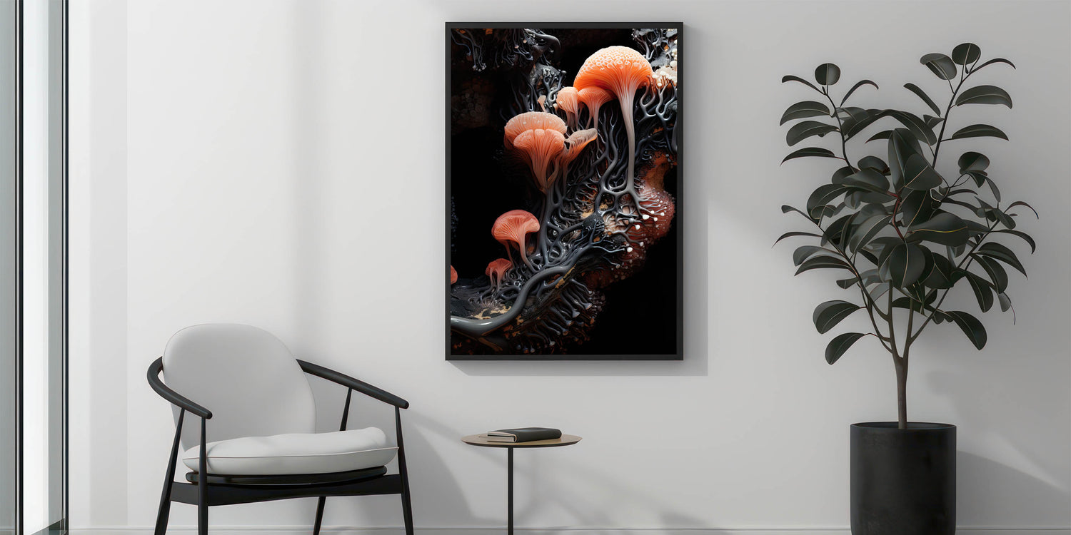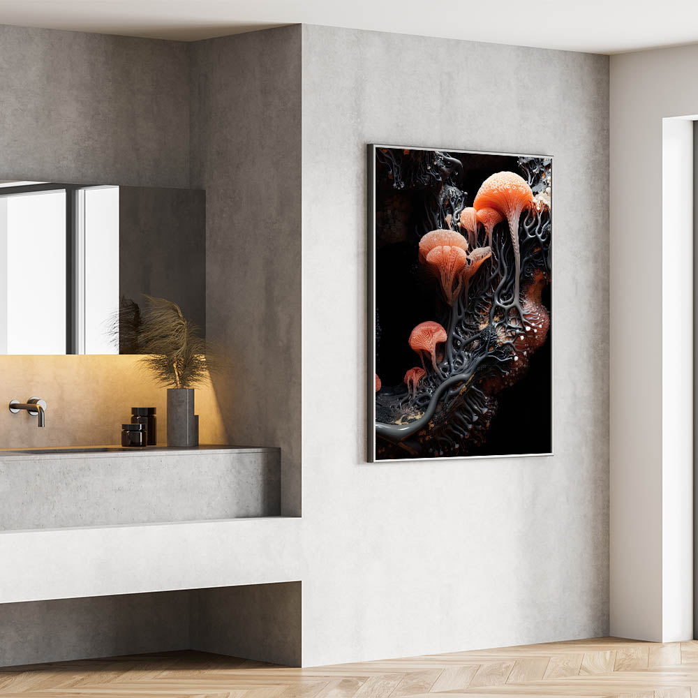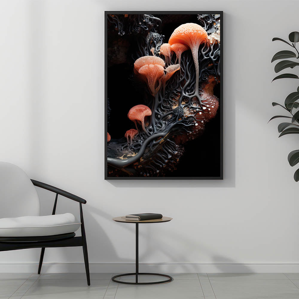 Experience the beauty of nature’s details with this stunning botanical closeup art, showcasing a macro photograph of delicate coral orange mushrooms. The intricate design features vibrant shades of coral and peach, set against a contrasting dark background, creating a visually striking piece that captures the essence of organic textures.