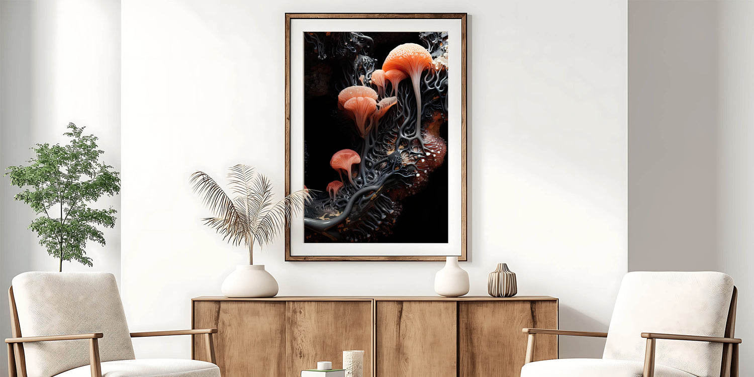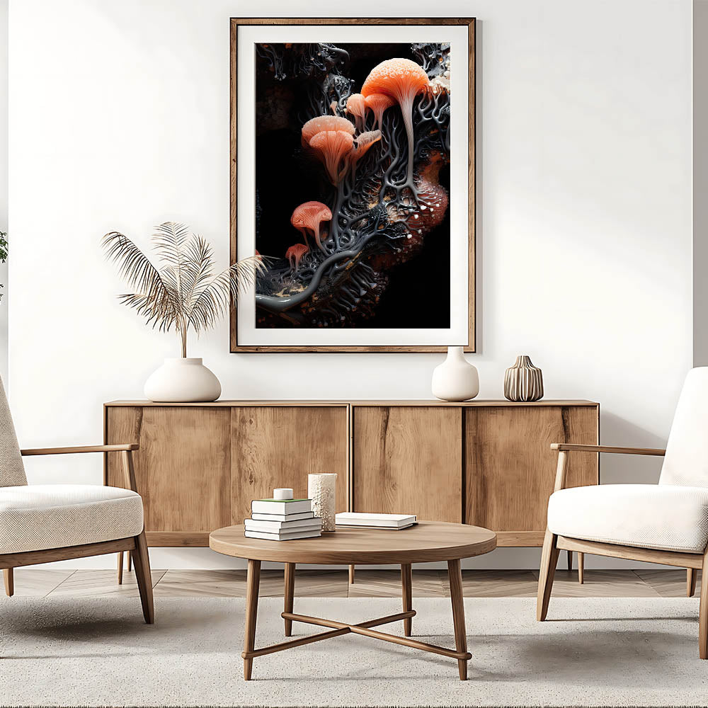 - High-resolution botanical closeup print highlighting coral orange mushroom structures