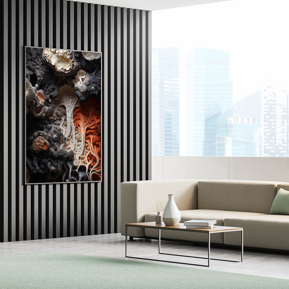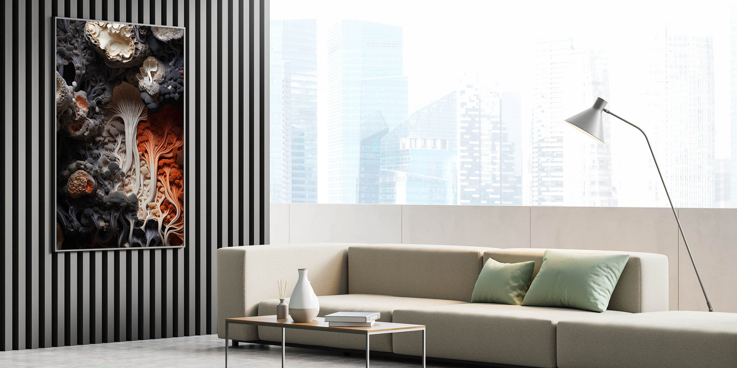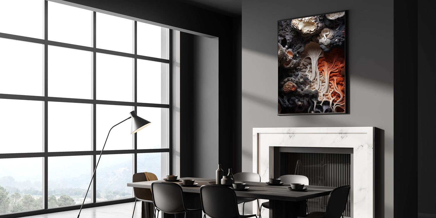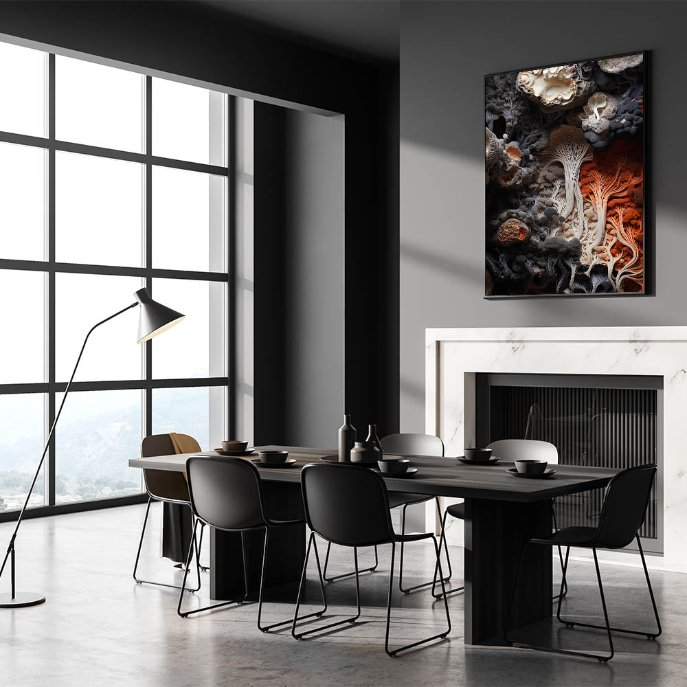 Immerse yourself in the natural elegance of this dynamic fungi macro wall art. The piece showcases a stunning closeup of intricate fungi and mushrooms, highlighted by a sophisticated blend of creamy whites, deep grays, and a striking splash of fiery orange. The flowing patterns and textured layers capture the organic beauty of nature, creating a visually captivating artwork that adds depth and movement to any space.