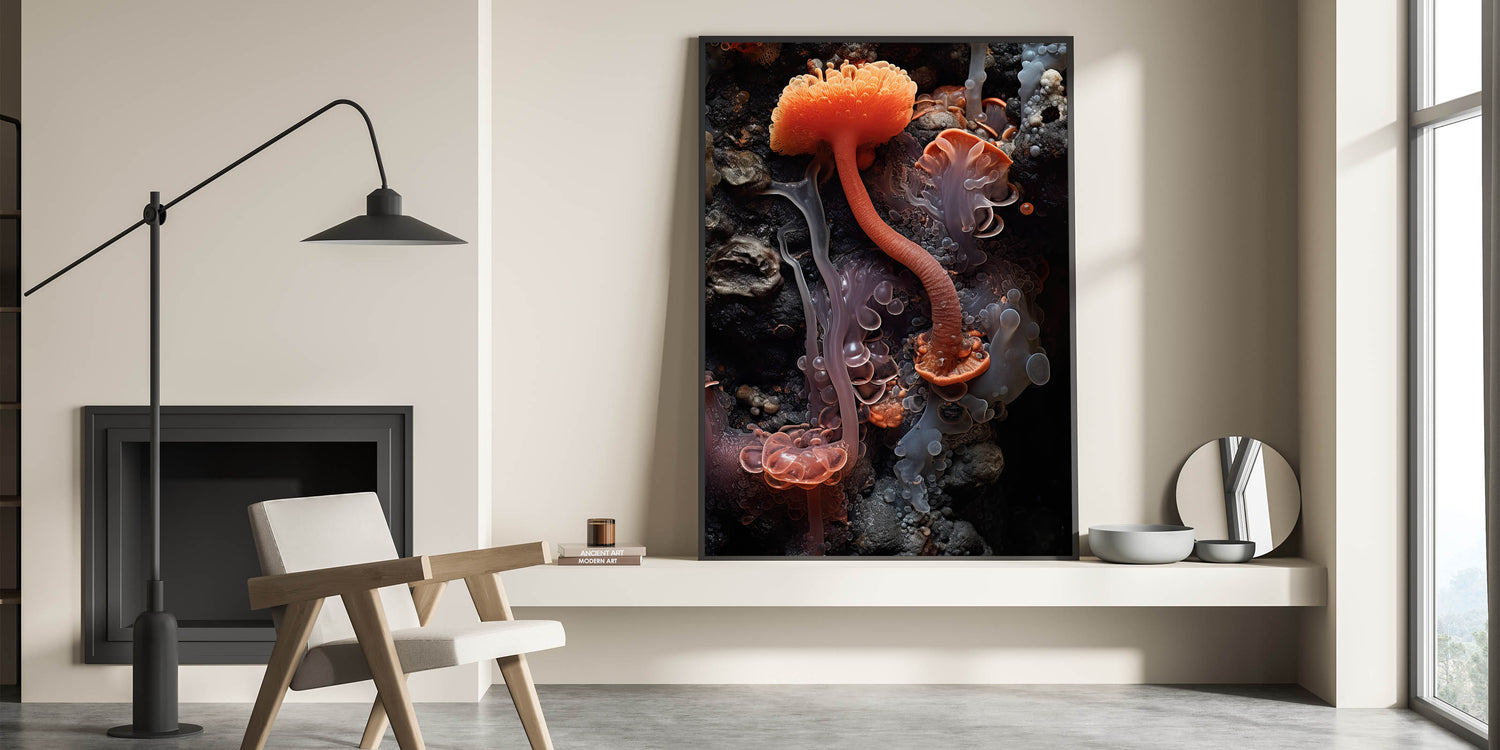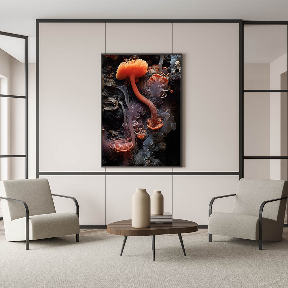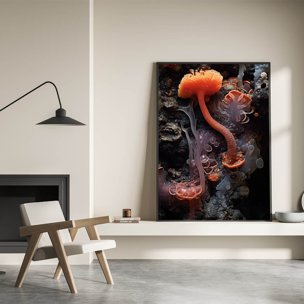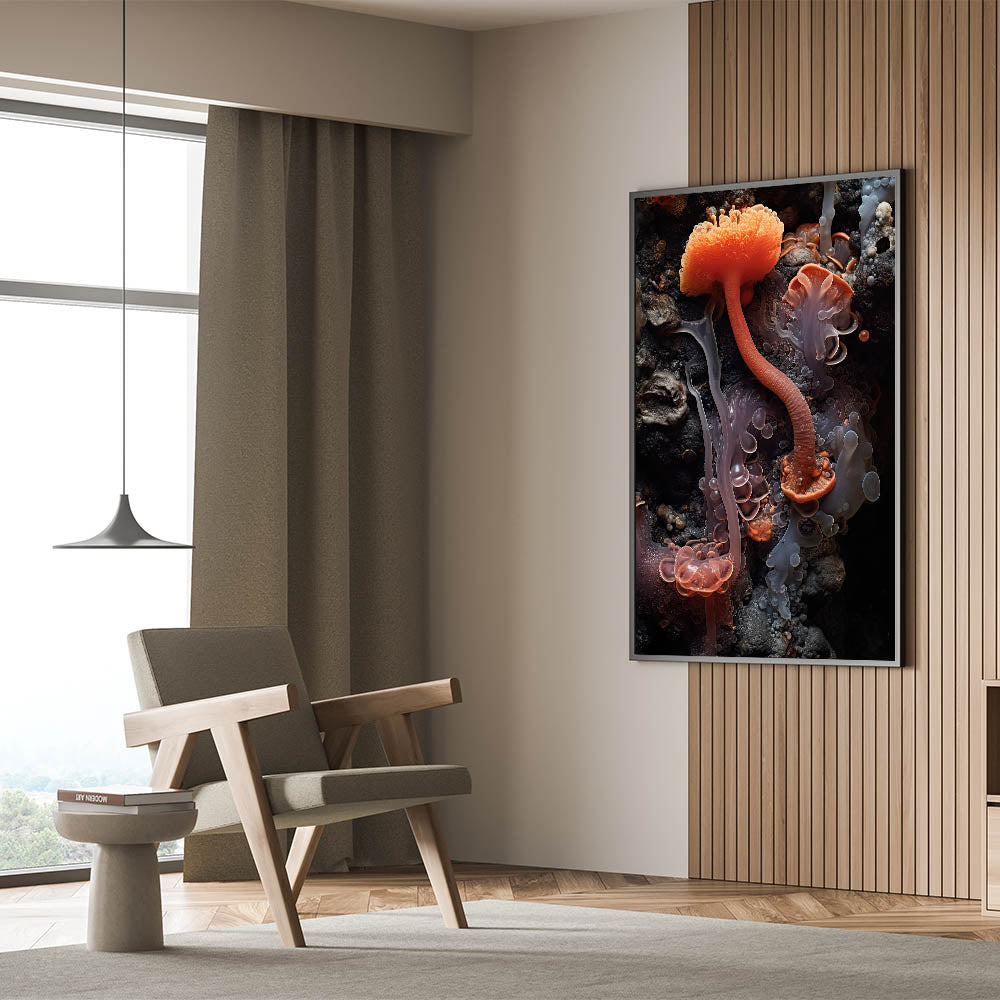 Bring the vibrant essence of nature into your space with this floral macro wall art, featuring a stunning close-up of a vivid orange mushroom structure. The detailed, textured cap and slender stem create a striking visual against a dark, rocky backdrop, complemented by translucent, jelly-like formations that add a unique, ethereal quality to the piece.