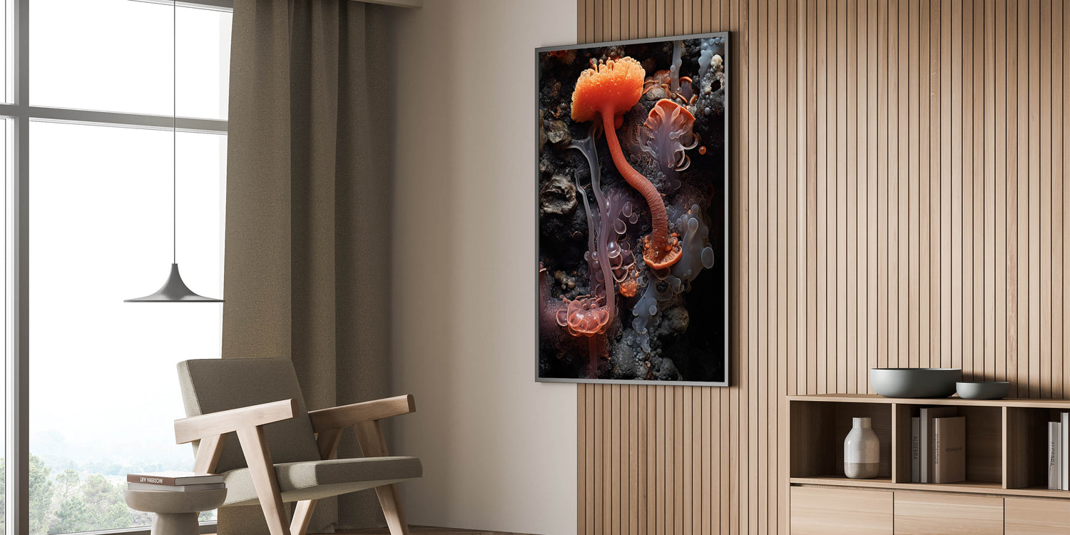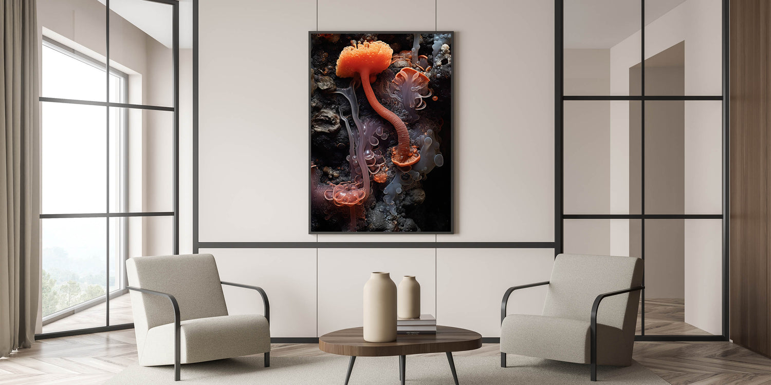 This vibrant mushroom macro art print is an excellent focal point for living rooms, bedrooms, or office spaces. Its dynamic colors and intricate details capture the essence of the natural world, adding a touch of organic elegance and charm to any decor.