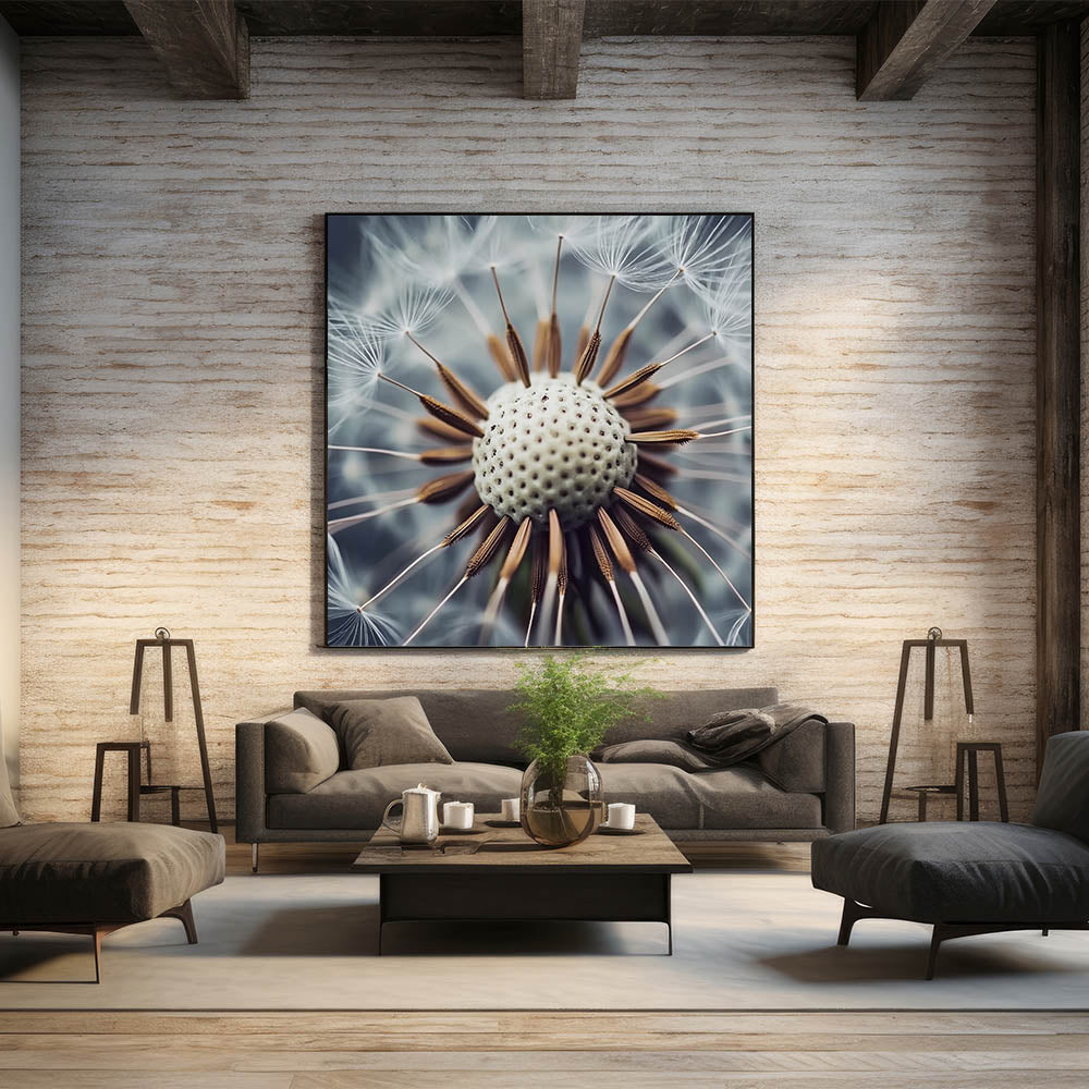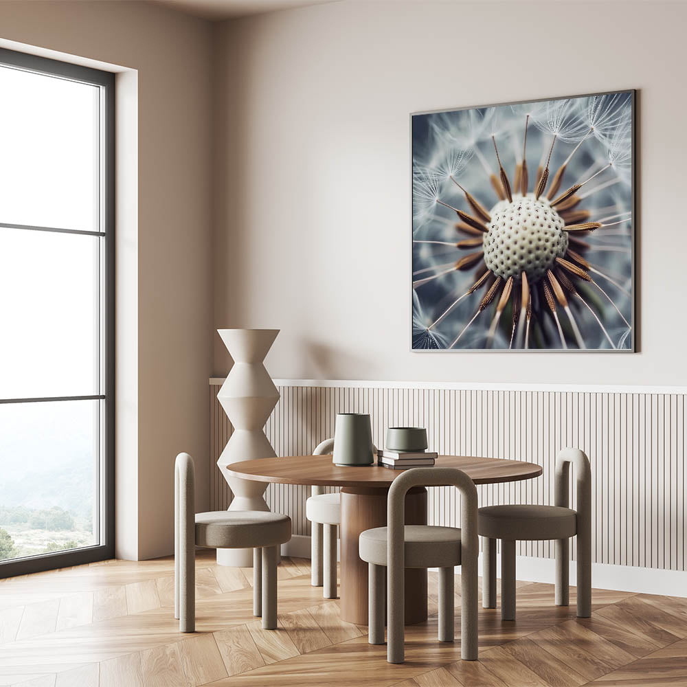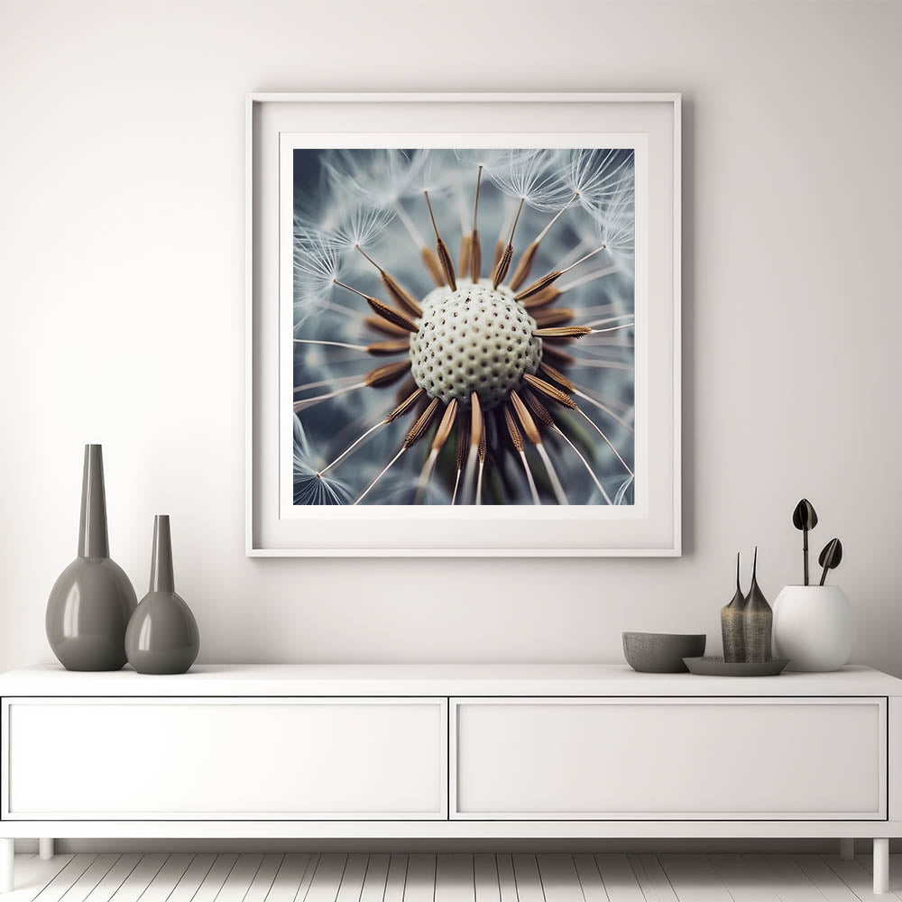 Bring a sense of calm and natural beauty to your space with this elegant dandelion close-up wall art. Featuring the delicate details of a dandelion’s seeds radiating from the core, this artwork captures soft, neutral tones of white, beige, and brown, creating a serene and sophisticated aesthetic. Perfect for minimalist and nature-inspired interiors, this floral photography print makes a striking addition to any decor.