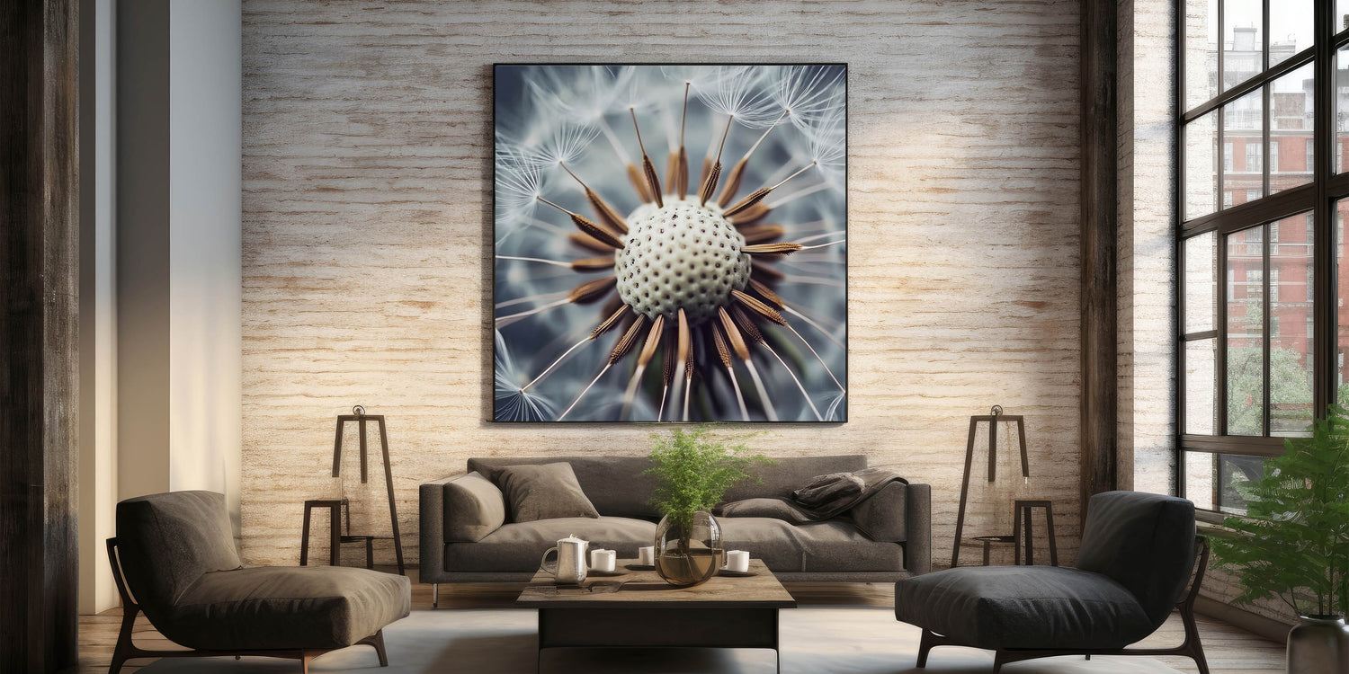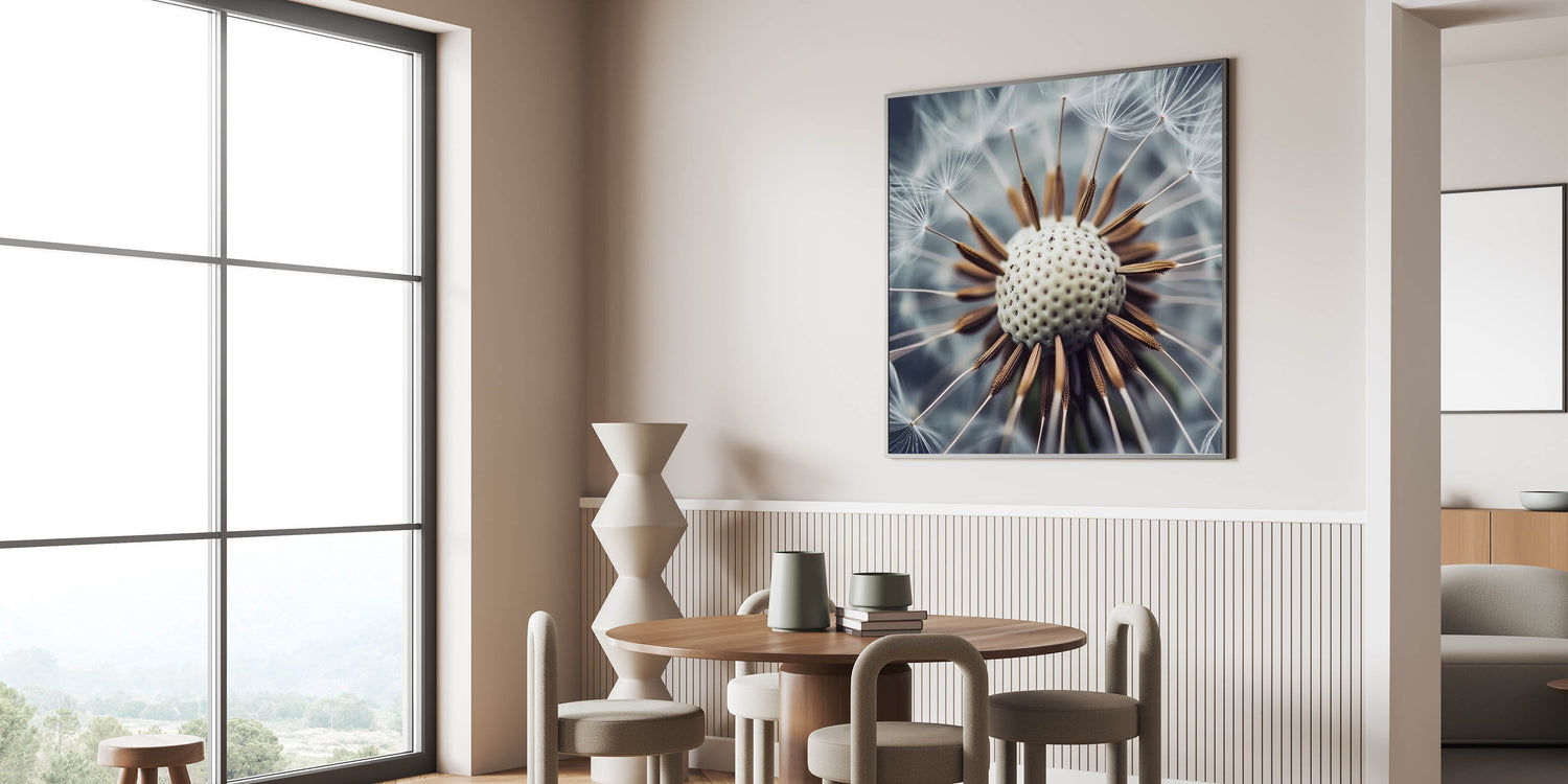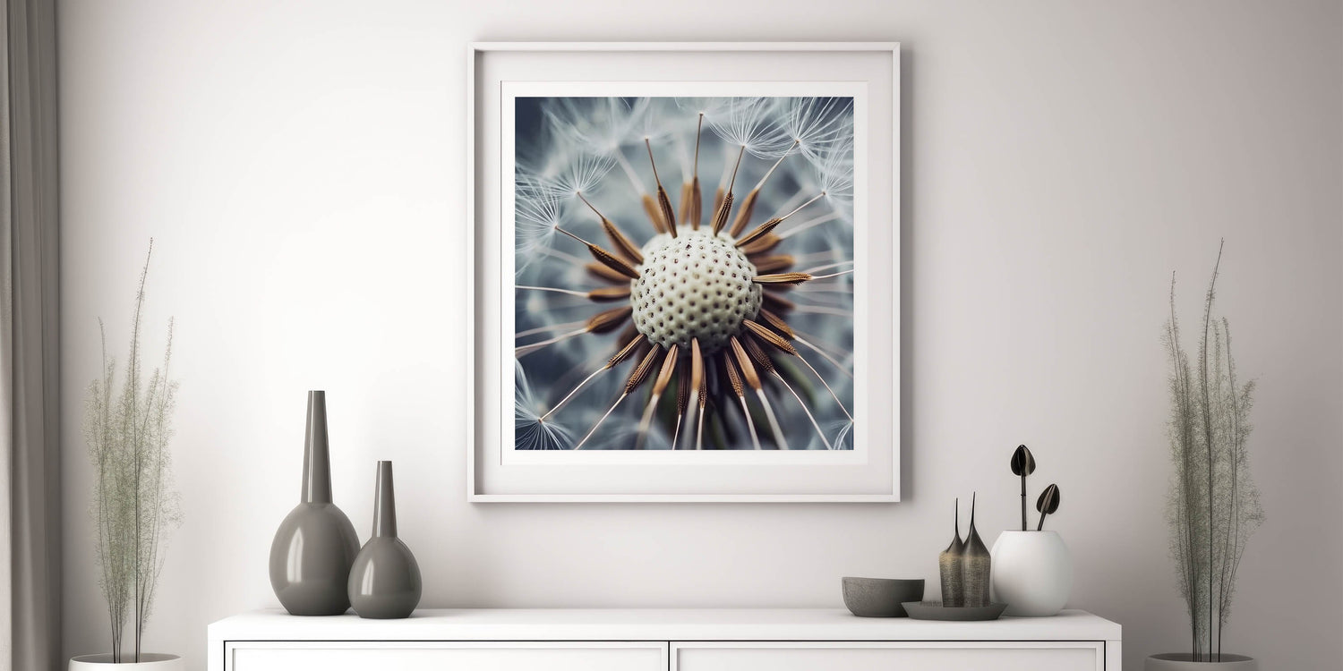 Bring a sense of calm and natural beauty to your space with this elegant dandelion close-up wall art. Featuring the delicate details of a dandelion’s seeds radiating from the core, this artwork captures soft, neutral tones of white, beige, and brown, creating a serene and sophisticated aesthetic. Perfect for minimalist and nature-inspired interiors, this floral photography print makes a striking addition to any decor.