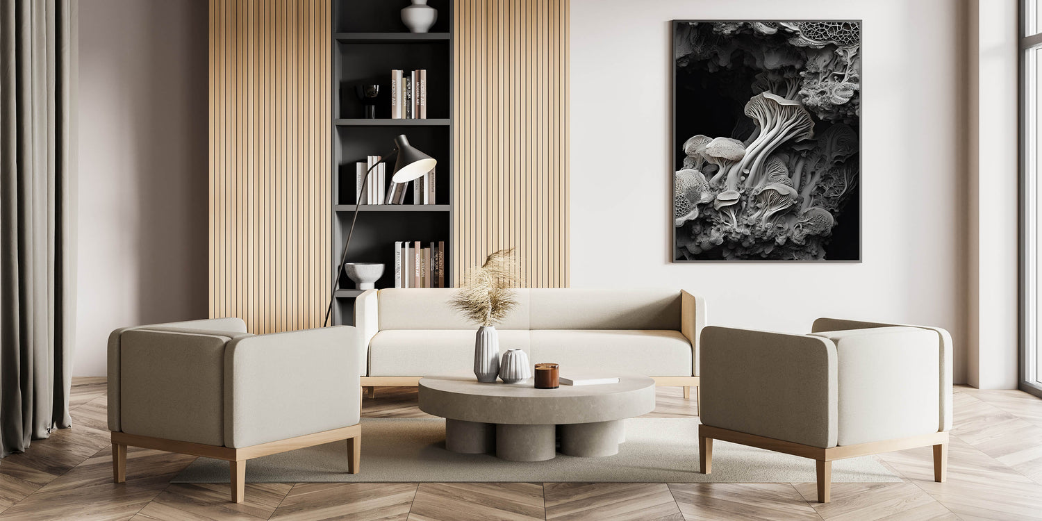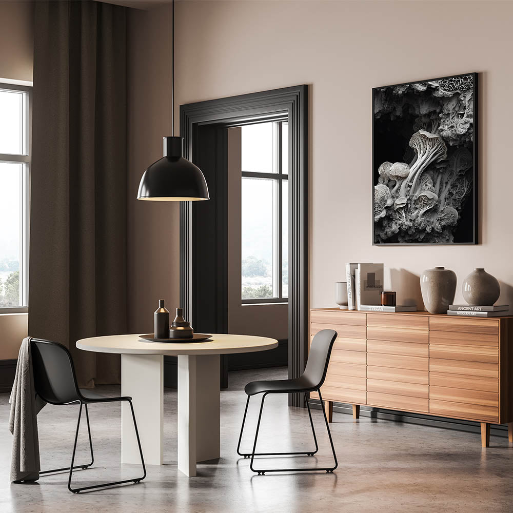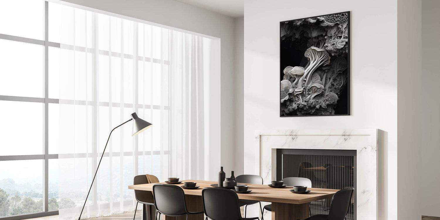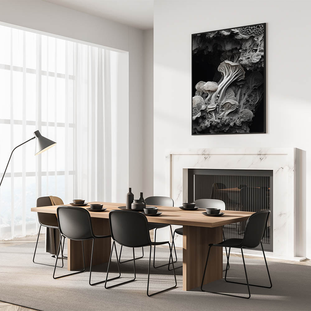 Transform your living space with this exquisite mushroom macro wall art, showcasing the intricate patterns and textures of nature. Captured in high-resolution monochrome, this artwork highlights the delicate beauty of mushrooms, enhanced by their organic forms and subtle contrasts. Its minimalist palette makes it a versatile addition to modern, industrial, or nature-inspired interiors.
