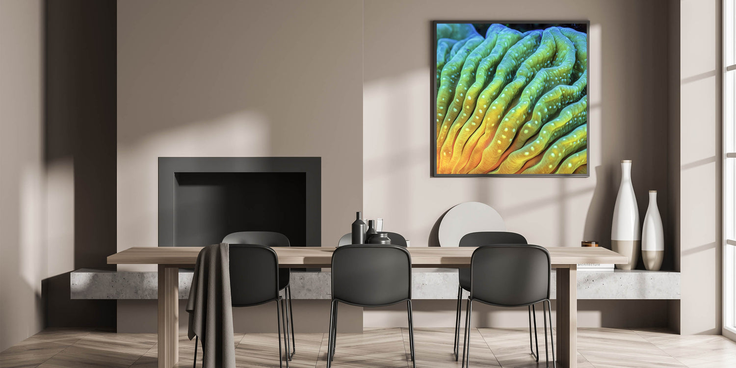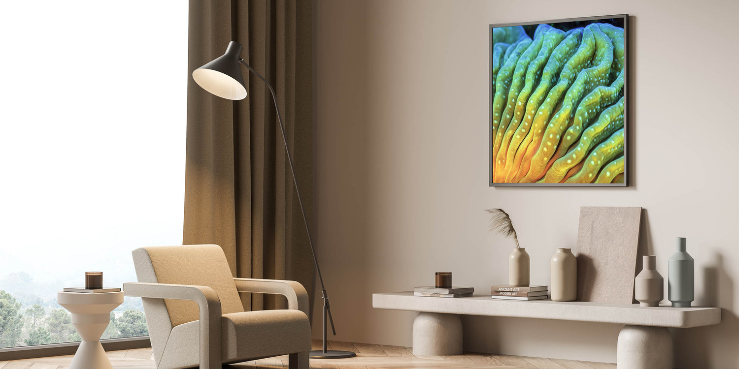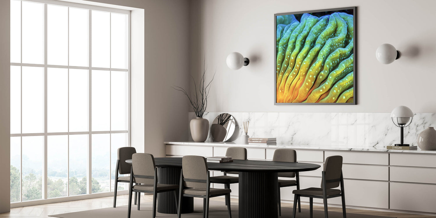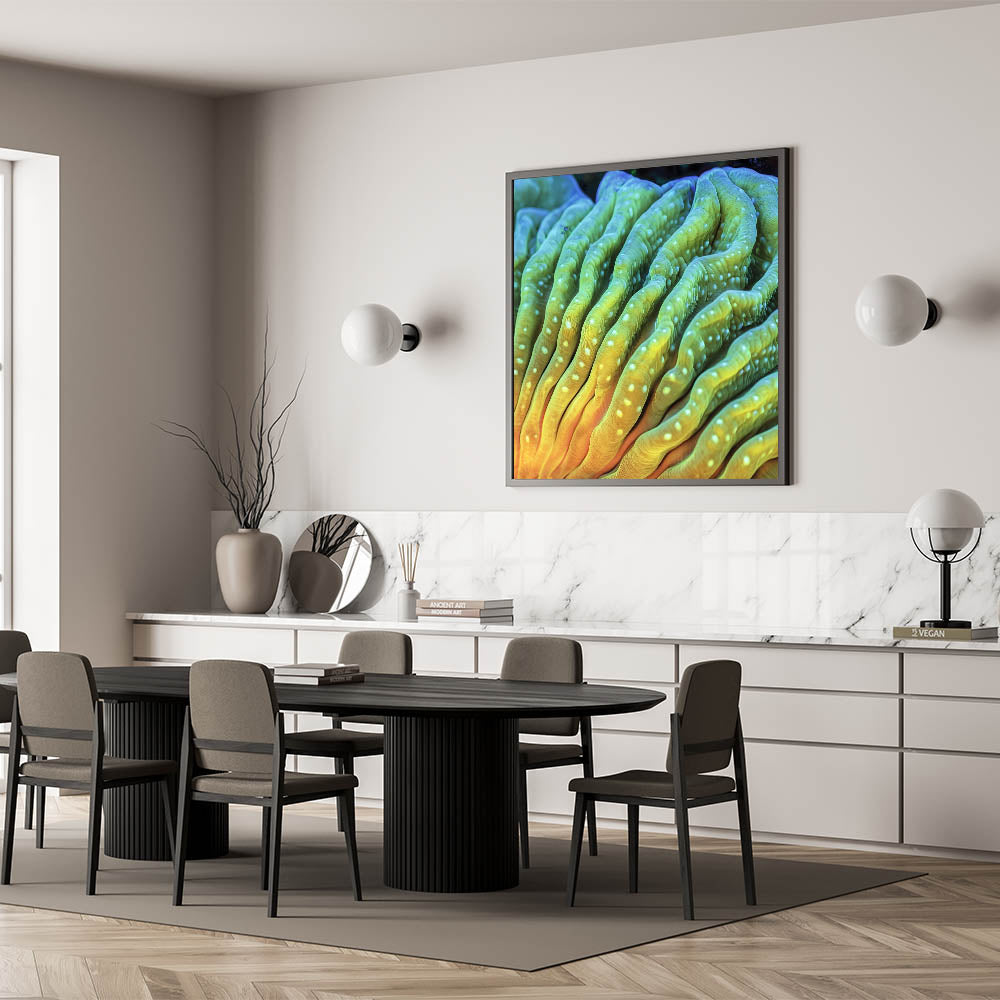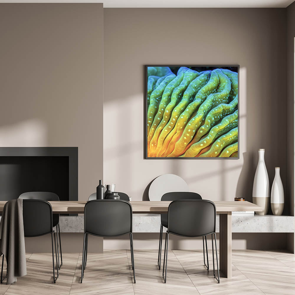 Transform your space with this eye-catching nature close-up print, featuring the intricate patterns of a coral-like bloom in vibrant yellow, green, and blue tones. This unique artwork captures the delicate folds and textures of nature's design, bringing a touch of elegance and vibrancy to your interior decor. Perfect for lovers of bold and artistic floral wall art.