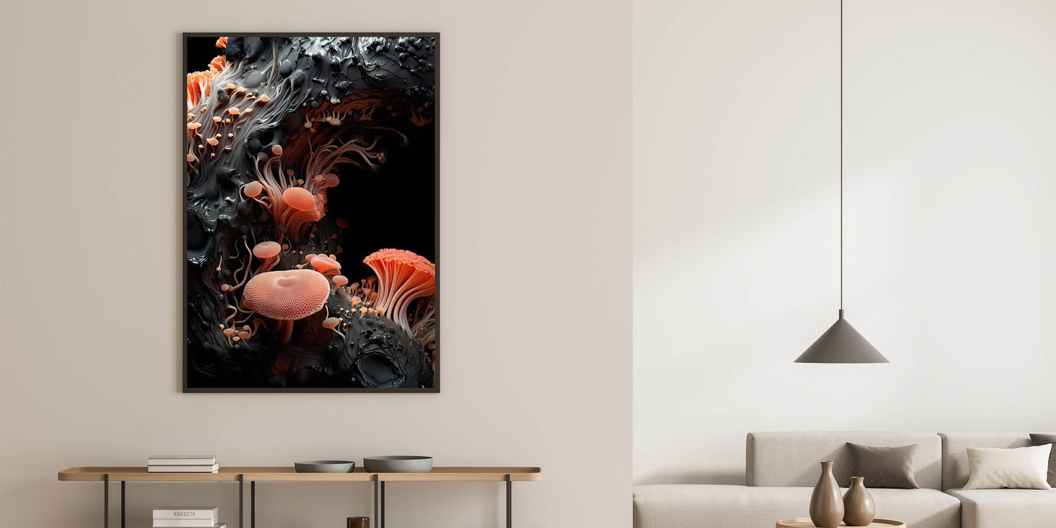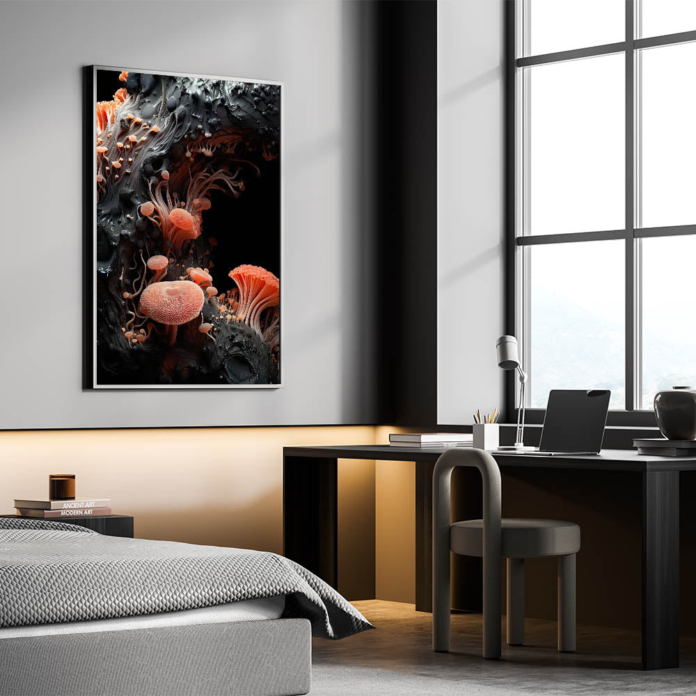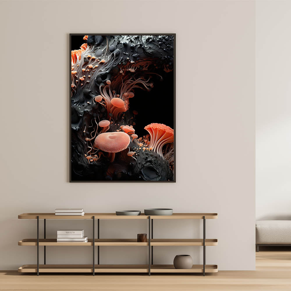 Immerse yourself in the wonders of nature with this macro nature photography print, featuring an exquisite close-up of coral pink mushrooms. This stunning artwork captures the delicate textures and intricate forms of mushrooms in vibrant shades of pink and peach, set against a dark gray background for a striking contrast.