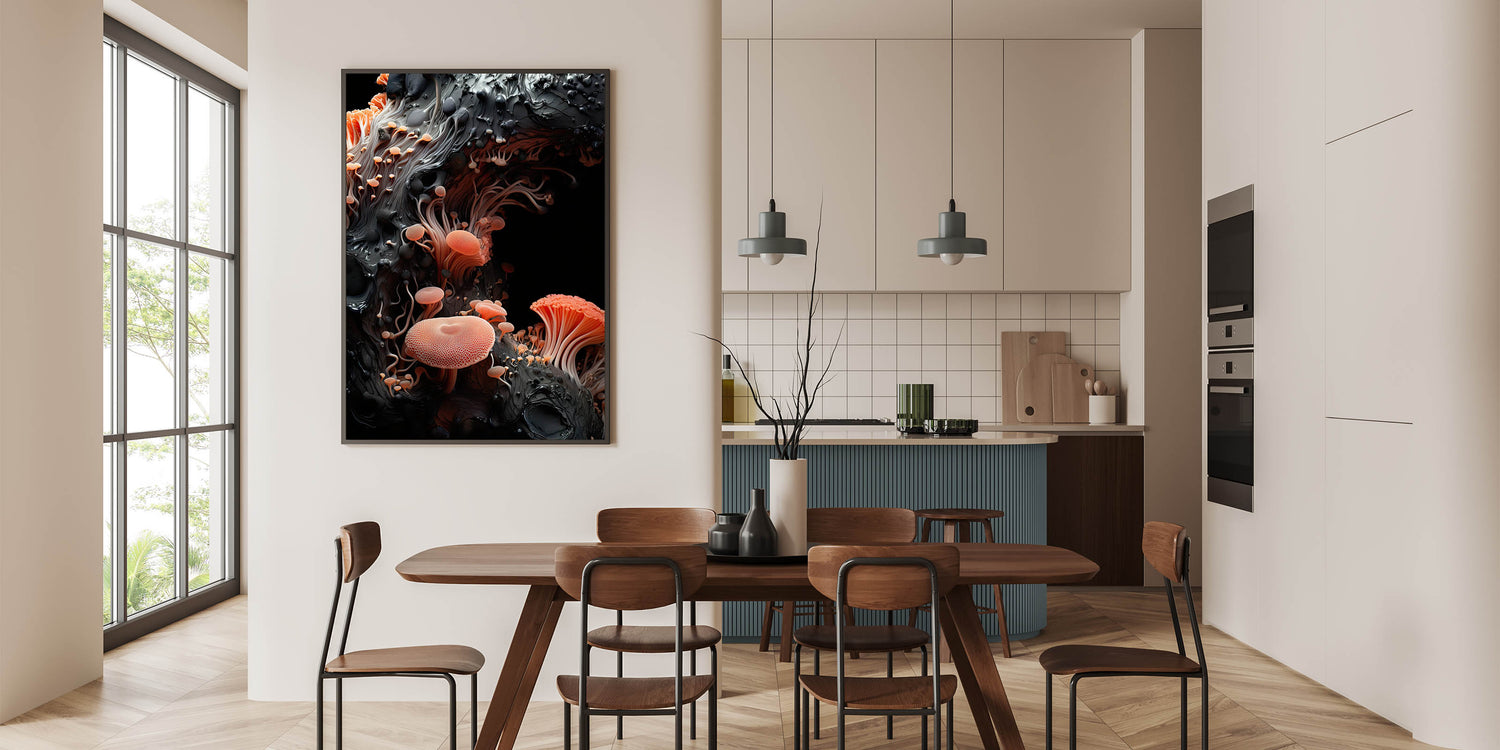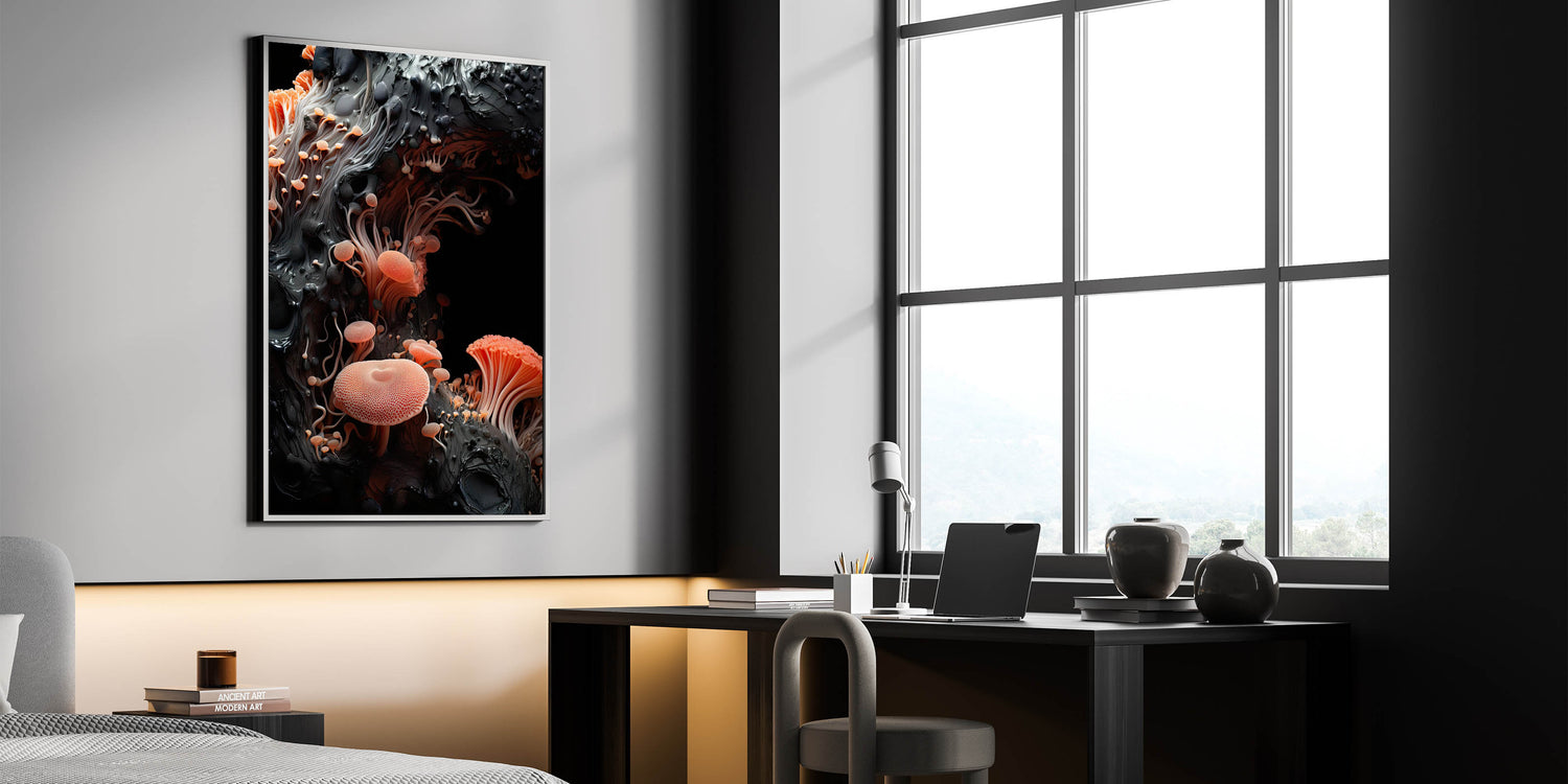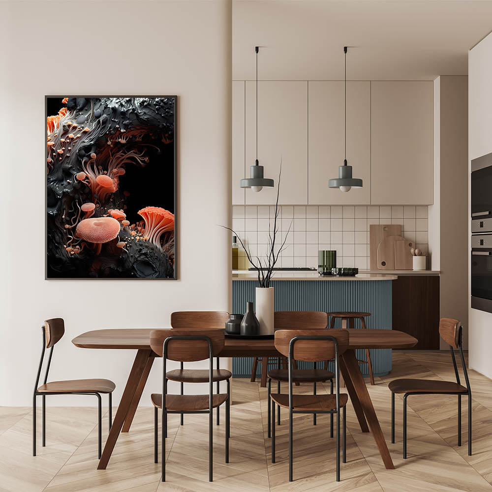Immerse yourself in the wonders of nature with this macro nature photography print, featuring an exquisite close-up of coral pink mushrooms. This stunning artwork captures the delicate textures and intricate forms of mushrooms in vibrant shades of pink and peach, set against a dark gray background for a striking contrast.