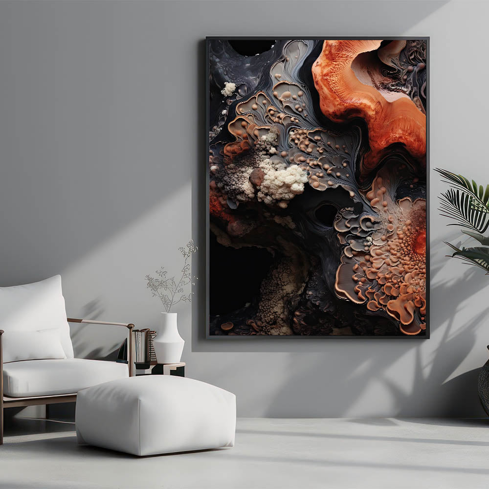 Bring the raw beauty of nature into your space with this nature closeup wall art, showcasing an abstract macro photograph of earthy, textured formations. The intricate patterns in shades of warm orange, deep brown, and creamy beige evoke the look of natural rock and geological layers, creating a visually striking and organic piece.