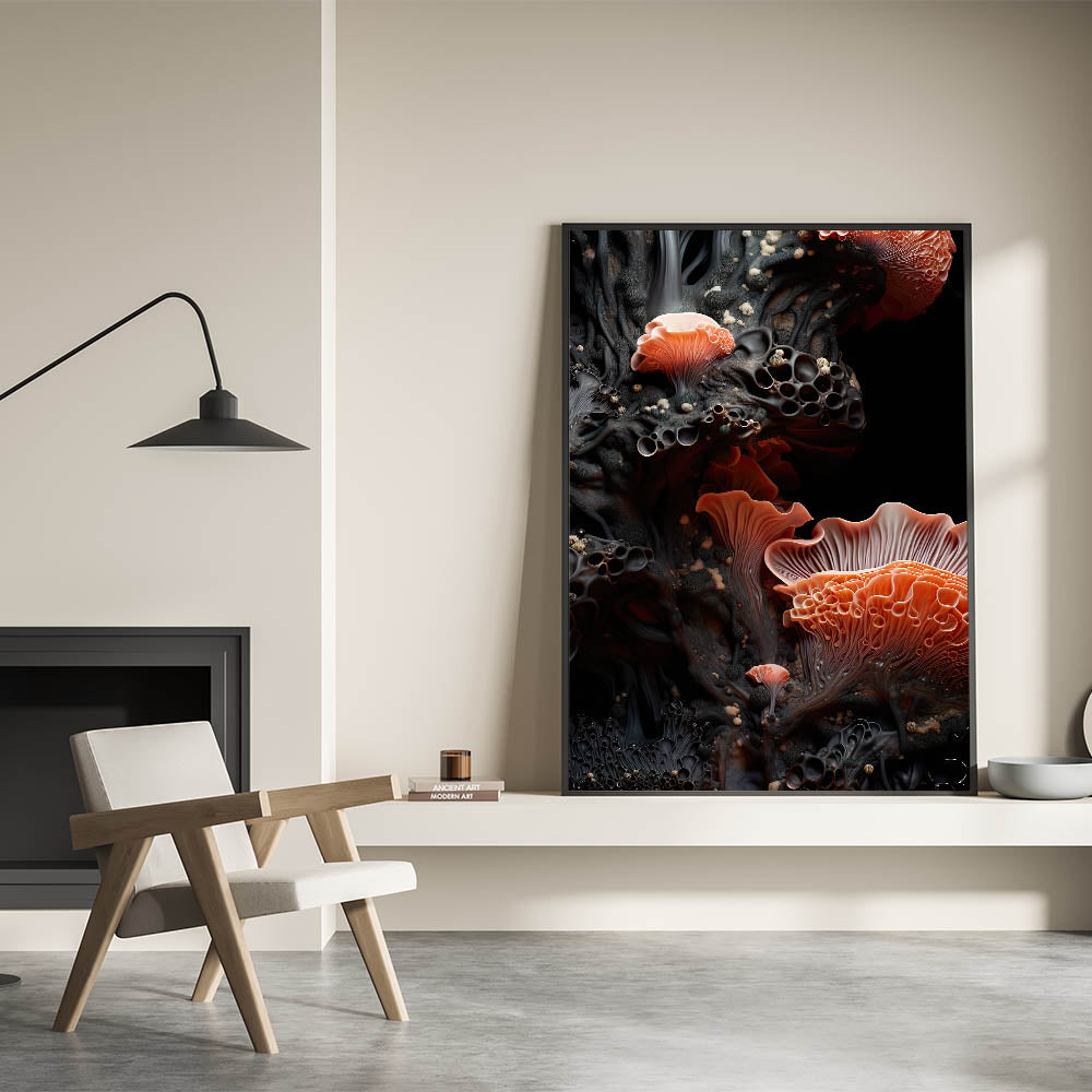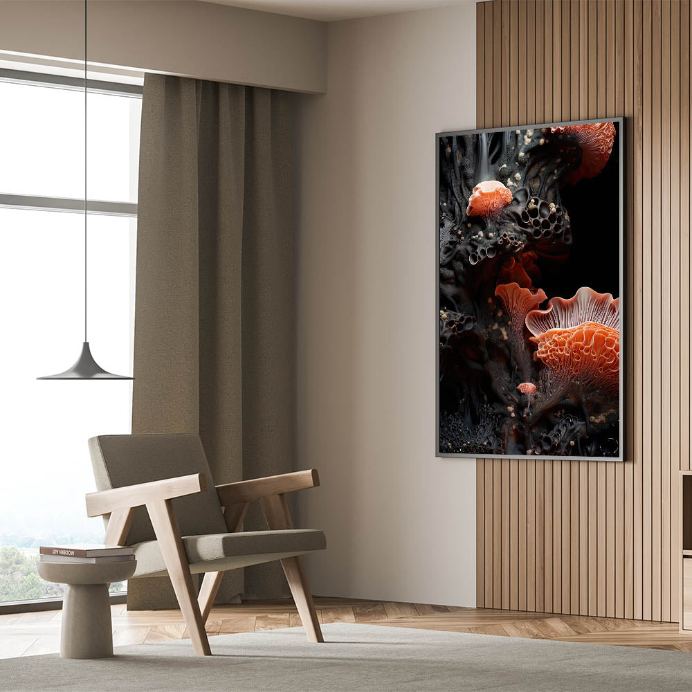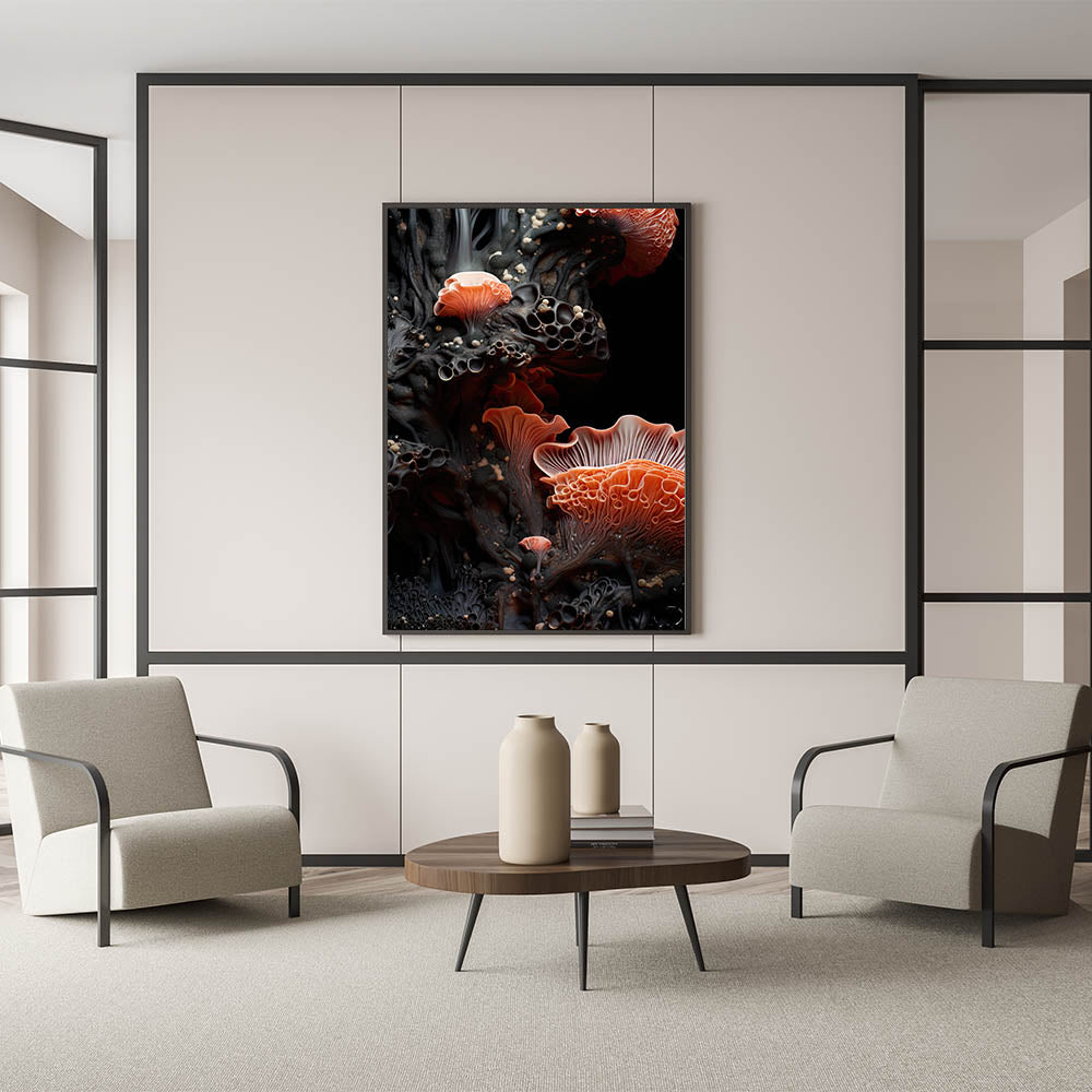 Enhance your space with this stunning nature closeup wall art featuring a vibrant macro photograph of coral-like mushrooms. The artwork captures intricate details and vivid coral red hues set against a deep, dark background, making it a striking focal point for any interior.