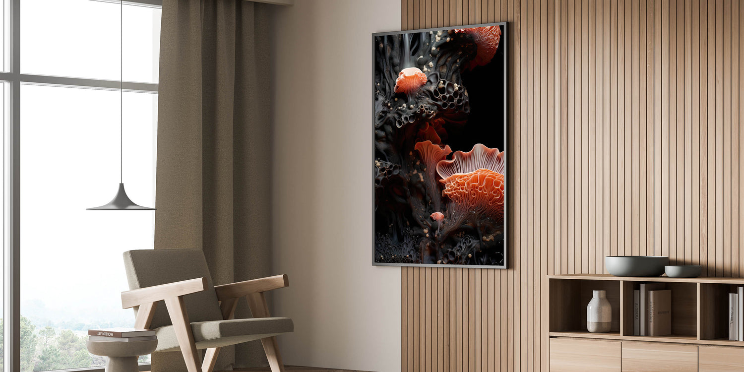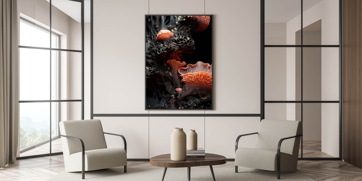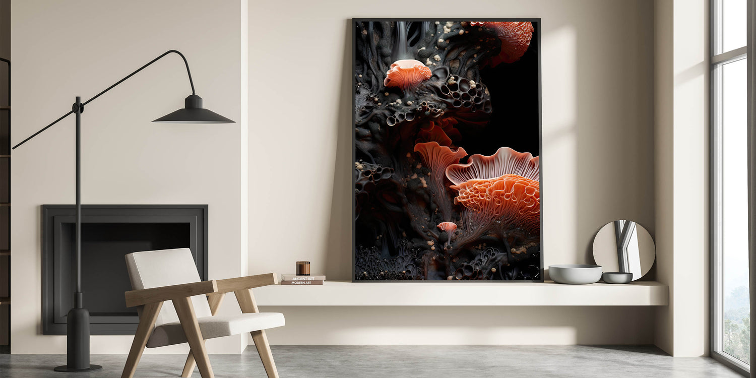 Enhance your space with this stunning nature closeup wall art featuring a vibrant macro photograph of coral-like mushrooms. The artwork captures intricate details and vivid coral red hues set against a deep, dark background, making it a striking focal point for any interior.