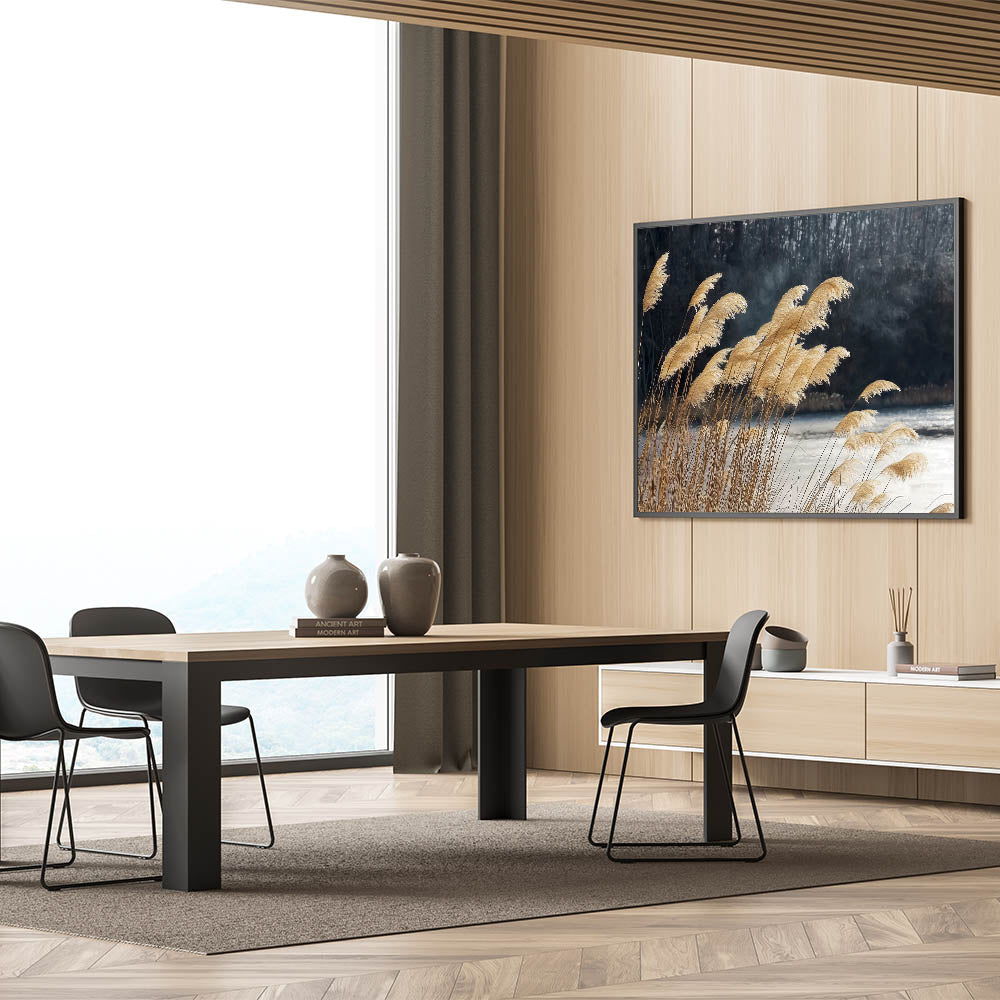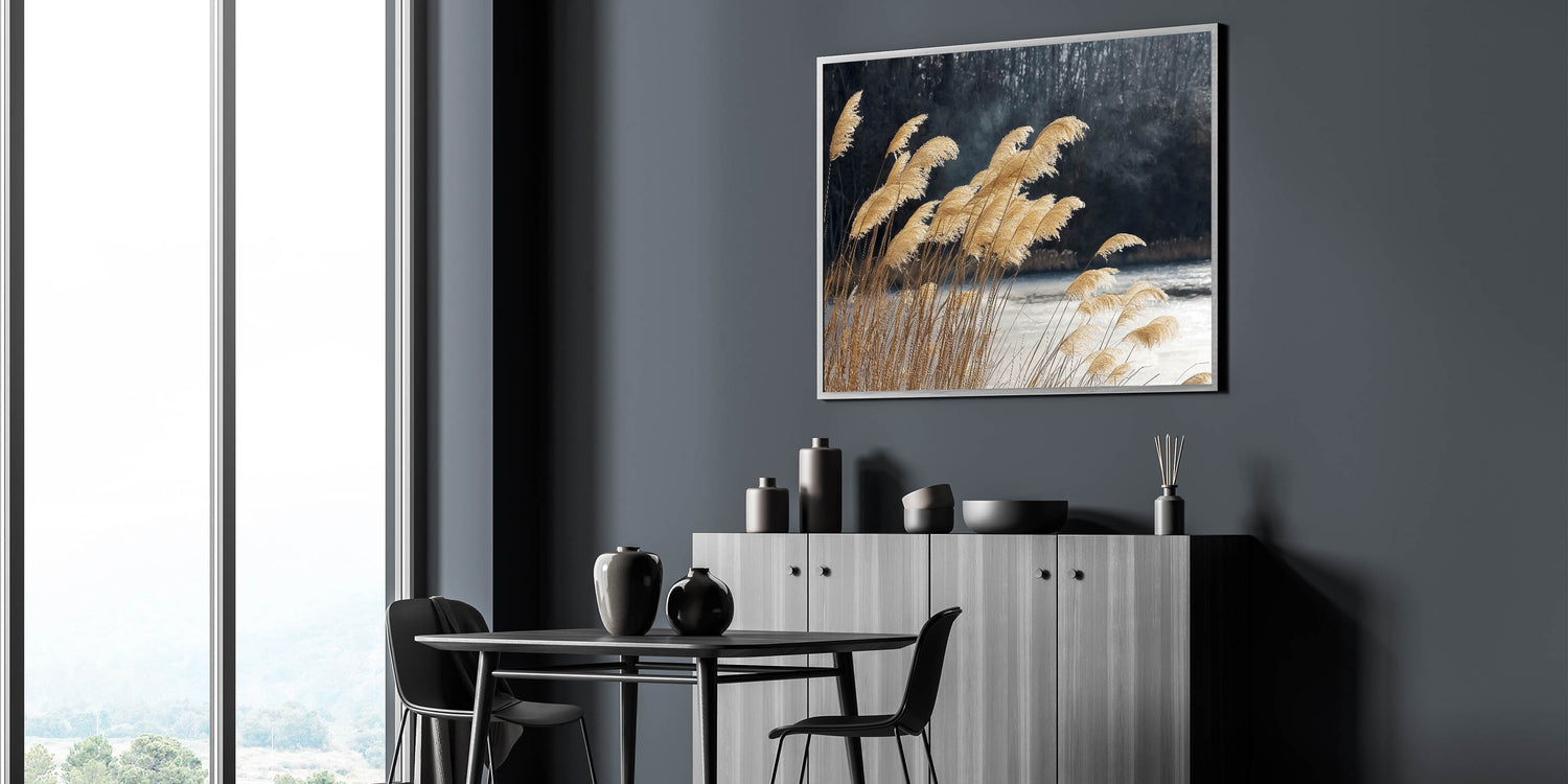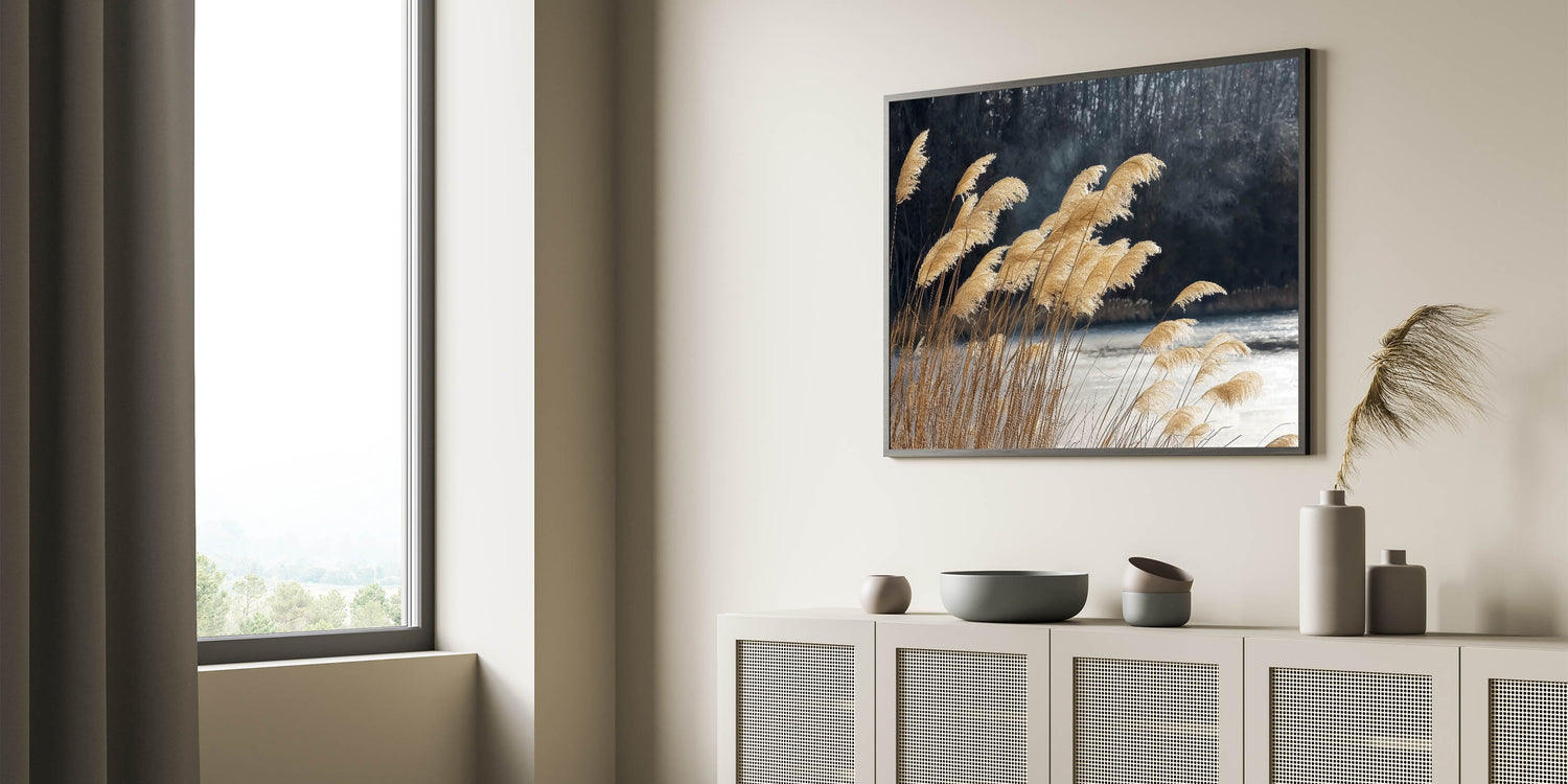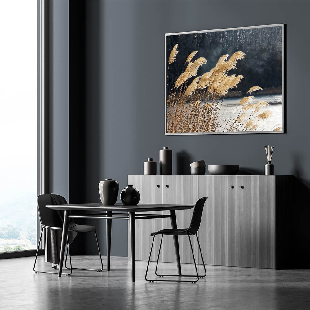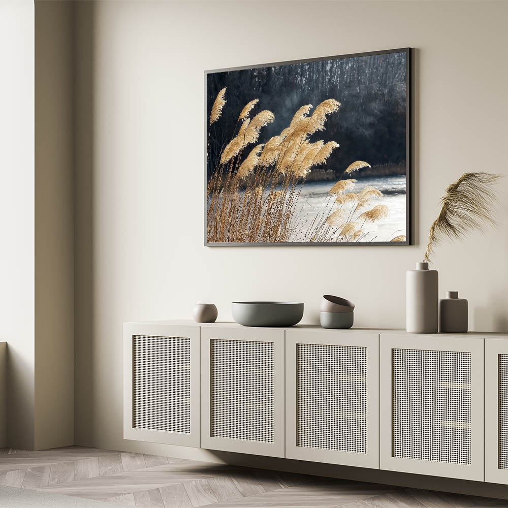 Bring a sense of calm and serenity to your home with this elegant nature-inspired wall art. Featuring a close-up of golden reeds swaying by a tranquil water's edge, this artwork highlights soft beige tones against a cool, muted background. The natural movement and subtle textures make this piece perfect for creating a peaceful ambiance in any room.