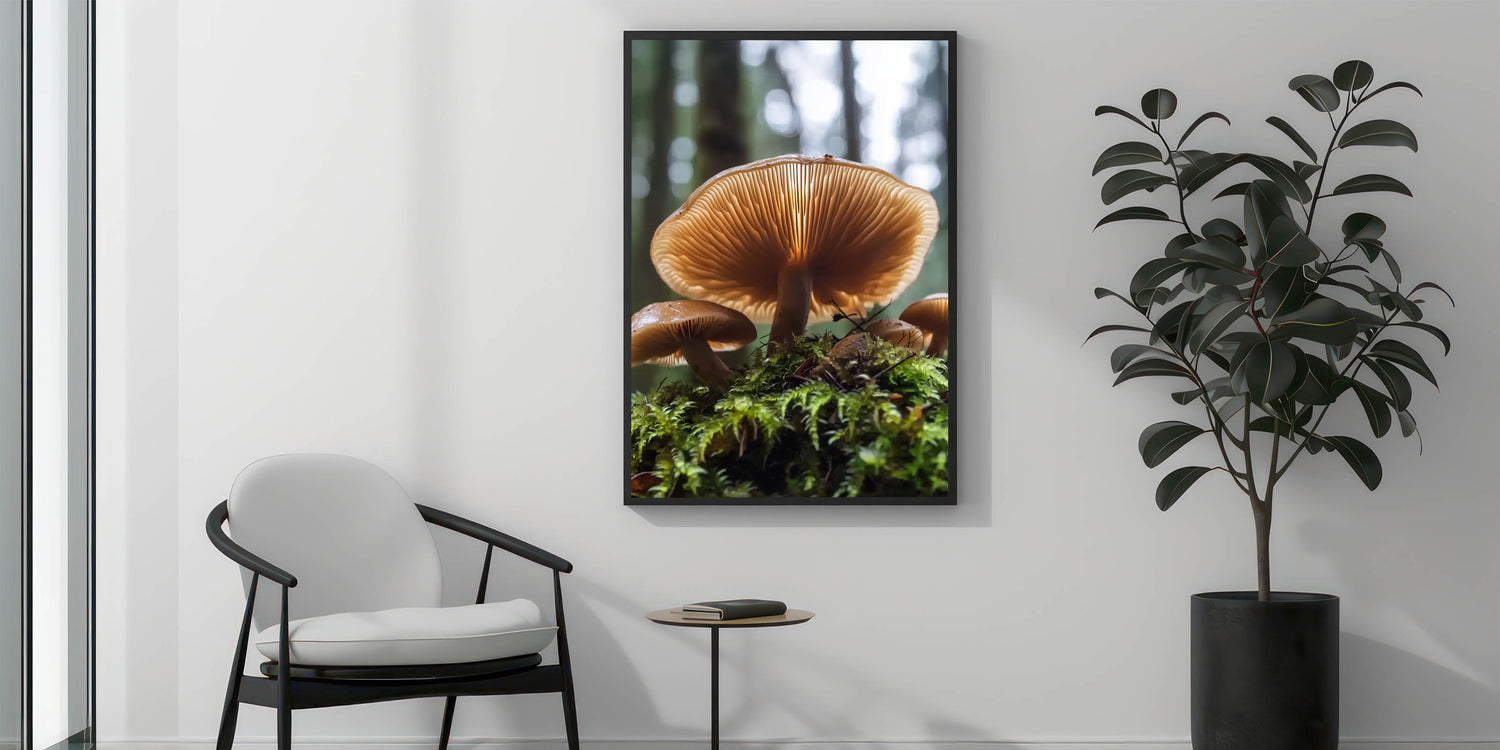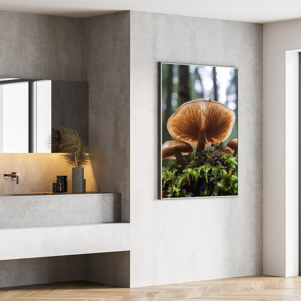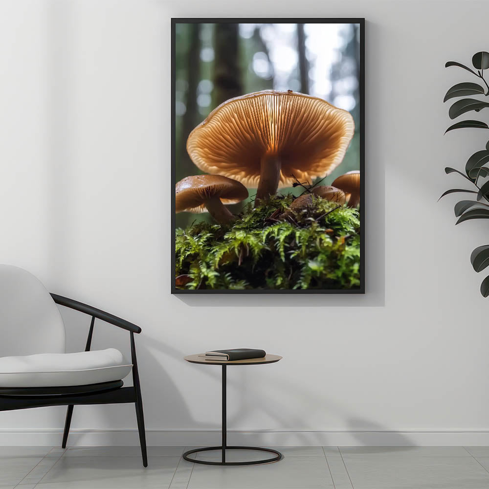 Immerse yourself in the enchanting beauty of the forest with this detailed close-up of mushrooms growing on a mossy floor. The warm tones of the mushroom caps and the intricate gill details, illuminated by soft light, create a mesmerizing and calming effect. This nature-inspired wall art is perfect for those who love organic and earthy decor.