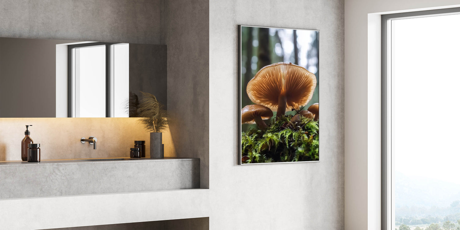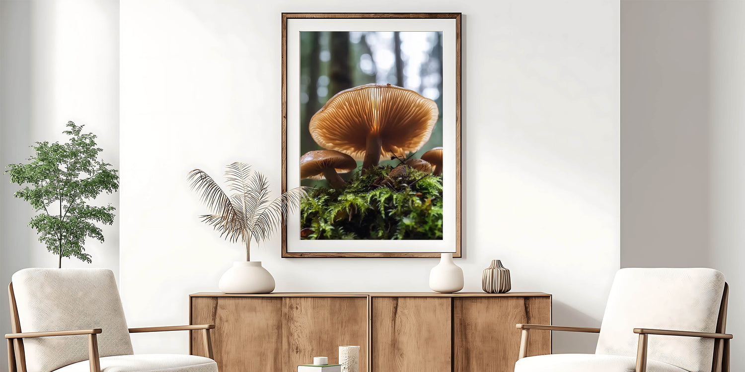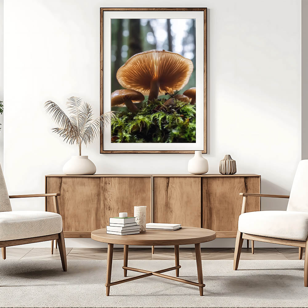 Immerse yourself in the enchanting beauty of the forest with this detailed close-up of mushrooms growing on a mossy floor. The warm tones of the mushroom caps and the intricate gill details, illuminated by soft light, create a mesmerizing and calming effect. This nature-inspired wall art is perfect for those who love organic and earthy decor.
