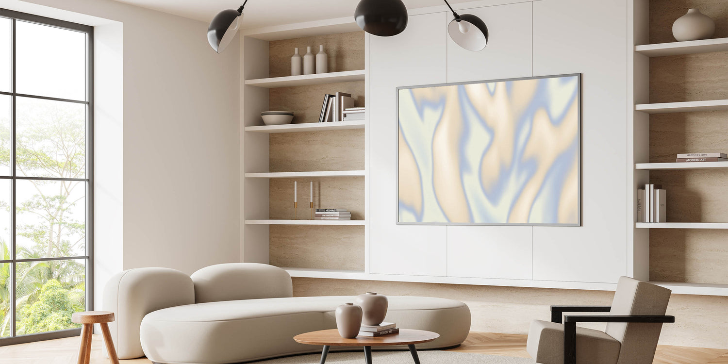 - Nature-inspired design with abstract forms and calming beige and blue hues.