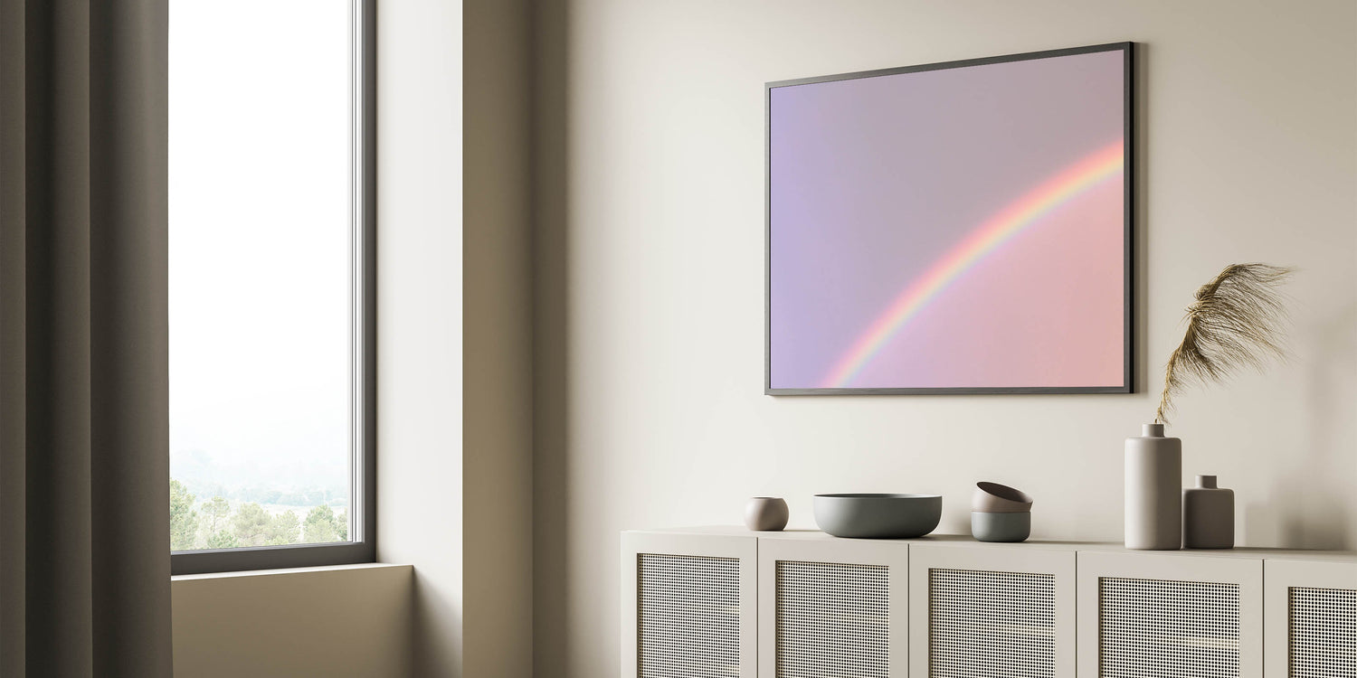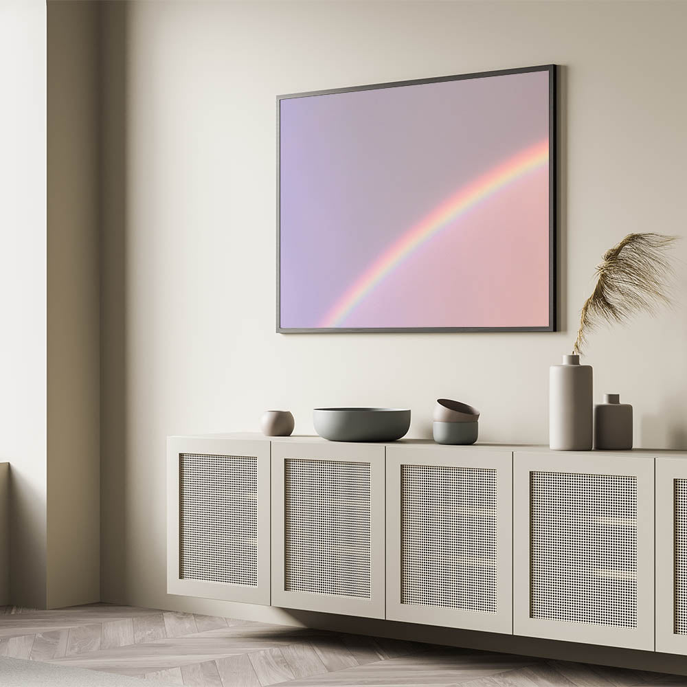Add a touch of vibrant beauty to your space with this nature-inspired gradient artwork, featuring a subtle yet striking rainbow arc. The soft pastel tones and grainy texture bring the colors of the natural world into your home in a modern, abstract form. This artwork blends gentle hues to create a calming atmosphere, while the rainbow element adds a pop of color, making it an eye-catching focal point.