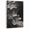 Capture the serene elegance of nature with this monochrome mushroom macro wall art. This exquisite piece features a detailed closeup of mushrooms, highlighting their delicate gills and intricate structures. The grayscale palette emphasizes the fine textures and contrasts beautifully with the dark, shadowed background, creating a timeless and sophisticated look.