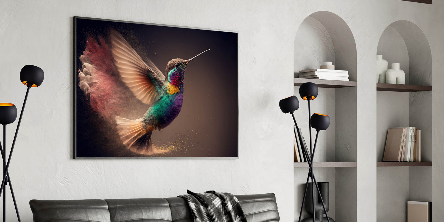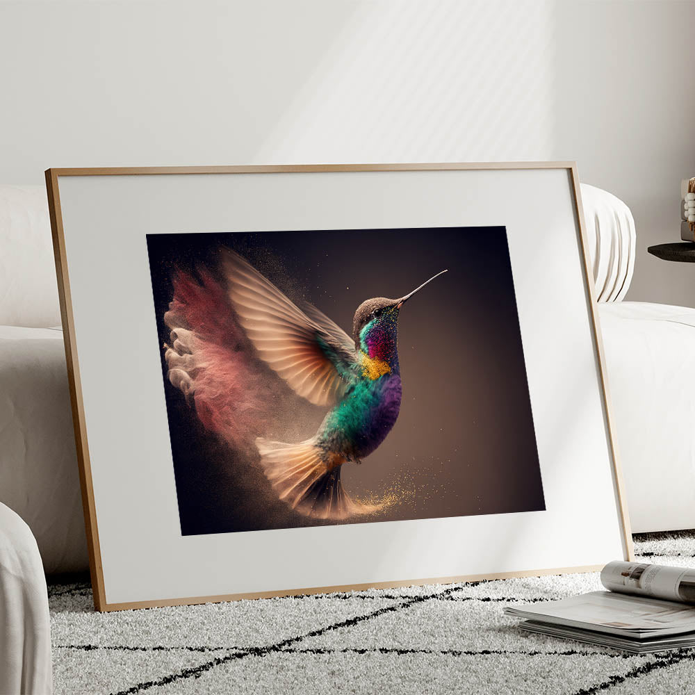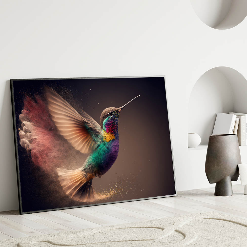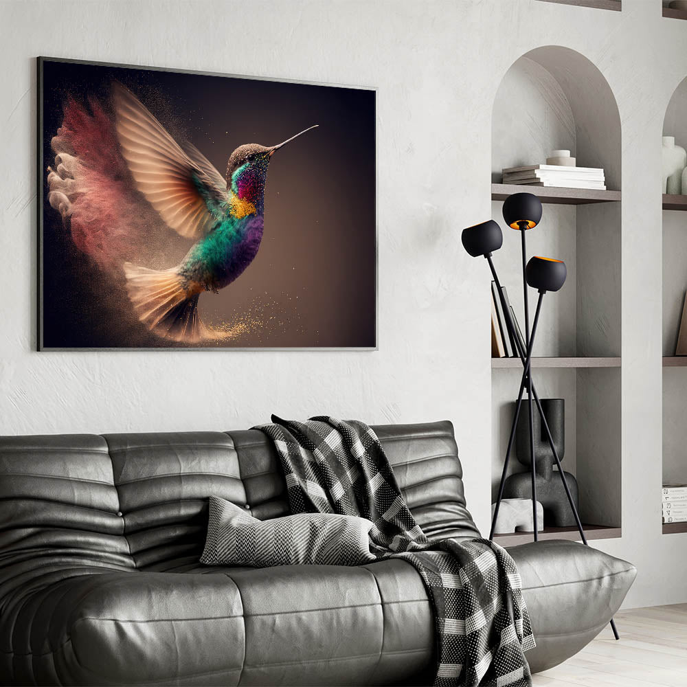 Add a burst of energy and color to your home with this Dynamic Hummingbird Wall Art. This striking piece features a hummingbird in motion, its vibrant feathers creating a stunning contrast against the dark background. The dynamic movement and vivid colors of this Hummingbird Canvas make it an eye-catching focal point in any room, perfect for those who appreciate the beauty of nature with a modern twist.