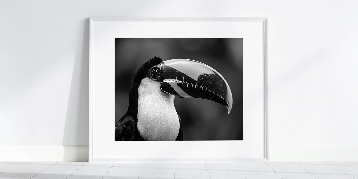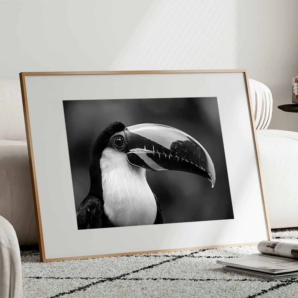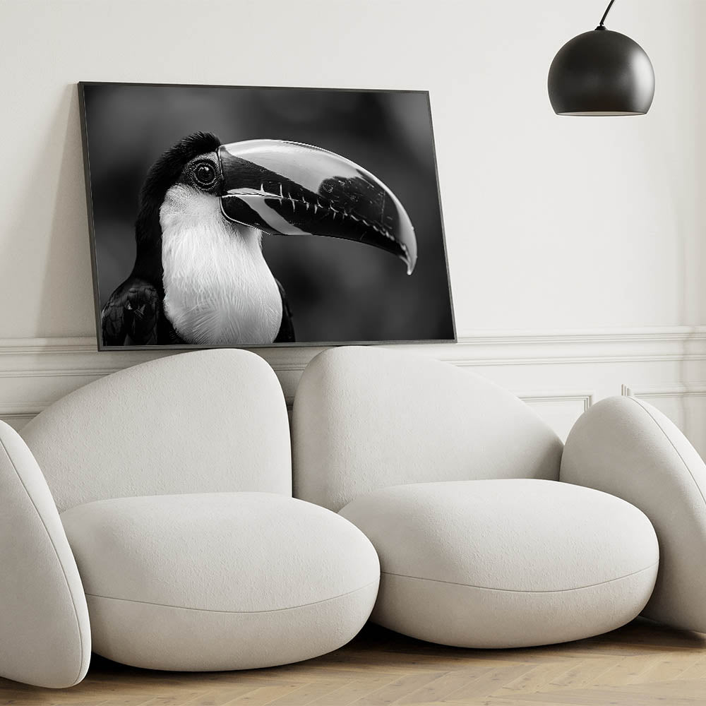 Add a touch of sophistication to your decor with this stunning monochrome Tropical Bird wall art, featuring an elegant black-and-white portrait of a toucan. The minimalistic design captures the bird's striking features, making it a perfect choice for modern interiors. This artwork brings a sense of calm and refinement to any space, whether you choose it as a stretched canvas, framed print, or acrylic glass option.