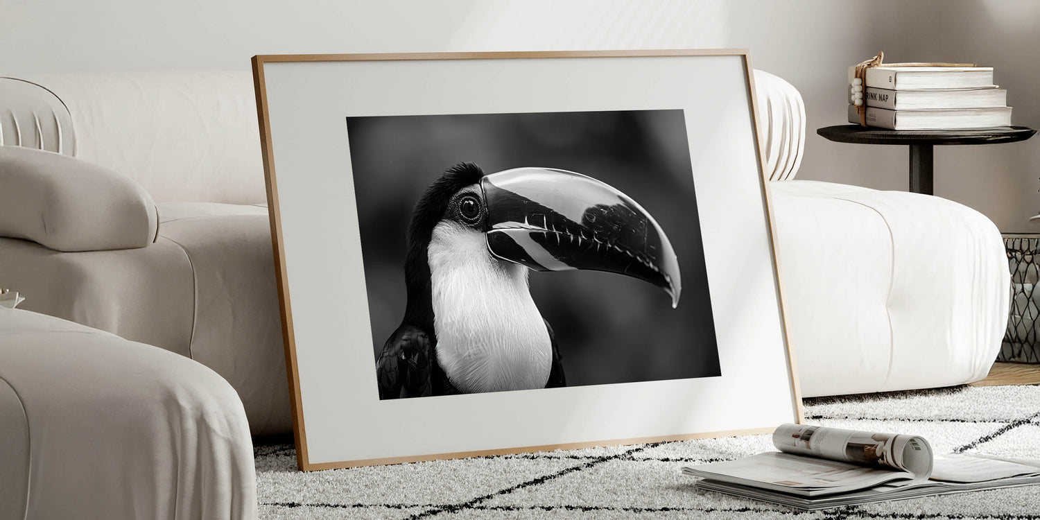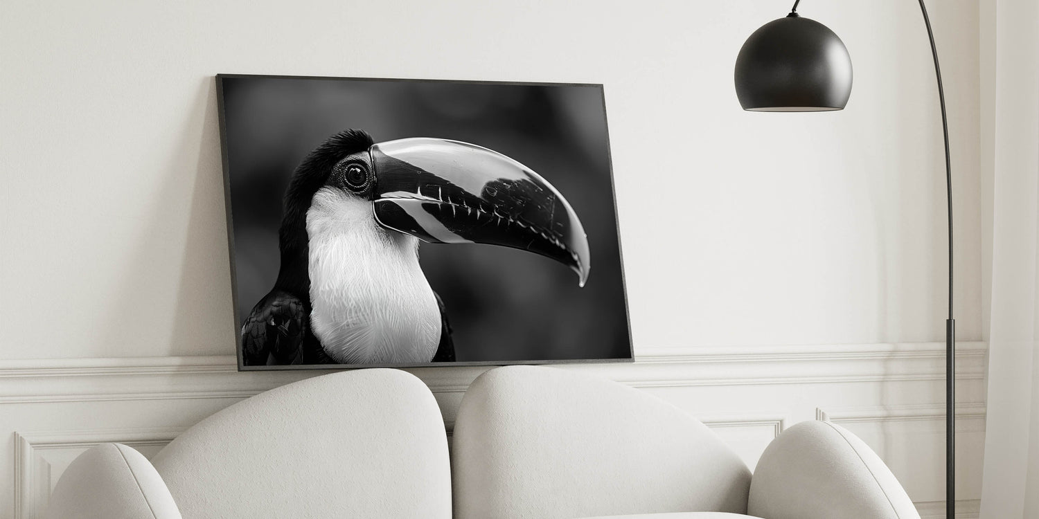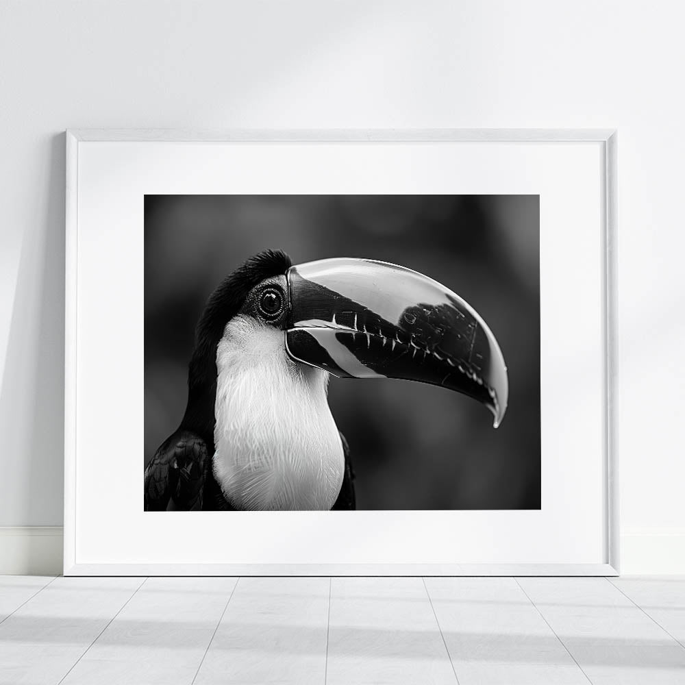 Add a touch of sophistication to your decor with this stunning monochrome Tropical Bird wall art, featuring an elegant black-and-white portrait of a toucan. The minimalistic design captures the bird's striking features, making it a perfect choice for modern interiors. This artwork brings a sense of calm and refinement to any space, whether you choose it as a stretched canvas, framed print, or acrylic glass option.