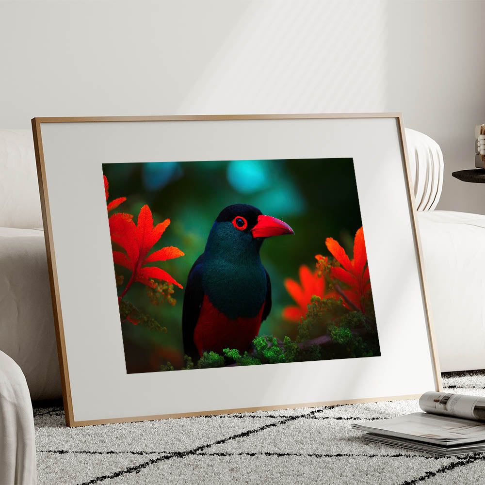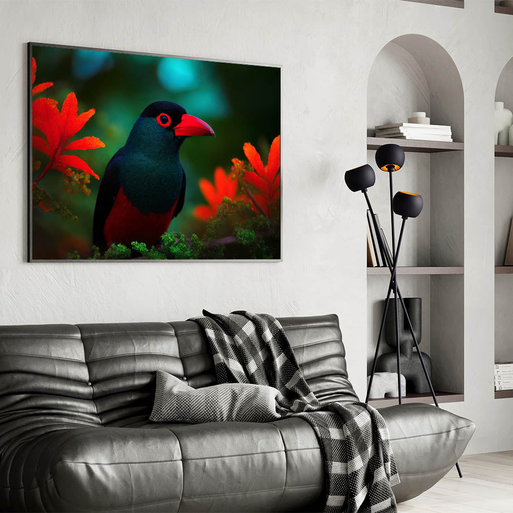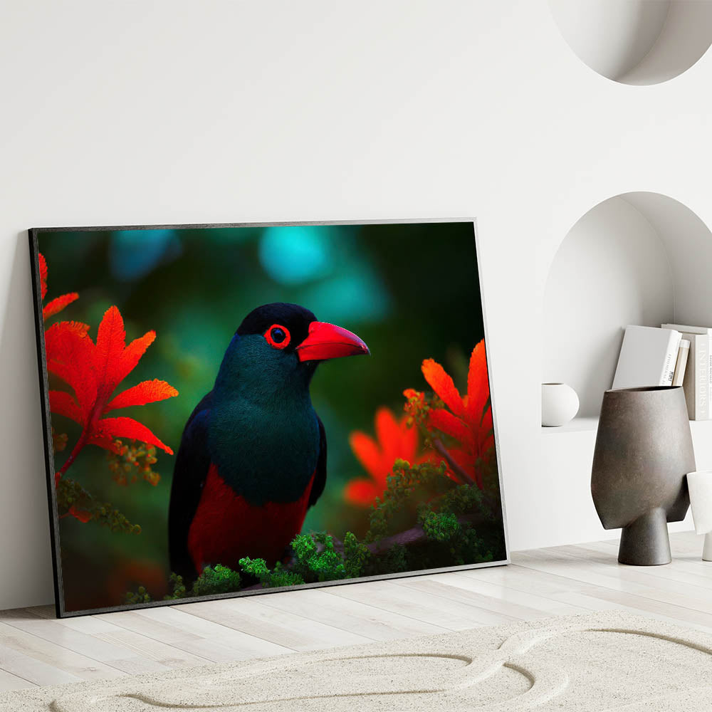 Elevate your space with the dramatic beauty of this Striking Tropical Bird Wall Art. This artwork features a stunning tropical bird with deep green and vibrant red plumage, set against a lush, dark background. The intense colors and sharp contrasts create a captivating piece that instantly draws the eye, making it a perfect focal point for any room.