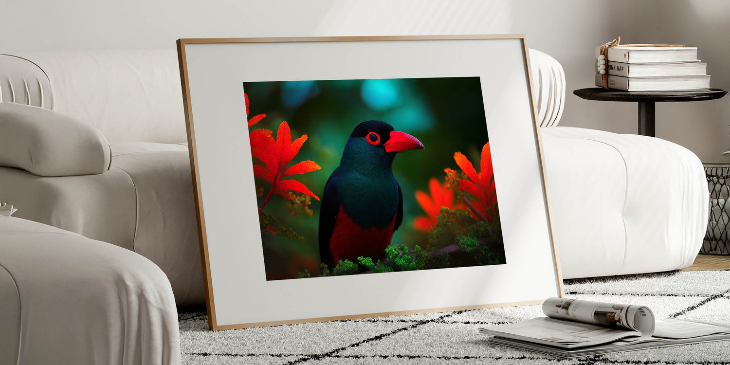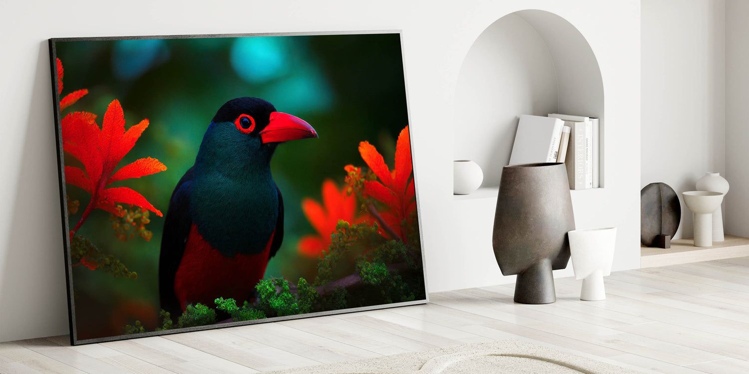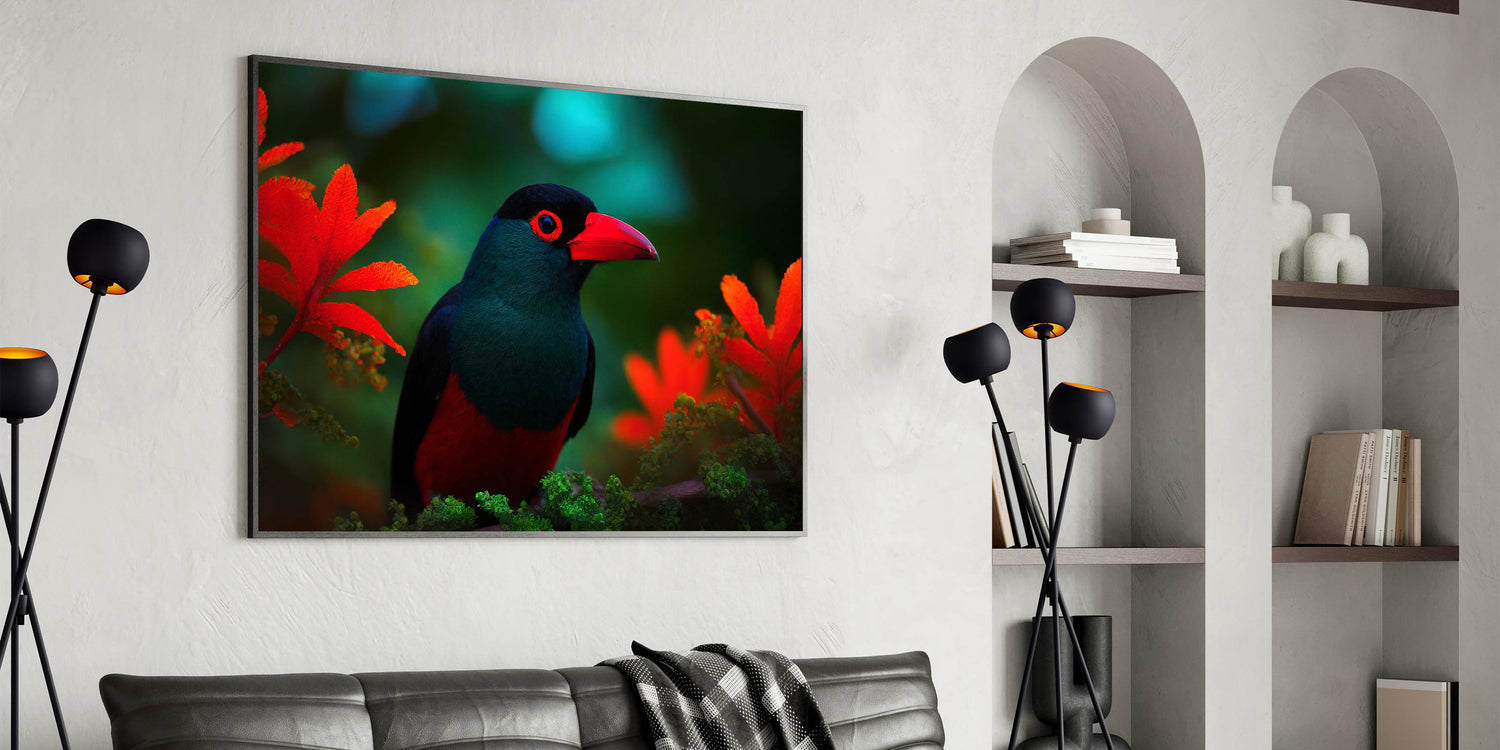 Elevate your space with the dramatic beauty of this Striking Tropical Bird Wall Art. This artwork features a stunning tropical bird with deep green and vibrant red plumage, set against a lush, dark background. The intense colors and sharp contrasts create a captivating piece that instantly draws the eye, making it a perfect focal point for any room.