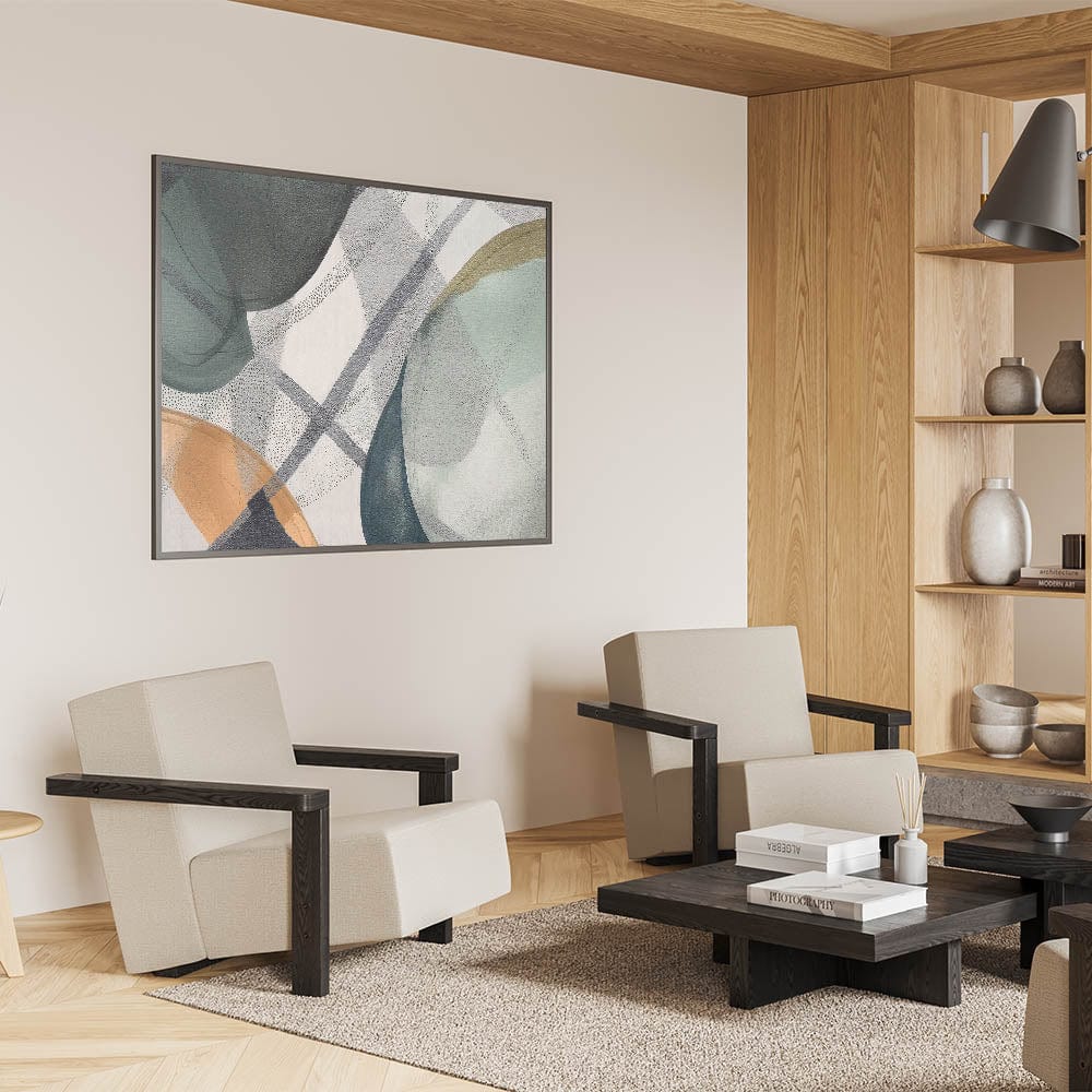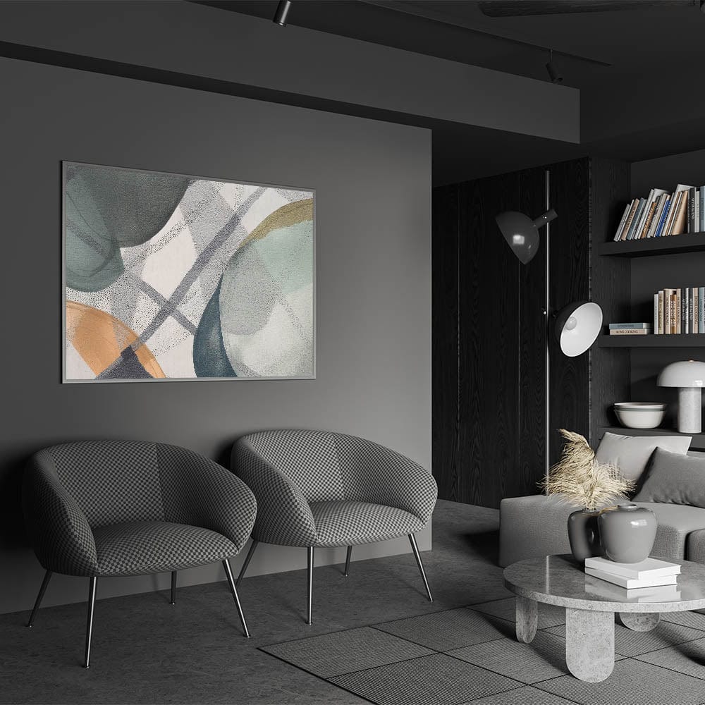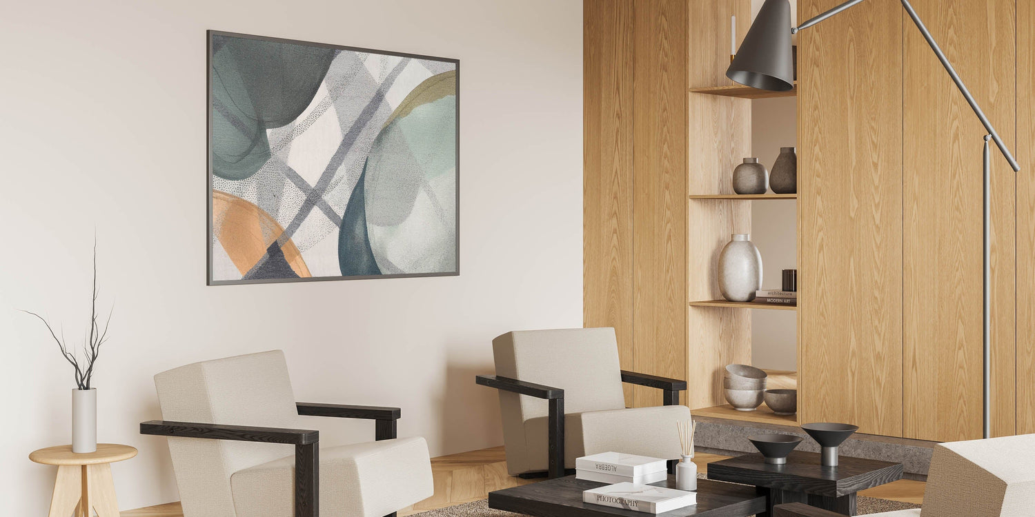 Add a touch of modern sophistication to your space with this abstract canvas wall art, a perfect blend of contemporary abstract art and subtle elegance. Featuring soft shades of green, beige, and gray, this moody modern wall art combines organic shapes with geometric details to create a balanced and harmonious composition. The delicate layering of translucent hues adds depth, making it an ideal choice for those who appreciate large abstract wall art with a minimalist and modern appeal.