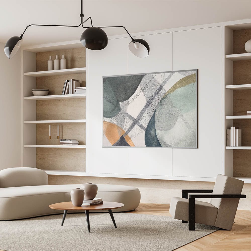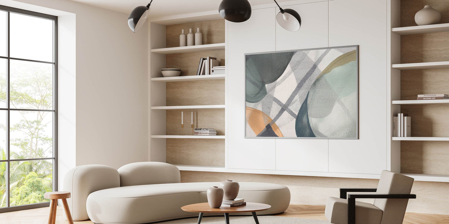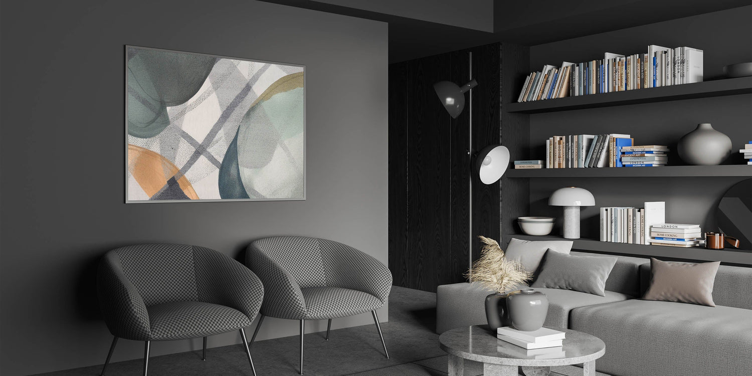 Add a touch of modern sophistication to your space with this abstract canvas wall art, a perfect blend of contemporary abstract art and subtle elegance. Featuring soft shades of green, beige, and gray, this moody modern wall art combines organic shapes with geometric details to create a balanced and harmonious composition. The delicate layering of translucent hues adds depth, making it an ideal choice for those who appreciate large abstract wall art with a minimalist and modern appeal.