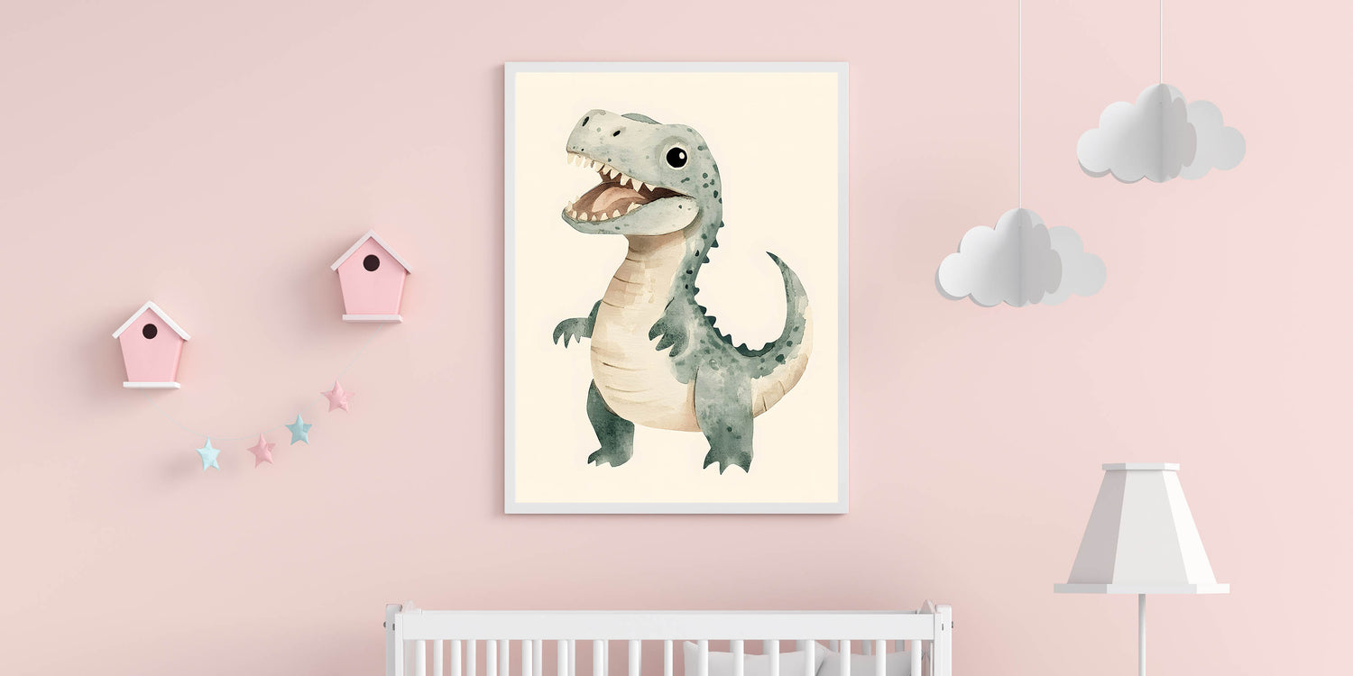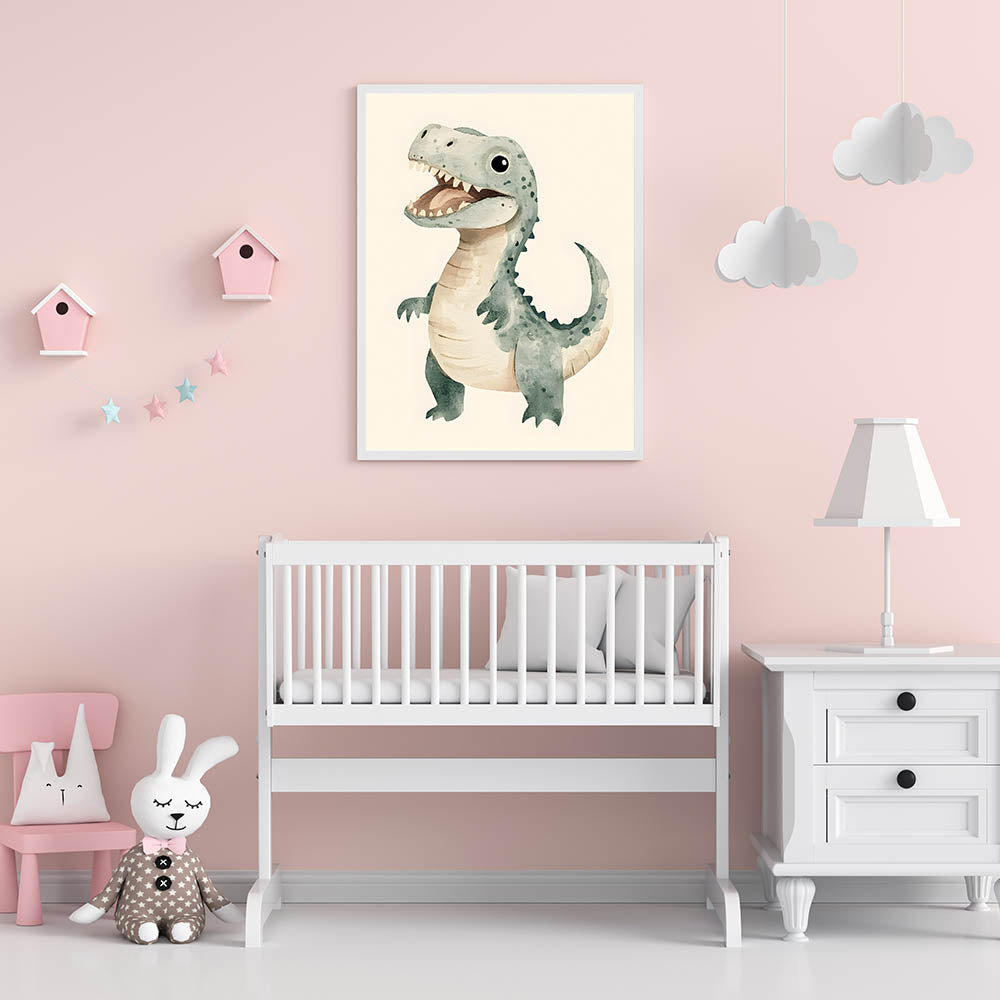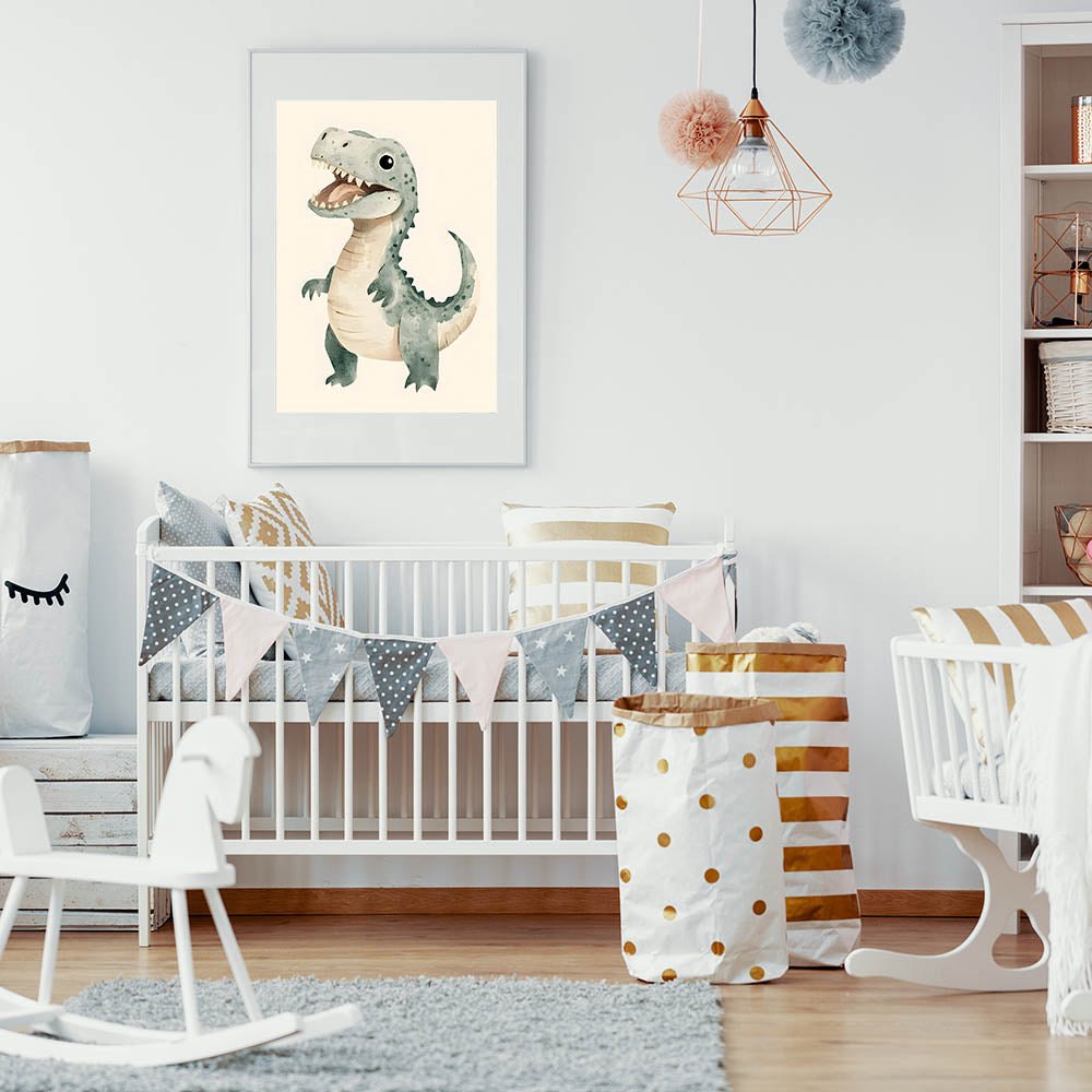 Transform your child's space with this charming dinosaur nursery wall art. This delightful watercolor artwork brings warmth and joy to any baby room decor, making it the perfect addition to a playful and imaginative space.