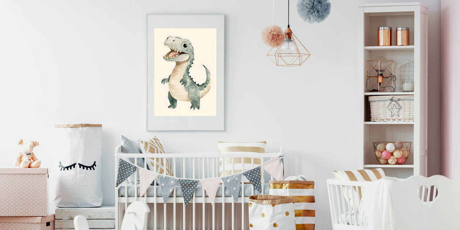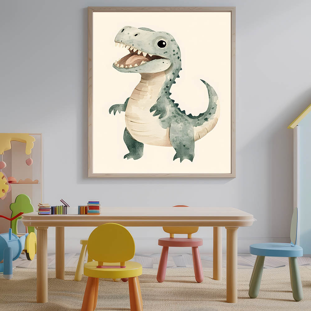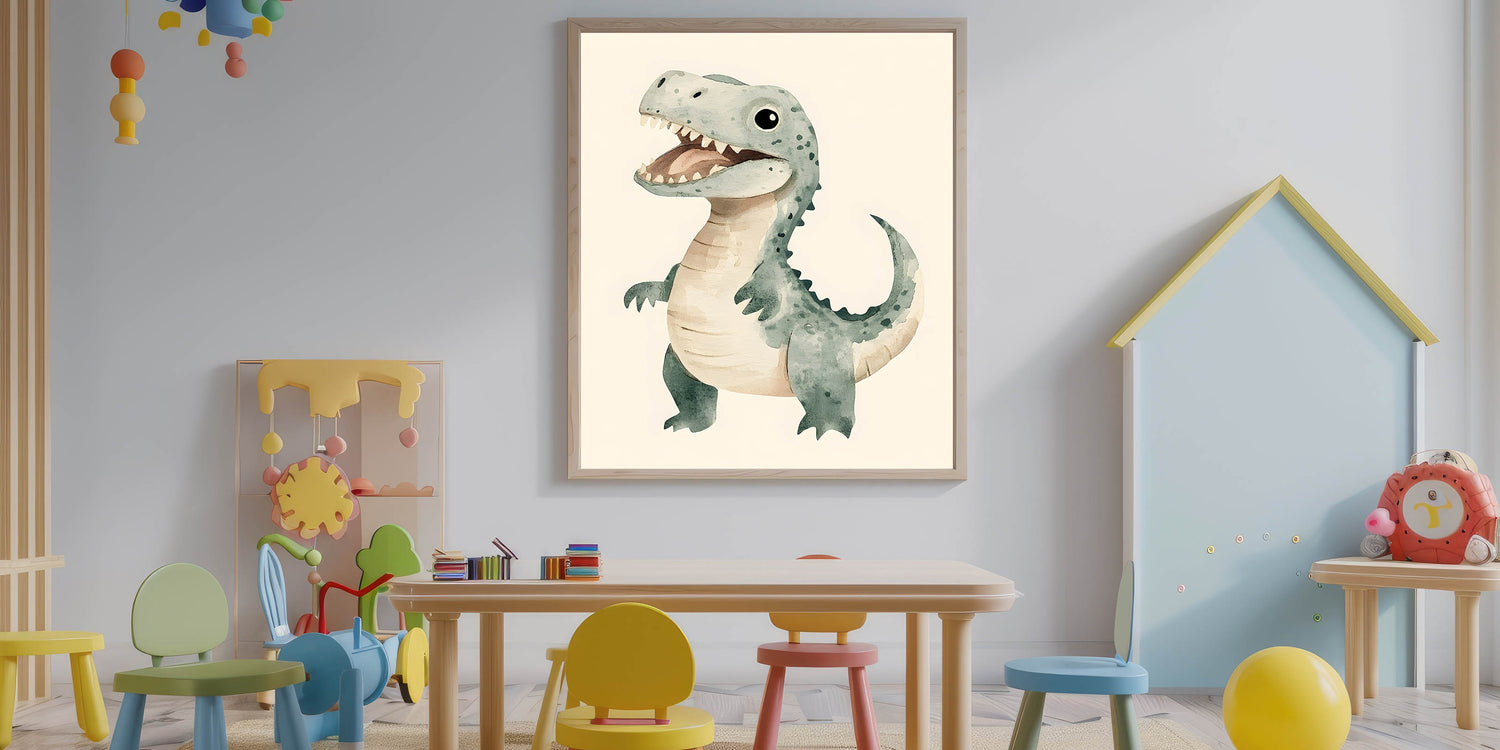 Transform your child's space with this charming dinosaur nursery wall art. This delightful watercolor artwork brings warmth and joy to any baby room decor, making it the perfect addition to a playful and imaginative space.