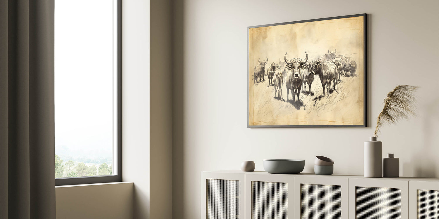• Handcrafted Animal Illustrations: An intricately detailed sketch of a cow herd, capturing the calm and peaceful nature of farm life.