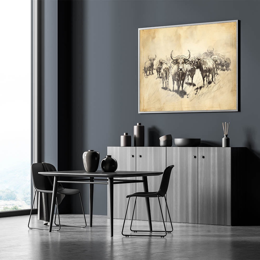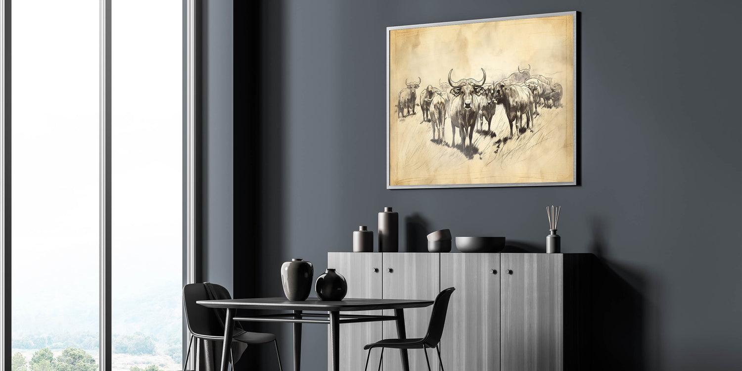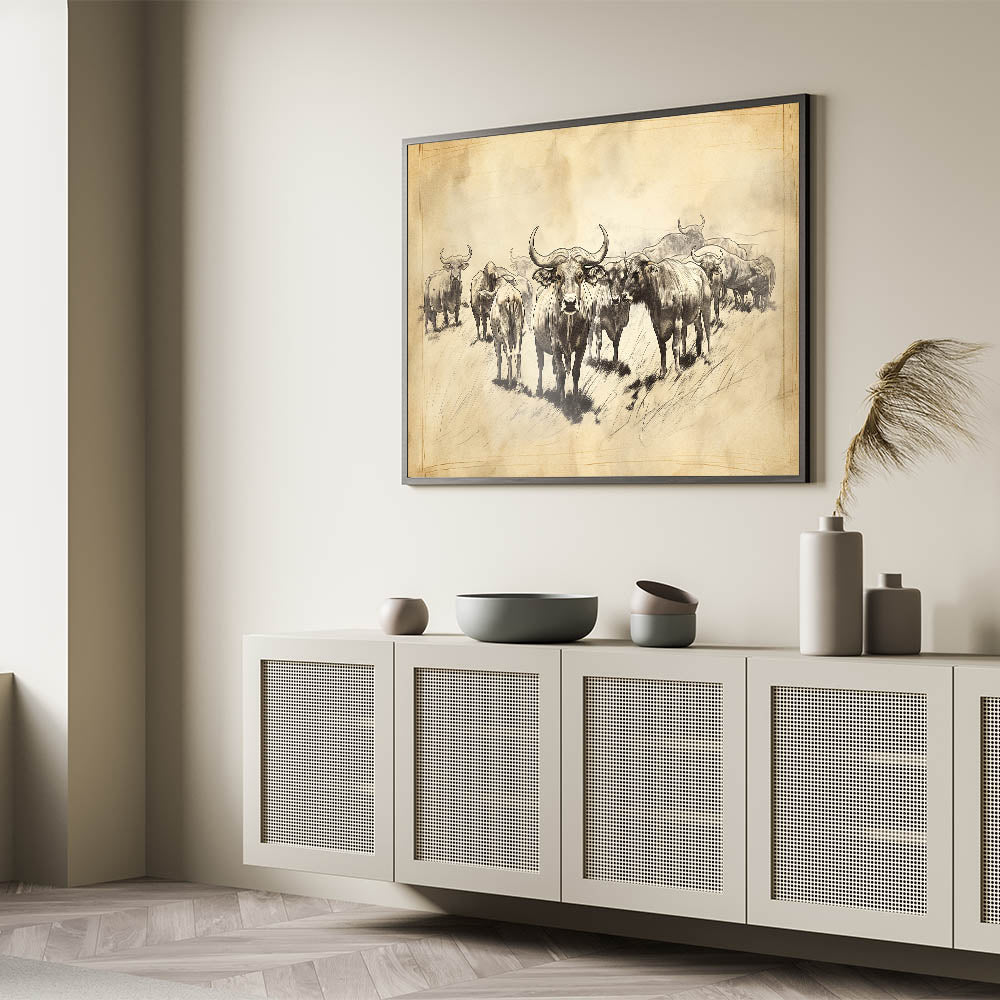 This cow herd illustration will make a beautiful addition to your farmhouse, living room, or any animal-themed space. Bring the calm of the countryside to your walls with this charming piece of art.